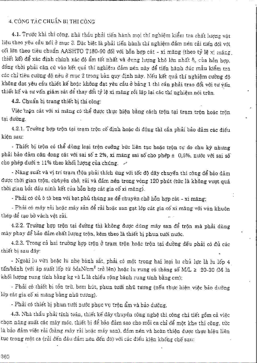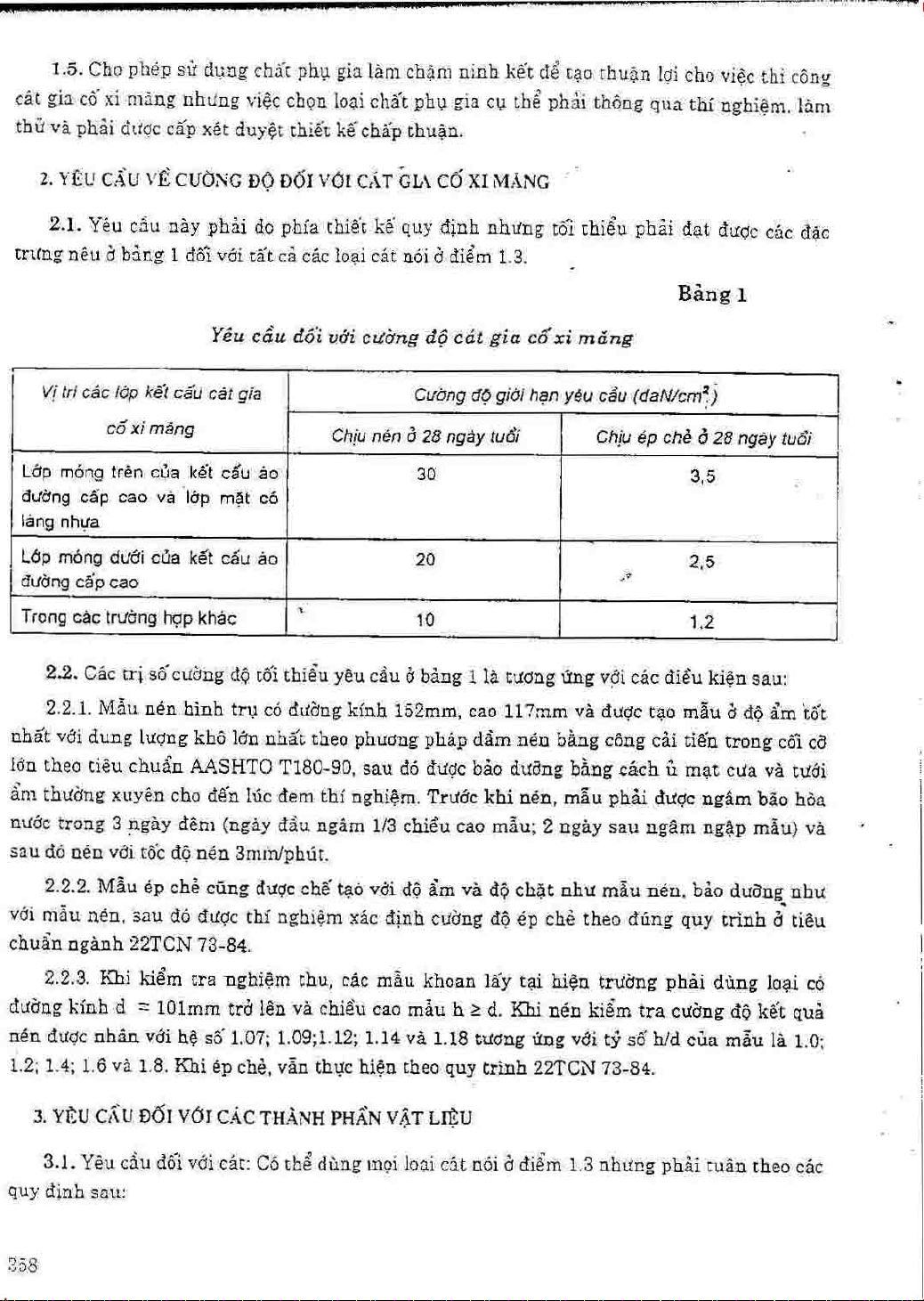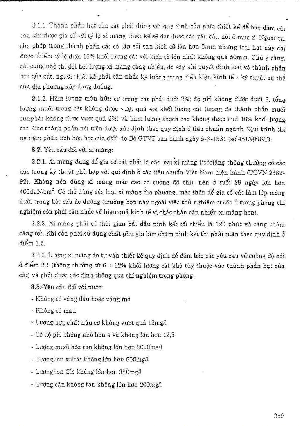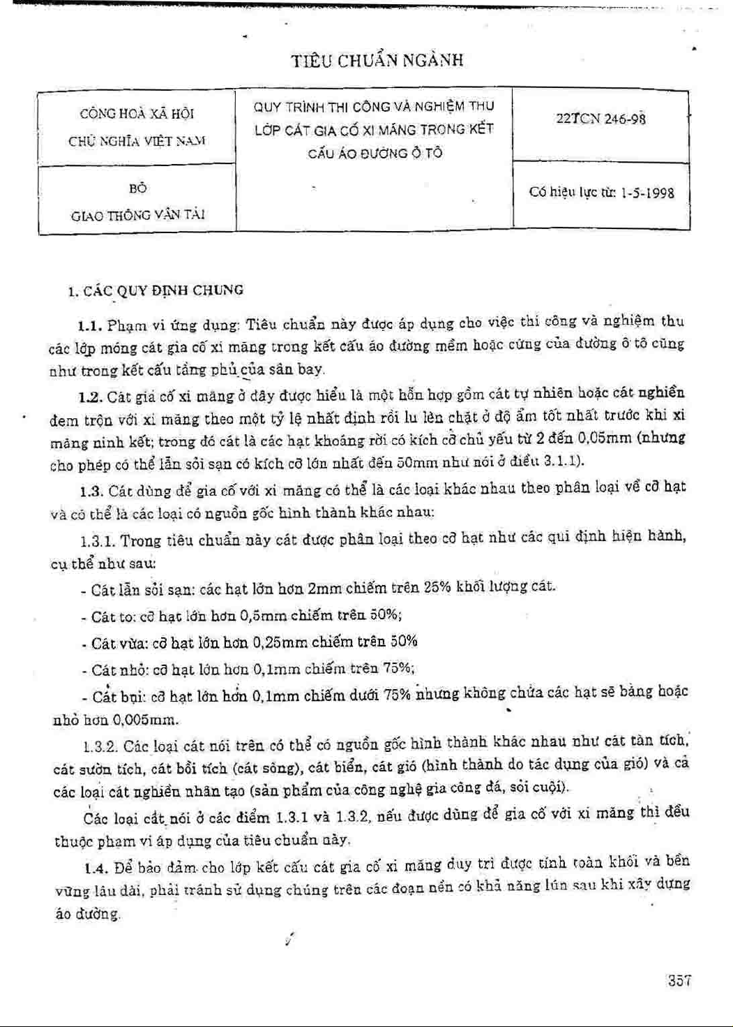 22 TCN 246-98. Quy trình thi công và nghiệm thu lớp cát gia cố xi măng trong kết cấu áo đường ô tô. Tiêu chuẩn này được áp dụng cho việc thi công và nghiệm thu các lớp móng cát gia cố xi măng trong kết cấu áo đường mềm hoặc cứng của đường ô tô cũng như trong kết cấu tầng phủ của sân bay. Cát gia cố xi măng ở đây được hiểu là một hỗn hợp gồm cát tự nhiên hoặc cát nghiền đem trộn với xi măng theo một tỷ lệ nhất định rồi lu lèn...
