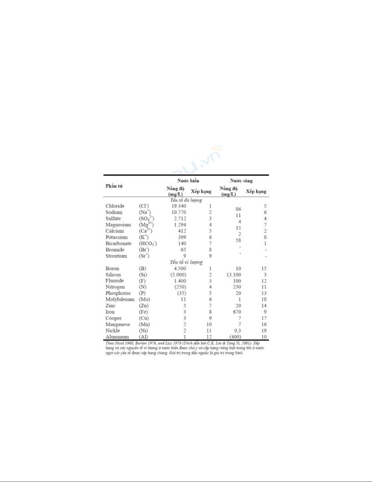 Bảng. Thành phần các phần tử hòa tan trong nước biển và nước sông trên thế giới