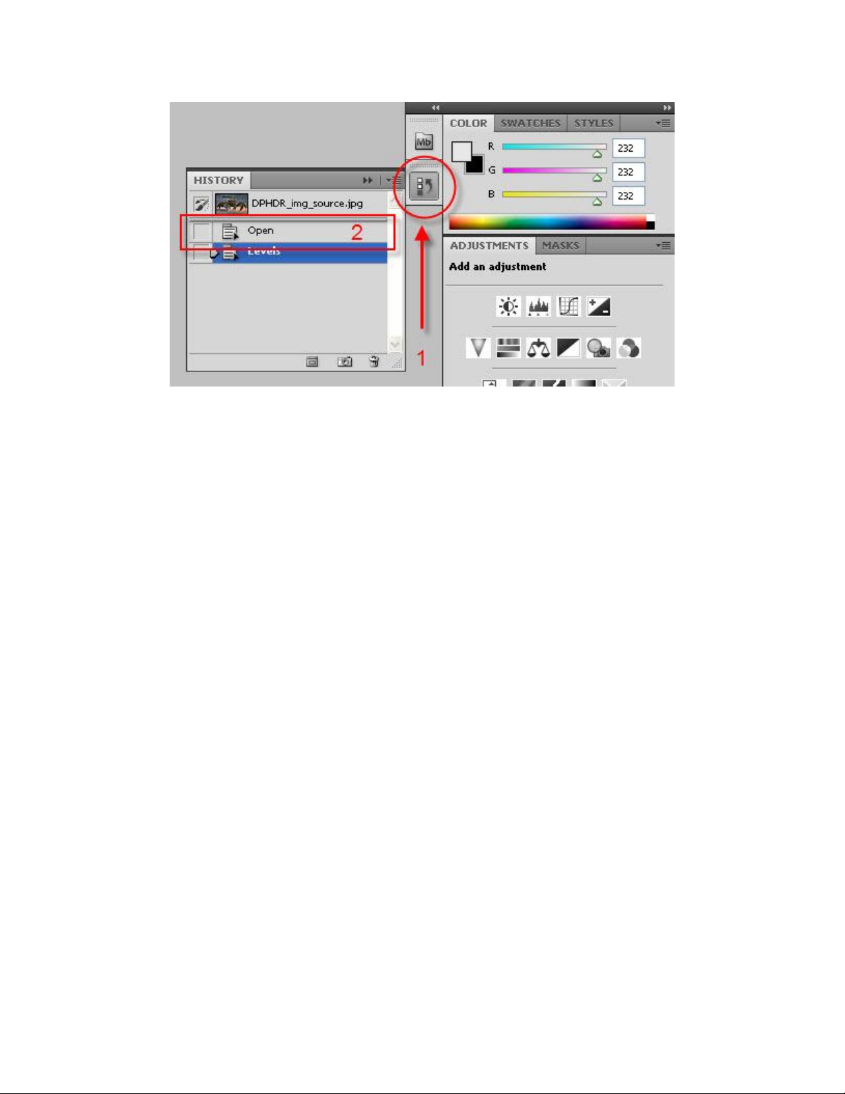 Bước 5: Bấm nút History, chọn dòng Open để lấy lại ảnh gốc. Vào menu File >