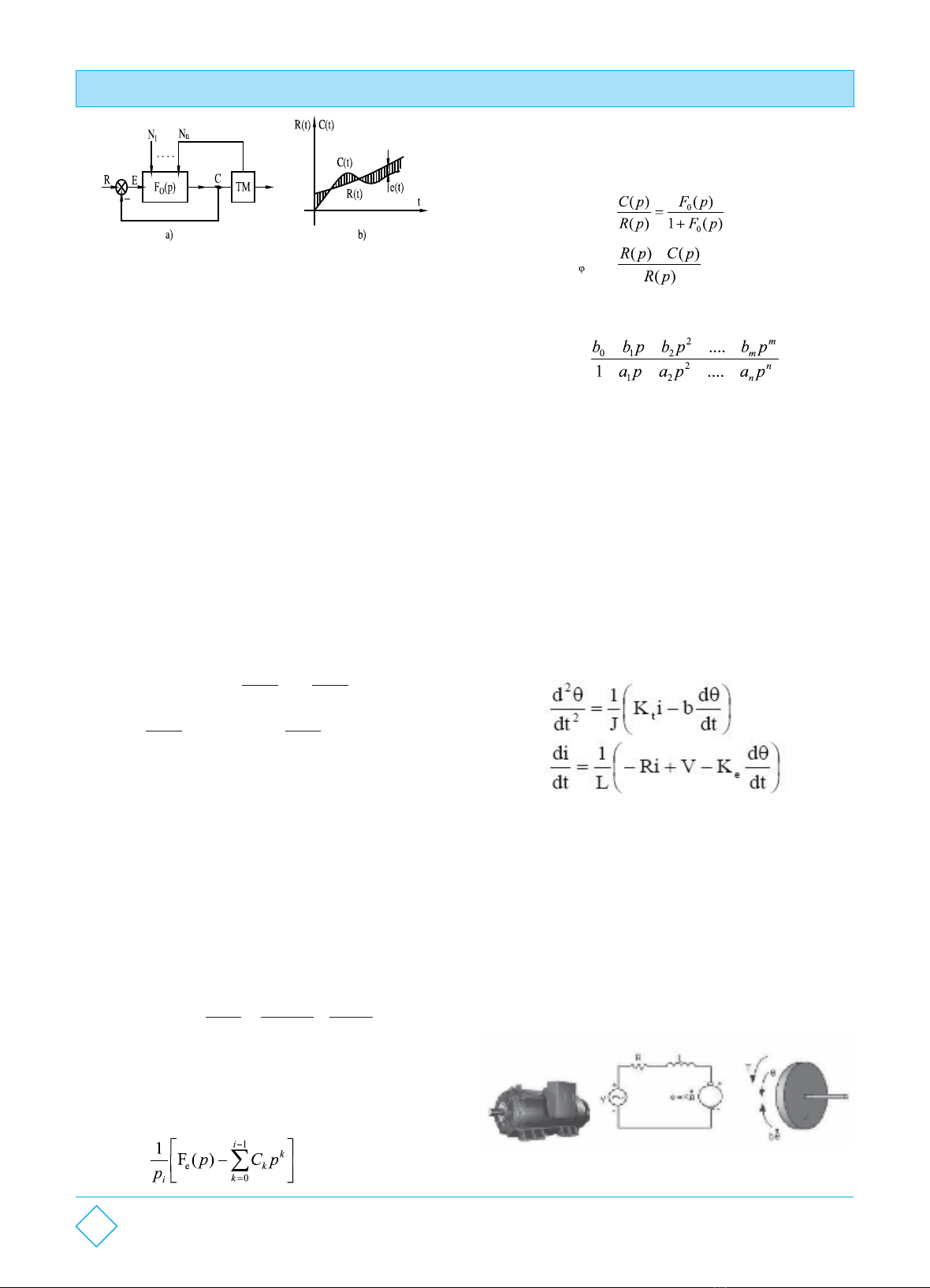 34Số 3/2024TẠP CHÍ ĐẠI HỌC HẢI DƯƠNGHình 4: a) Sơ đồ khối, b) Các đặc tính quá độF (p) - hàm truyền mạch hở;0TM - thiết bị công nghệ;R, r(t) - tín hiệu điều khiển;C, c(t) - tín hiệu ra;e= R - C - sai lệch điều chỉnh;N - các nhiễu loạn.iC(p) = F(p).R(p) + F(p)= F(p) - hàm truyền đối với các nhiễu loạn.Các thành phần quá độ của C(t) phụ thuộc vào đặc tính của mạch vòng điều chỉnh, vào tín hiệu điều khiển. Là nghiệm của các phương trình vi phân không thuần nhất. Thành phần nghiệm riêng của C(t) theo R(t) sẽ chép lại R(t) với độ chính xác nào đó. Thành phần của C(t) theo nhiễu loạn N(t) phải càng nhỏ càng tốt.iSai lệch điều chỉnh e(t) = R(t) - C(t) có thể viết dạng chuỗi hàm:å)()(pNpFii)(1)(00pFpF+ e(t)=CR(t)+C01 + C+ C2 idR(t)2dR(t)dt2dtid R(t)id N (t)nidt idt +..............+C+K(t)iNn Như vậy nếu biết trước R(t) và các nhiễu N(t) và bỏ qua ithặng dư K(t) thì ta có thể xác định được sai lệch e(t) nếu tính toán được các hằng số C . Các hằng số C - là các hệ số sai lệch:iiC - hệ số sai lệch vị trí; 0C - hệ số sai lệch tốc độ; l2 C- hệ số sai lệch gia tốc.Một hệ thống chính xác tuyệt đối là hệ có mọi hệ số sai lệch đều bằng không.Hàm truyền của hệ thống trên hình l-3a đối với sai lệch là [3]:Cũng có thể tính được các hệ số sai lệch với tín hiệu điều khiển nhờ hàm truyền của hệ thống đối với tín hiệu điều khiển:F(p) = = e=F (p)0F (p)0M (p)R(p)1 + R(p)N (p)Nếu đem chia đa thức M(p) cho đa thức N(p) thì ta có: 2iF(p) = (C + C P + C p + ... + Cp)R(p).e012iTừ đó suy ra cách tính các hệ số sai lệch điều chỉnh:C =lim{Fe(p)} khi p g 00C =lim{ } khi p g 00F(p) = F (p) = = 1-F(p)Có thể viết hàm truyền ở dạng tỉ số các đa thức:F(p)=++++++++Sử dụng công thức (l-4) ta suy ra cách tính các hệ số sai lệch như sau:C1-b0=0C=a-Ca-b,11011C=a-Ca-Ca-b,2211022C=a-Ca-b-ii0iiåCayi-yi-1................................y=1Nếu hệ thống có b = 1, b =a .... b = a .... b = a thì tất 011iimmcả các hệ số sai lệch sẽ bằng không.- Xây dựng mô hình hệ thống điều khiển vị trí motor DC cho bởi phương trình vi phân sau [1] [2]:Trong đó:22 J = 0.01 Kgm /slà moment quán tín của rotor b = 0.1 Mms là hệ số ma sát các bộ phận cơ khí K = K= K = 0.01 Nm/A là hằng số sức điện động e t R = 10 ohm là điện trở dây quấn L = 0.5 H là hệ số tự cảm V là điện áp đặt lên cuộn dây của motor θ là vị trí trục quay (ngõ ra của mô hình) i là dòng điện chạy trong cuộn dây của motor.Hình 5. Mô hình toán hệ điều khiển vị trí motor DC