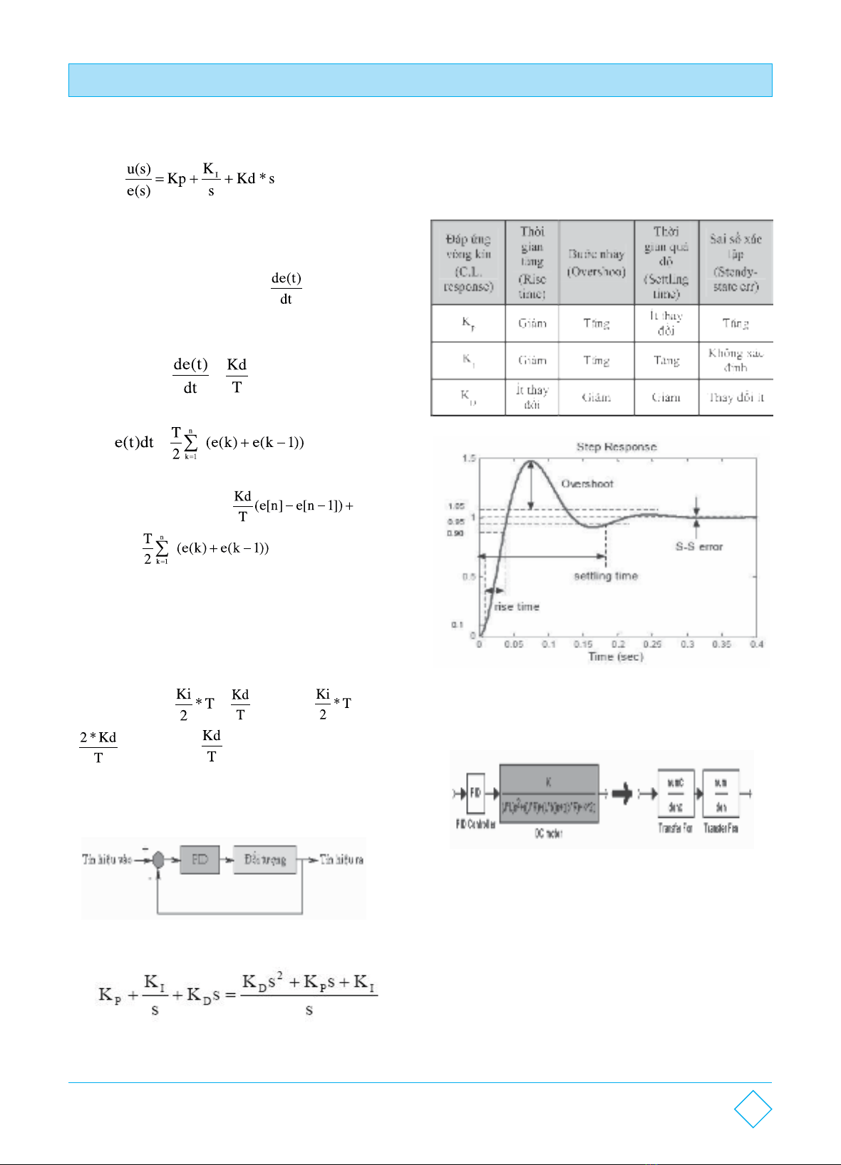 35Số 3/2024TẠP CHÍ ĐẠI HỌC HẢI DƯƠNG- Thuật toán hiệu chỉnh PIDHàm truyền liên tục PID có dạng: H(s)=Klà độ lợi khâu vi phân (Derivative gain) D Việc hiệu chỉnh phù hợp 3 thông số K, Kvà Ksẽ làm PI D tăng chất lượng điều khiển. Ảnh hưởng của 3 thông số này lên hệ thống như sau:Trong đó u: ngõ ra,e ngõ vào của bộ hiệu chỉnhThuật toán PID có thể nhận được khi sai phân hàm truyền trên, tương ứng phương trình vi tích phân sau:Kp*e(t)+Kiòe(t)dt+Kd* =u(t)*KGián đoạn hoá:Khâu vi phân (dùng định nghĩa sai phân):Kd* = *(e[n]-e[n-1])Suy ra:Khâu tích phân (theo nguyên tắc hình thang):ò=với e(0)=0u[n]*K=Kp*e[n]+ với e(0)=0Thay[n] bằng [n-1] và trừ vào phương trình trên nhận được công thức cho phép chúng ta tính u[n] từ u[n-1] và các giá trị liên tiếp của e[n] như sau:u[n]-u[n-1]=( A*e[n]+A*e[n-1]+A*e[n-2] )/Ku[n]=u[n-1]+( A*e[n]+A*e[n-1]+A*e[n-2] )/K012012