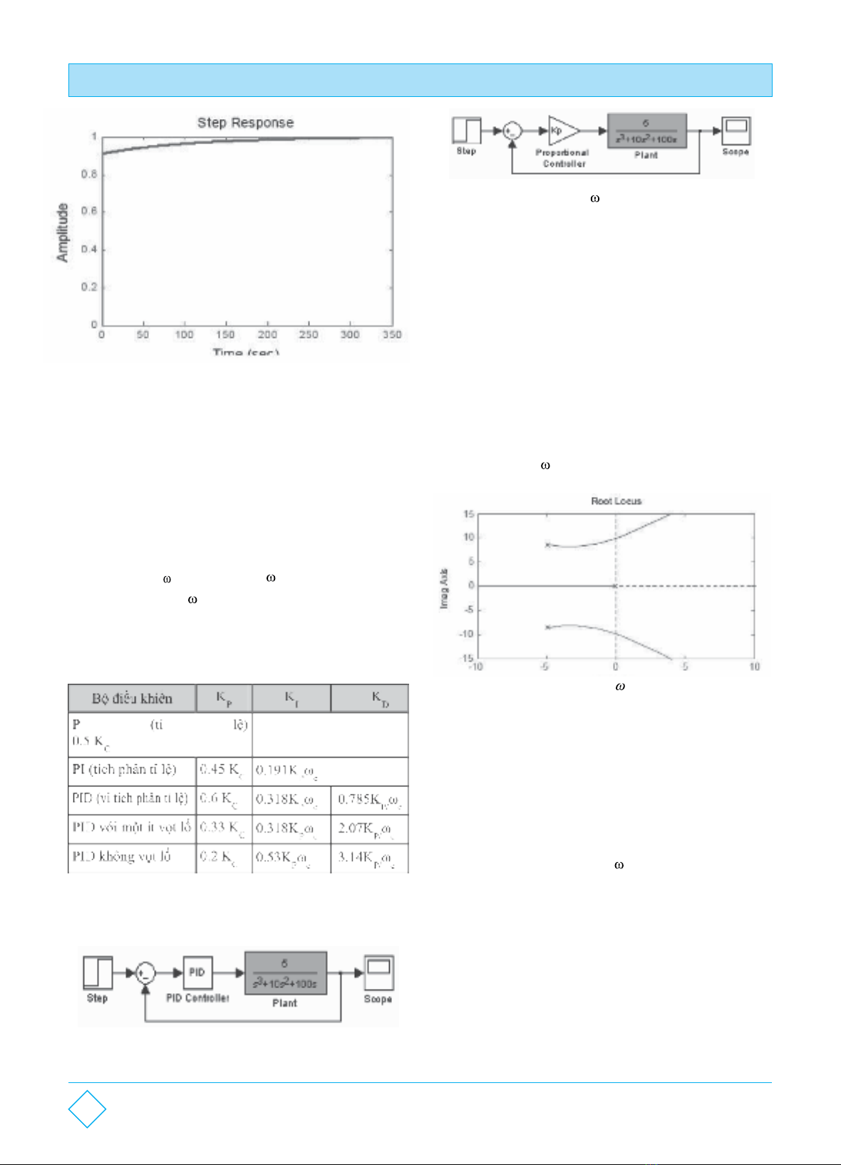 36Số 3/2024TẠP CHÍ ĐẠI HỌC HẢI DƯƠNGMột phương pháp cổ điển nhưng đơn giản và hiệu quả để chỉnh định 3 thông số K, Kvà Kcủa bộ điều khiển PID là PI D phương pháp Ziegler-Nichols (Ziegler Nichols Tuning Method). Thủ tục chỉnh định như sau: 1. Chỉ điều khiển hệ thống bằng bộ điều khiển tỉ lệ K(đặt P K=K=0). ID2. Tăng Kđến giá trị Kmà ở đó hệ thống bắt đầu bất ổn P C (bắt đầu xuất hiện sự giao động - điểm cực của hàm truyền kín nằm trên trục ảo j ). Xác định tần số của giao động vừa đạt. c Từ 2 giá trị Kvà vừa đạt, các thông số số K , Kvà KC c PI D được xác định: Hình 8. Hiệu chỉnh thông số của bộ điều khiển PIDGiả sử cần thiết kế bộ điều khiển PID cho hệ thống sau [6]:Bước 1: Điều khiển hệ thống chỉ với bộ điều khiển tỉ lệ:Bước 2: Xác định Kvà mà ở đó hệ thống bắt Bước 2: C c Xác định Kvà mà ở đó hệ thống bắt đầu giao động - dùng C c hàm rlocus của Matlab (nên lưu thành file.m hoặc thao tác trong Matlab Editor sau đó copy và dán vào Workspace cả đoạn lệnh để dễ dàng cho việc hiệu chỉnh các thông số ở phần sau):>>close all >>num=5; >>den=[1 10 100 0]; >>[numc,denc]=cloop(num,den); >>htkin=tf(numc,denc) % ham truyen vong kin >>rlocus(htkin); %ve qui dao nghiem >> axis([-10 10 -15 15]) Xác định Kc và bằng hàm rlocfind: c Nhấp chuột vào điểm giao nhau giữa quĩ đạo nghiệm và trục ảo của đồ thị, trong WorkSpace ta được: Kc = 199.5793 Omegac = -10.0145 0.0072 +10.0072i 0.0072 - 10.0072i Như vậy ta được K=200 và = 10. Suy ra thông số của Cc bộ điều khiển PID: K= 0.6K= 120 P C K = 0.318K= 381.6 I Pc K= 0.785K/= 9.4 D Pc Thử đáp ứng của hệ: >>Kp=120; Ki=381.5; Kd=9.4; >>numc=[Kd, Kp, Ki]; >>denc=[1 0]; % ham truyen cua PID >>[numac,denac]=cloop(conv(num,numc),conv(den,denc)) >>step(numac,denac)Hình 9. Tham số Kc và bộ điều khiển PIDc Bảng 2. Phương pháp Ziegler-Nichols hiệu chỉnh các thông số kỹ thuật bộ điều khiển PID