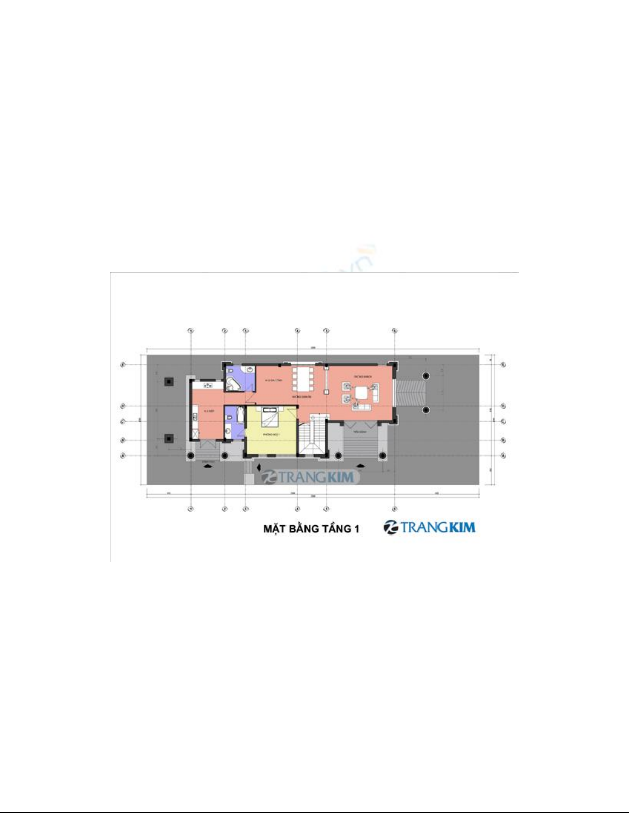 Tầng 1 bố trí phòng khách, bếp nấu, phòng ăn, phòng ngủ, vệ sinh, cầu thang.