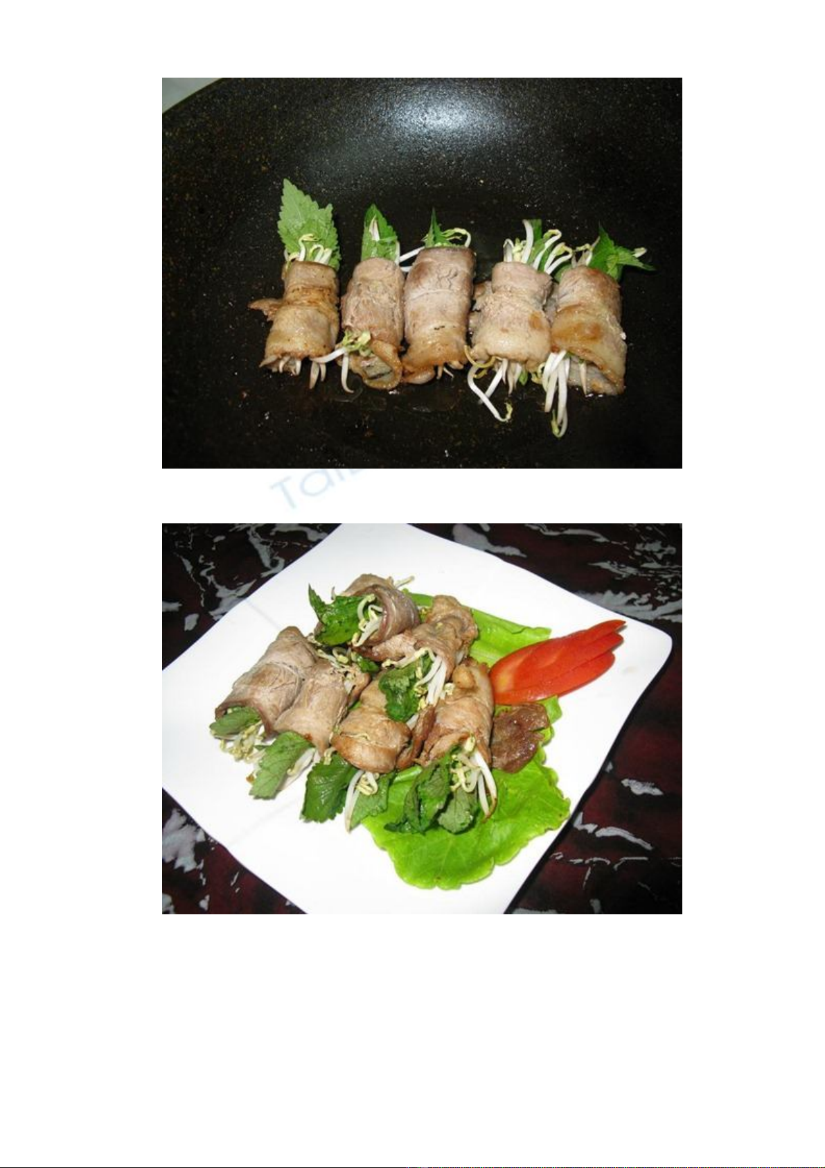 Cuộn thịt ba chỉ với giá đỗ và kinh giới: Cho một miếng thịt vào đĩa, cho giá và một ngọn
