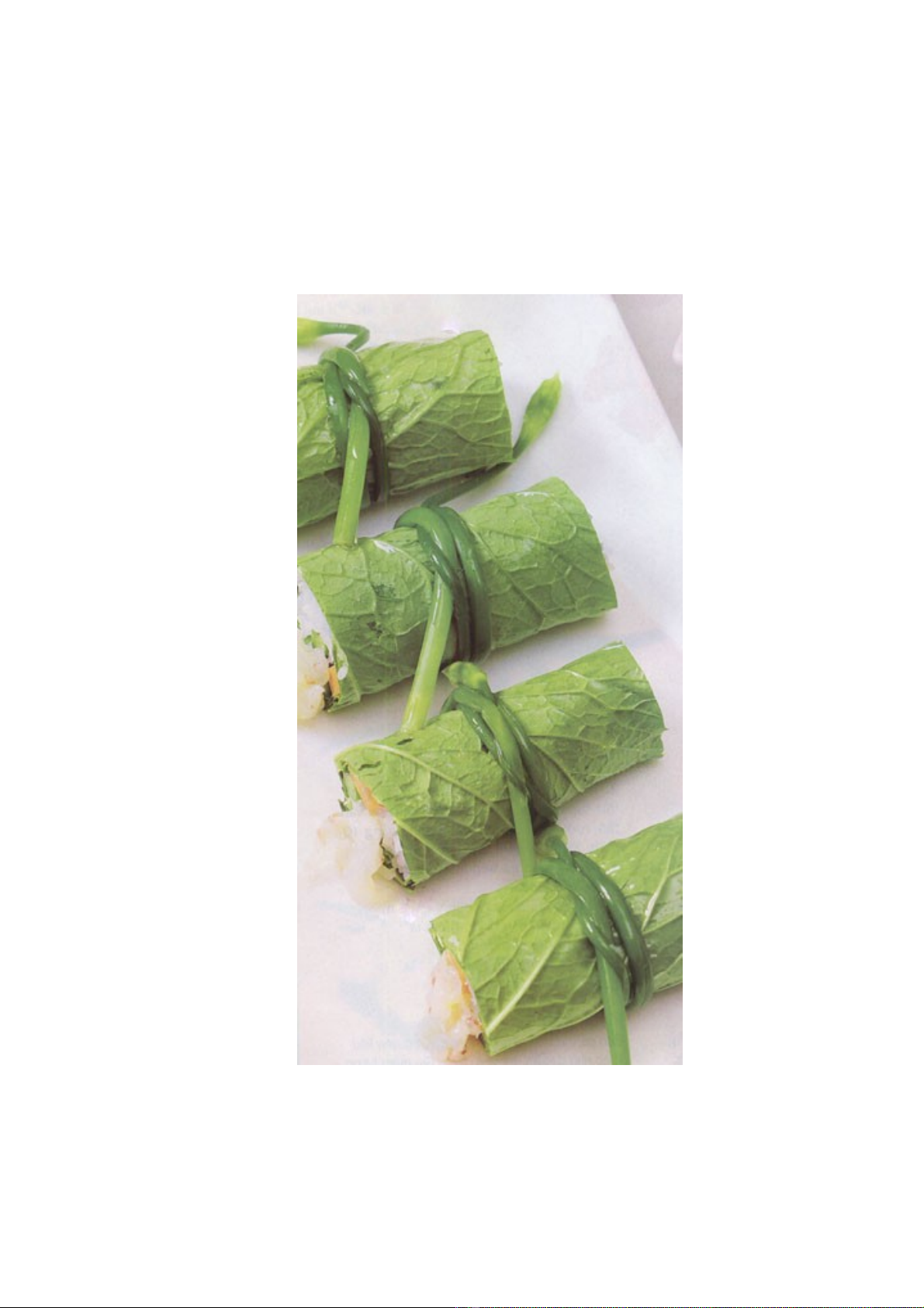 vào cuộn tròn chặt tay, dùng lá hẹ đã trụng nước sôi cột lại, bày ra đĩa.