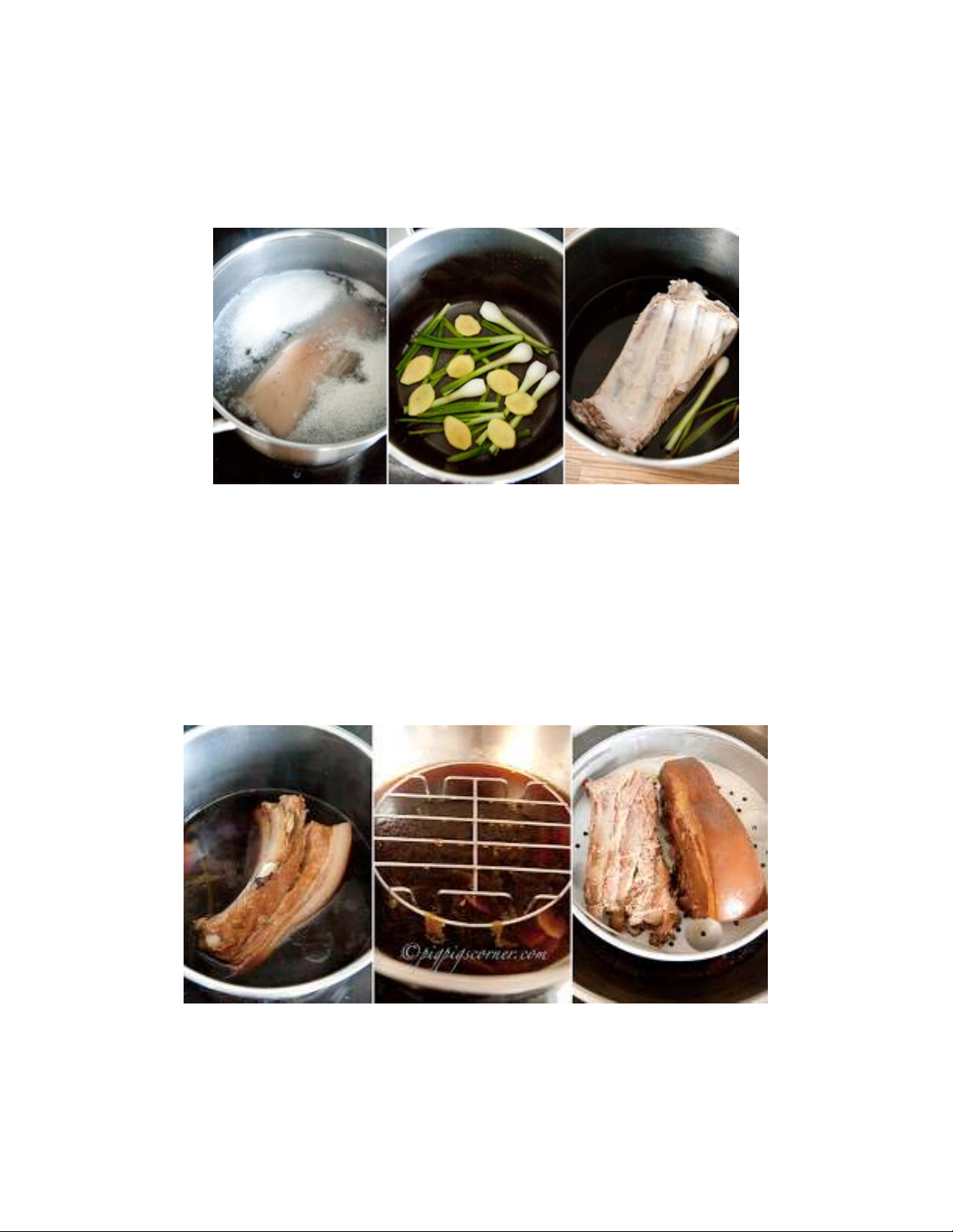Xếp gừng và hành dưới đấy nồi, trải đều, đặt thịt lợn