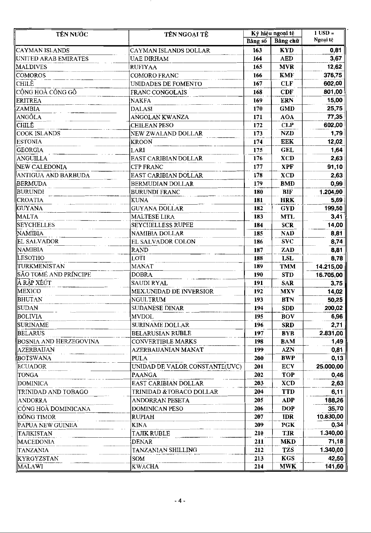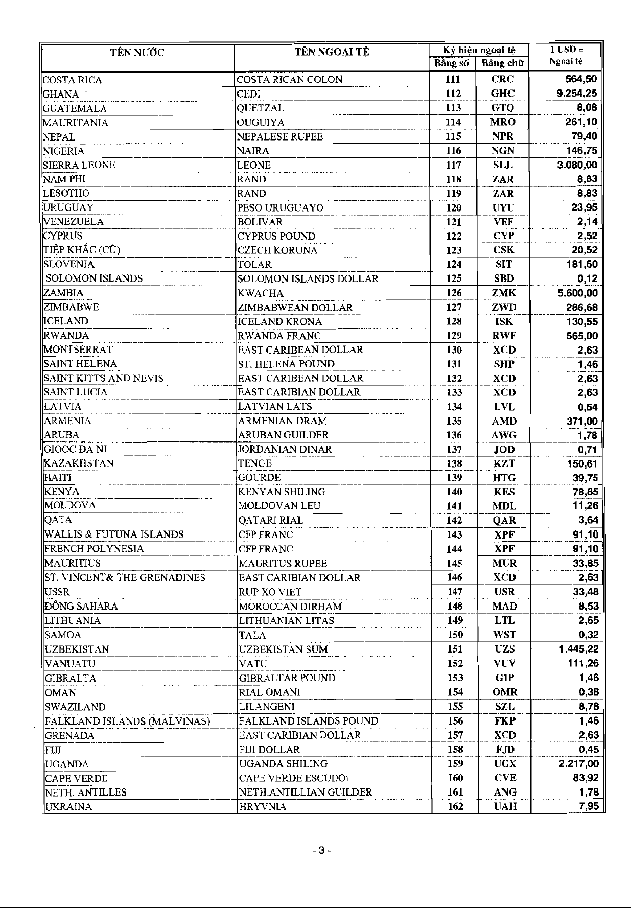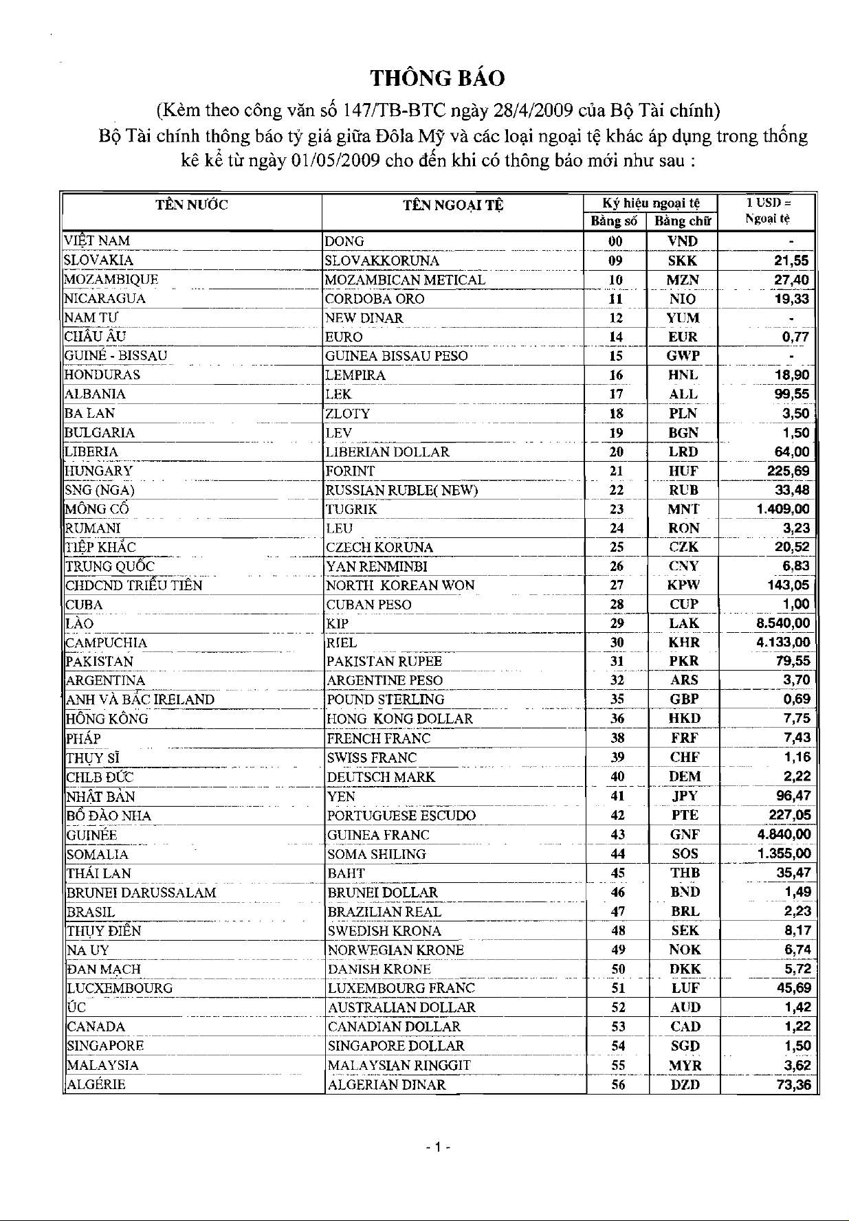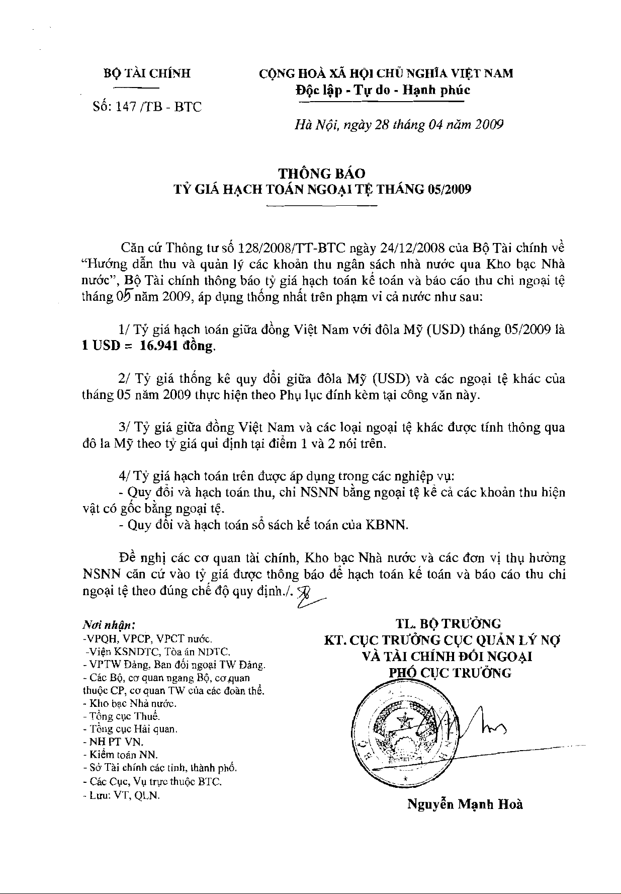 Thông báo 147/TB-BTC của Bộ Tài chính về tỷ giá hạch toán ngoại tệ tháng 05/2009