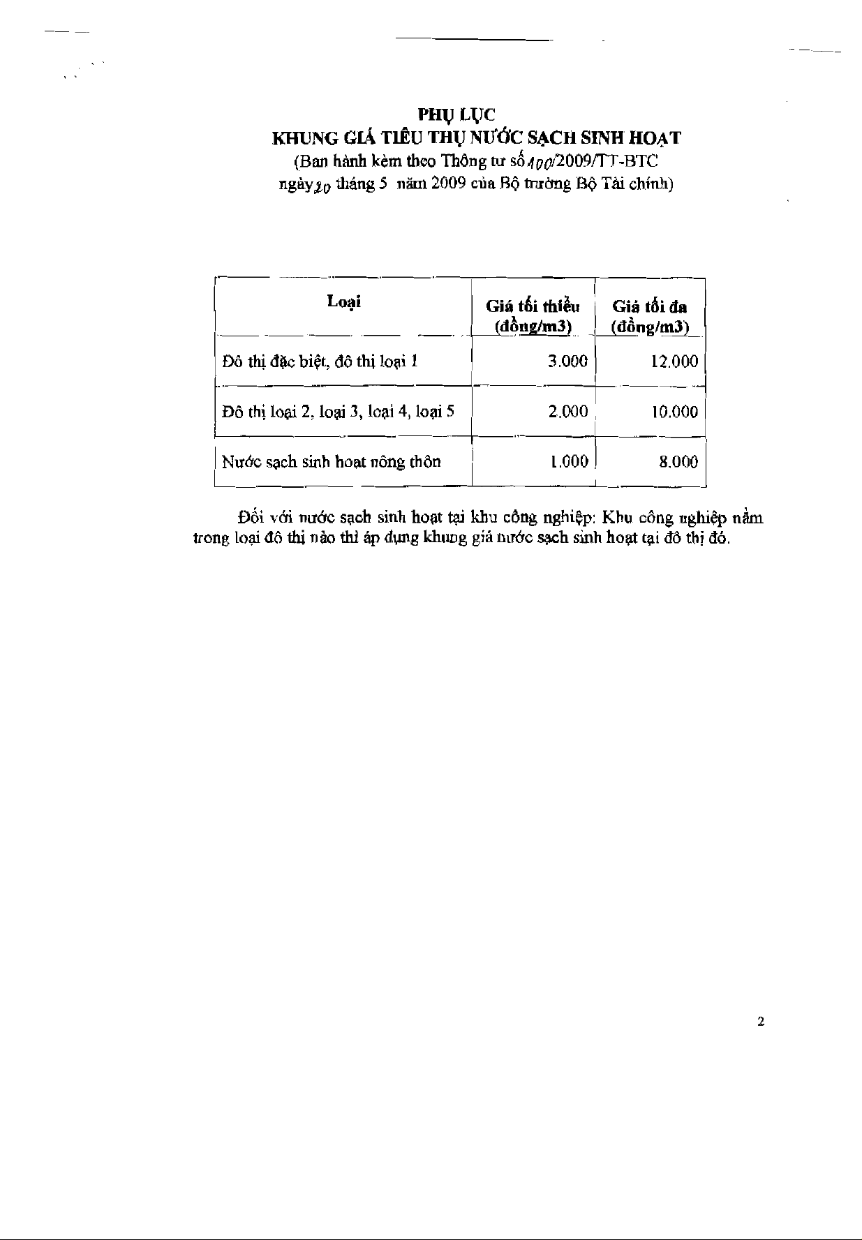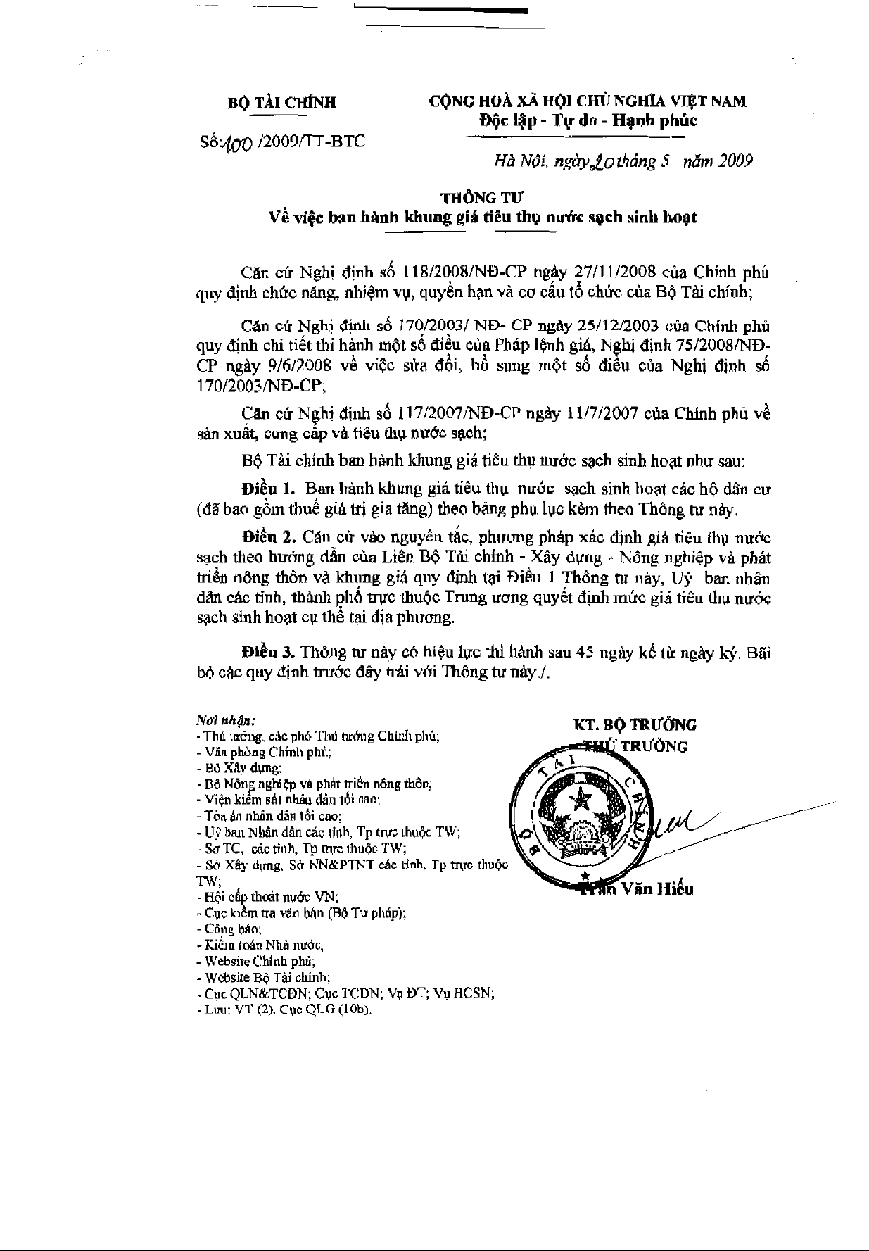 Thông tư 100/2009/TT-BTC của Bộ Tài chính về việc ban hành khung giá tiêu thụ nước sạch sinh hoạt