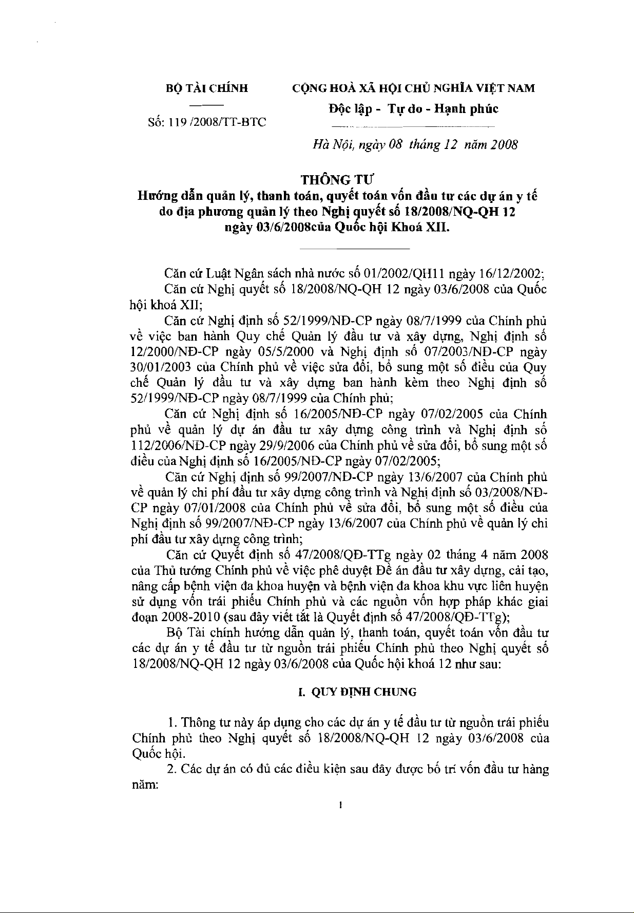 Thông tư 119/2008/TT-BTC của Bộ Tài chính về việc hướng dẫn quản lý, thanh toán, quyết toán vốn đầu tư các dự án y tế do địa phương quản lý theo Nghị quyết số 18/2008/NQ-QH12 ngày 03/6/2008 của Quốc hội Khoá XII về đẩy mạnh thực hiện chính sách, pháp luật về xã hội hóa để nâng cao chất lượng chăm sóc sức khỏe nhân dân