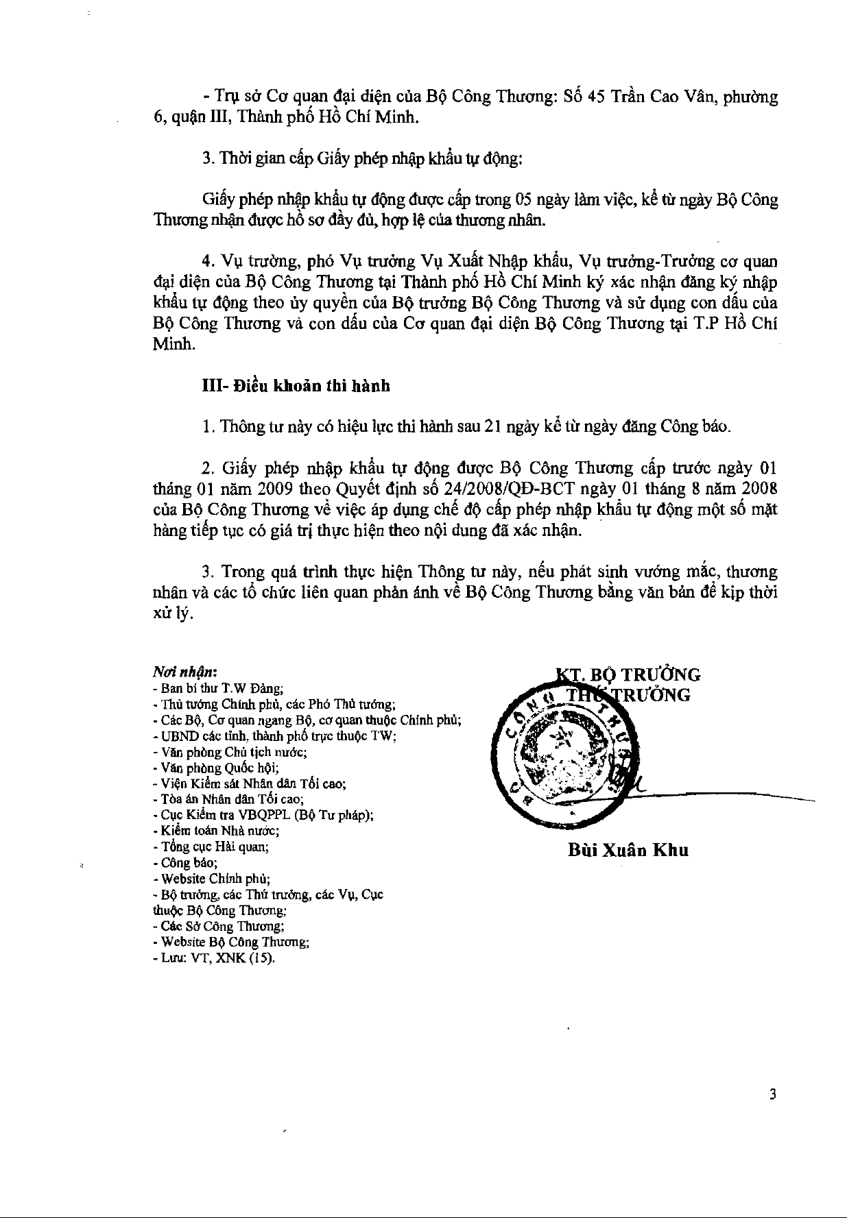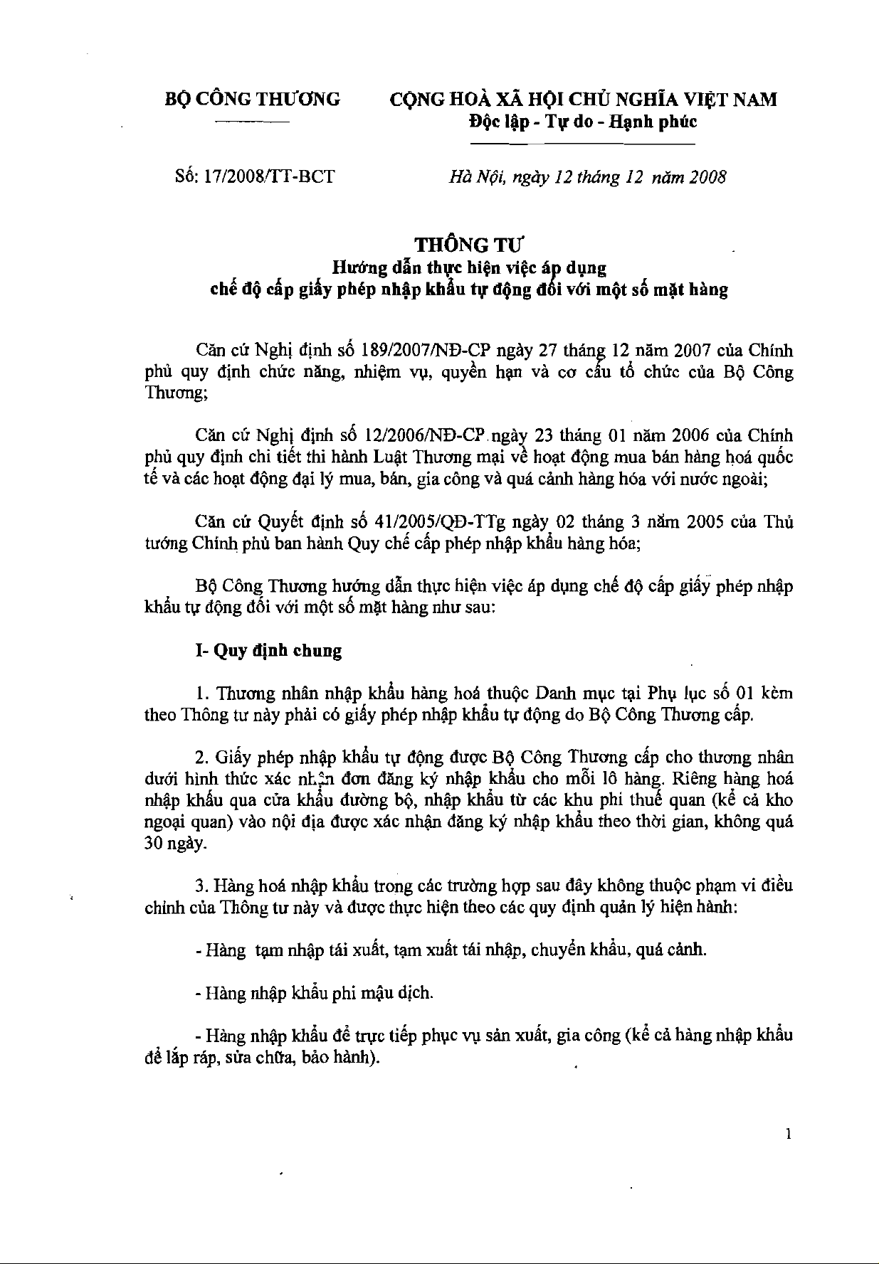 Thông tư 17/2008/TT-BCT của Bộ Công Thương hướng dẫn thực hiện việc áp dụng chế độ cấp giấy phép nhập khẩu tự động đối với một số mặt hàng