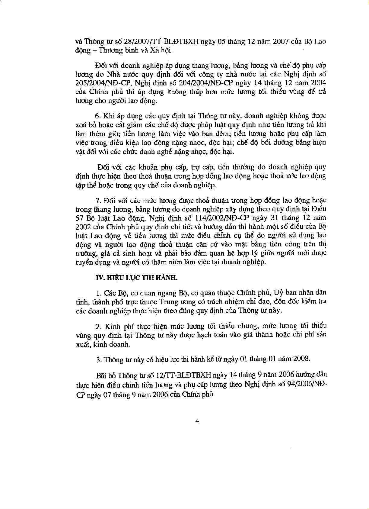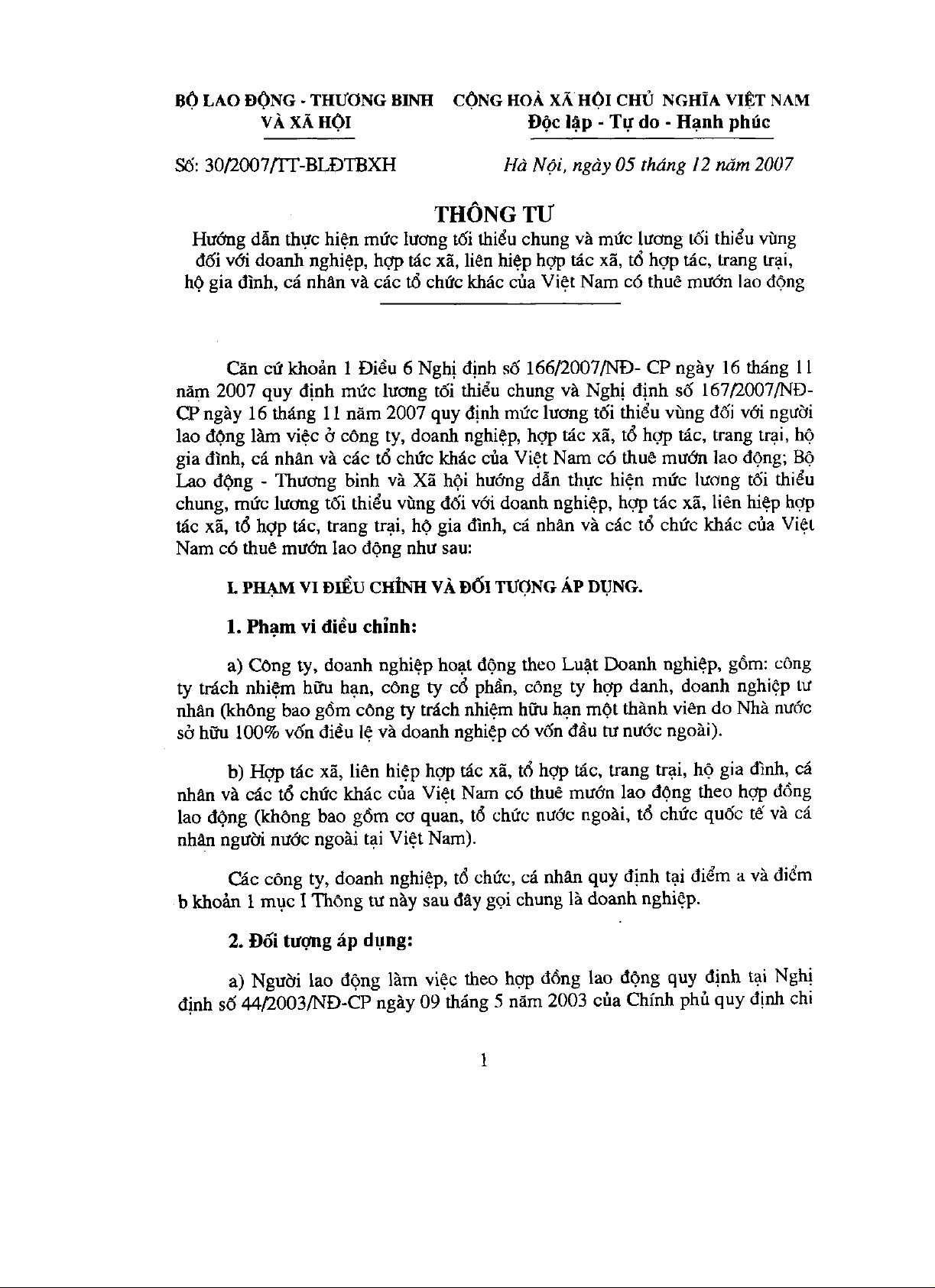 Thông tư 30/2007/TT-BLĐTBXH của Bộ Lao động, Thương binh và Xã hội về việc hướng dẫn thực hiện mức lương tối thiểu chung, mức lương tối thiểu vùng đối với doanh nghiệp, hợp tác xã, liên hiệp hợp tác xã, tổ hợp tác, trang trại, hộ gia đình, cá nhân và các tổ chức khác của Việt Nam có thuê muớn lao động