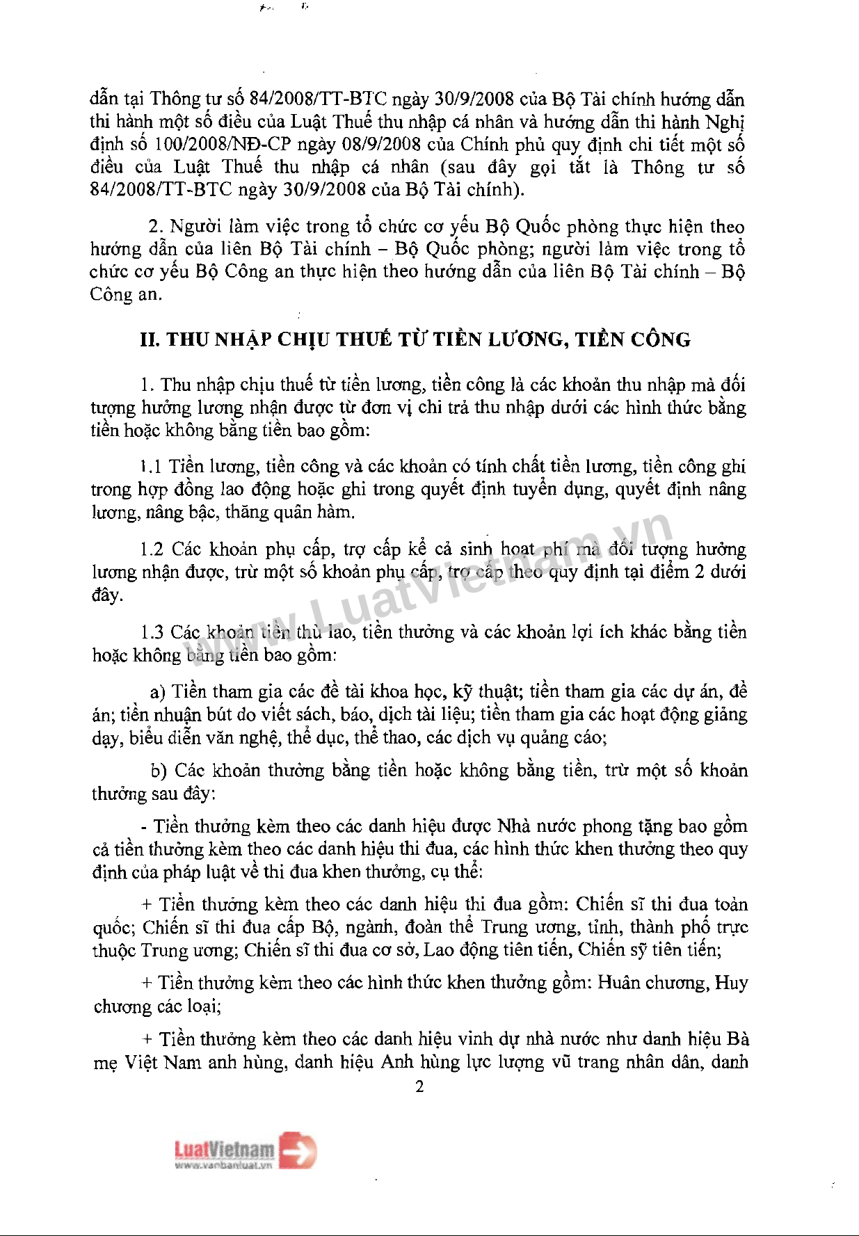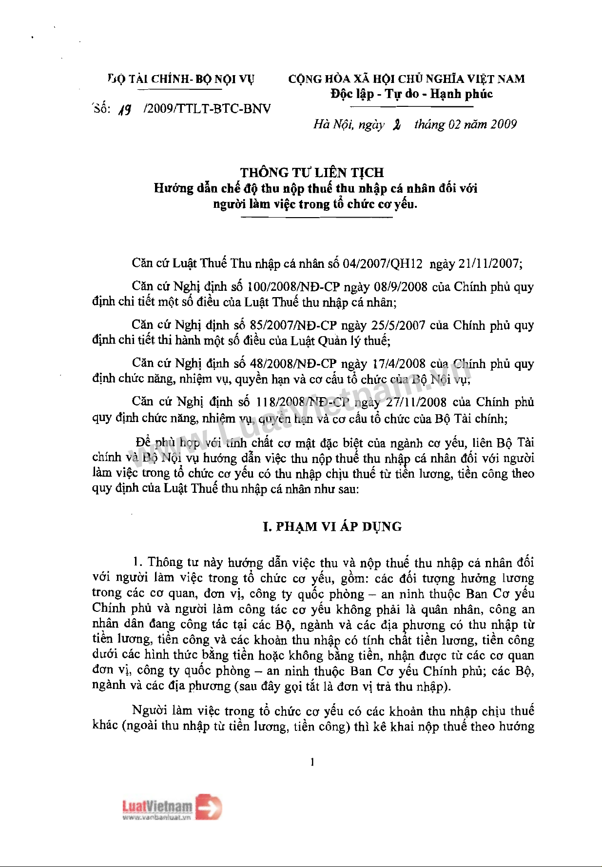 Thông tư liên tịch 19/2009/TTLT-BTC-BNV của Bộ Tài chính và Bộ Nội vụ hướng dẫn chế độ thu nộp thuế thu nhập cá nhân đối với người làm việc trong tổ chức cơ yếu