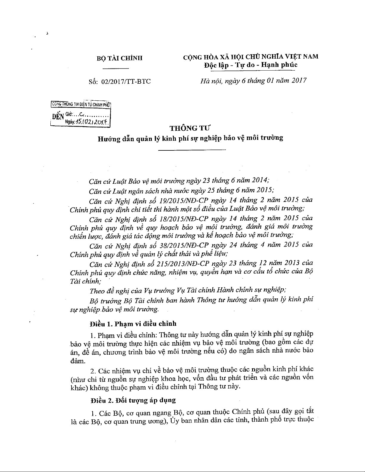 Thông tư 02/2017/TT-BTC ngày 06/01/2017 của Bộ Tài chính về việc hướng dẫn quản lý kinh phí sự nghiệp bảo vệ môi trường. Được Căn cứ Luật Bảo vệ môi trường ngày 23 tháng 6 năm 2014;...