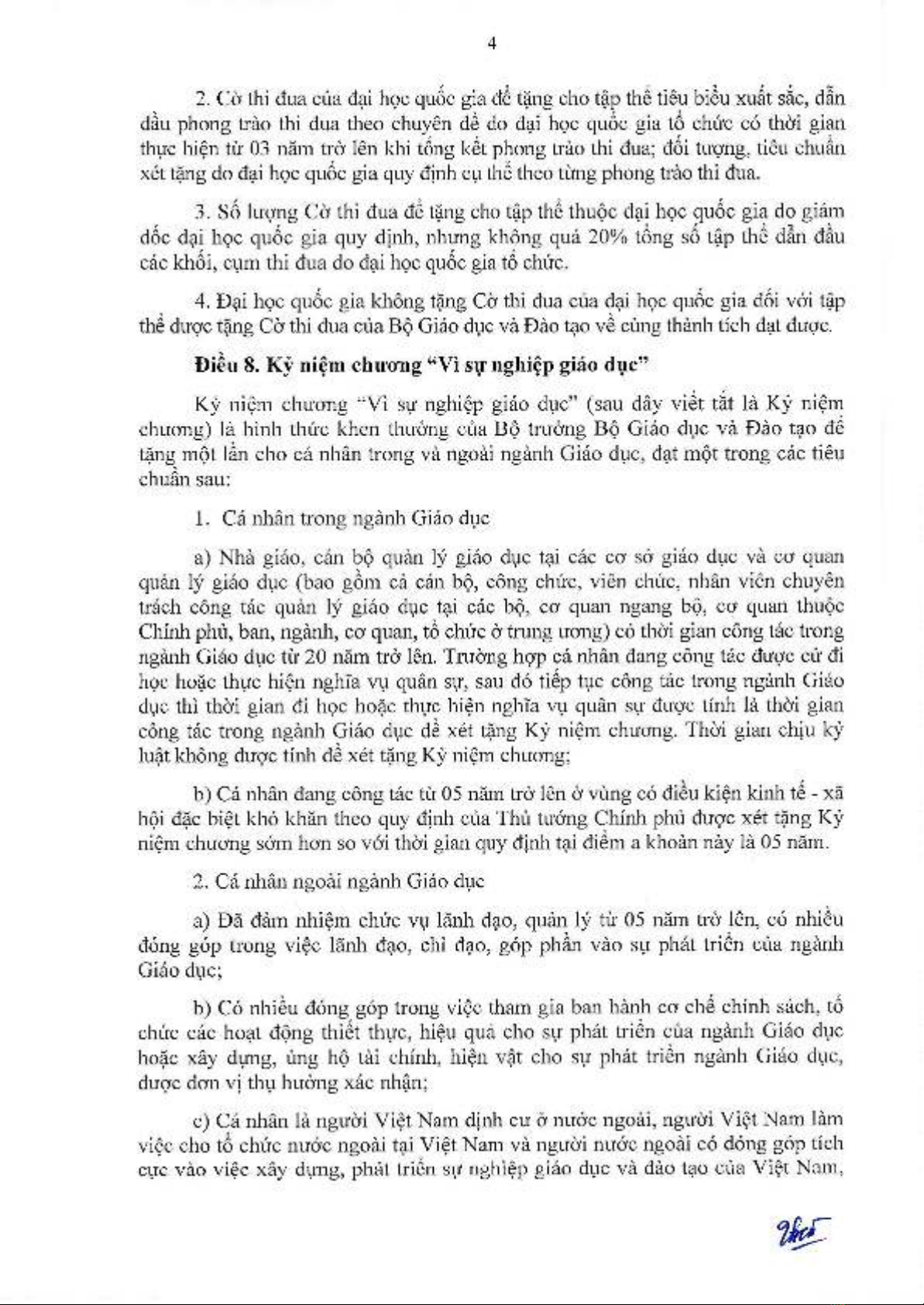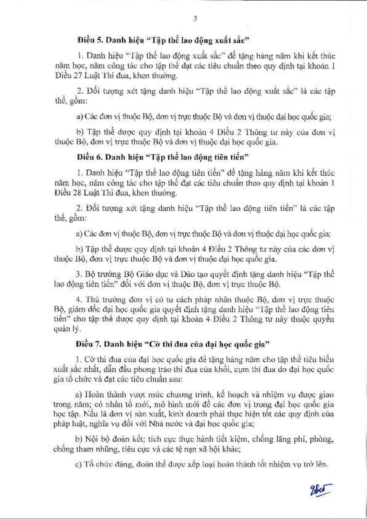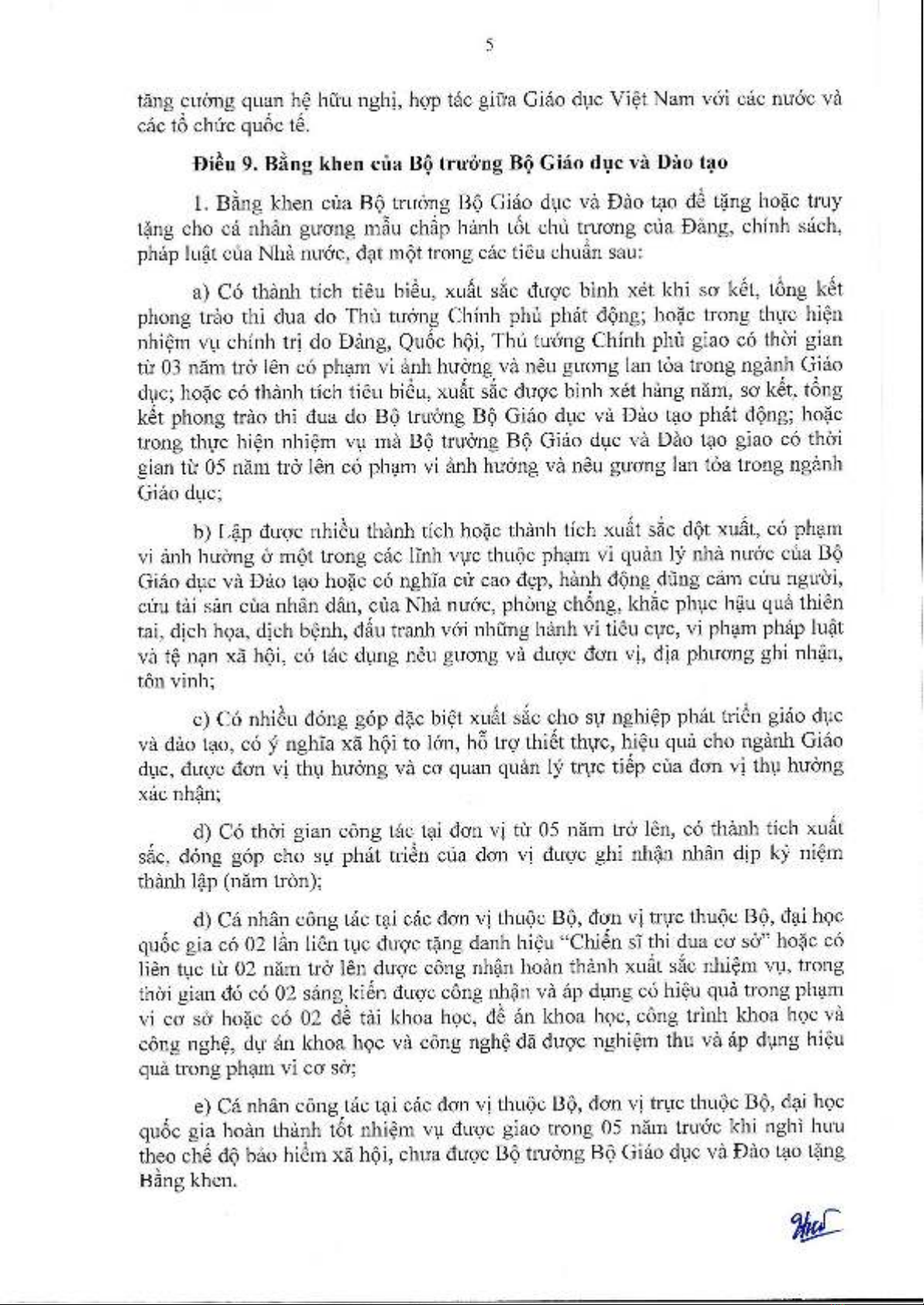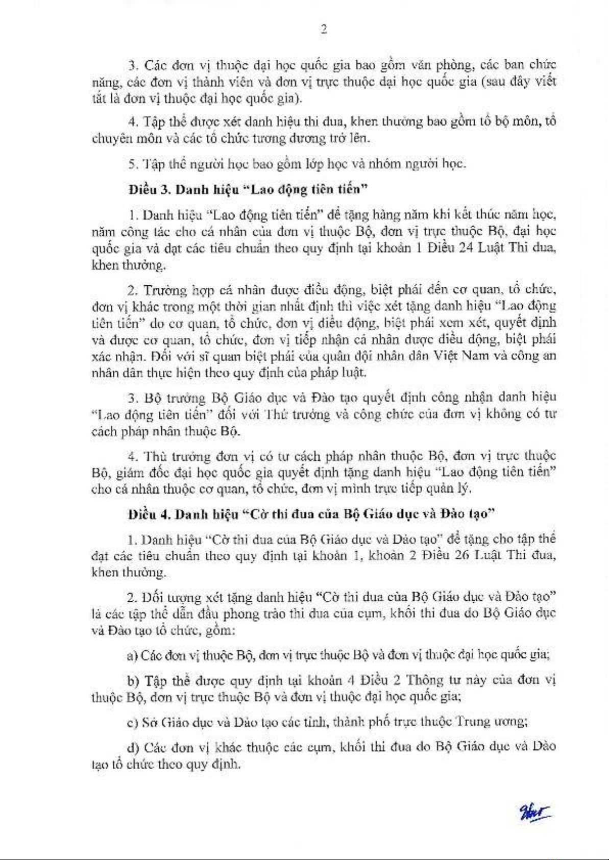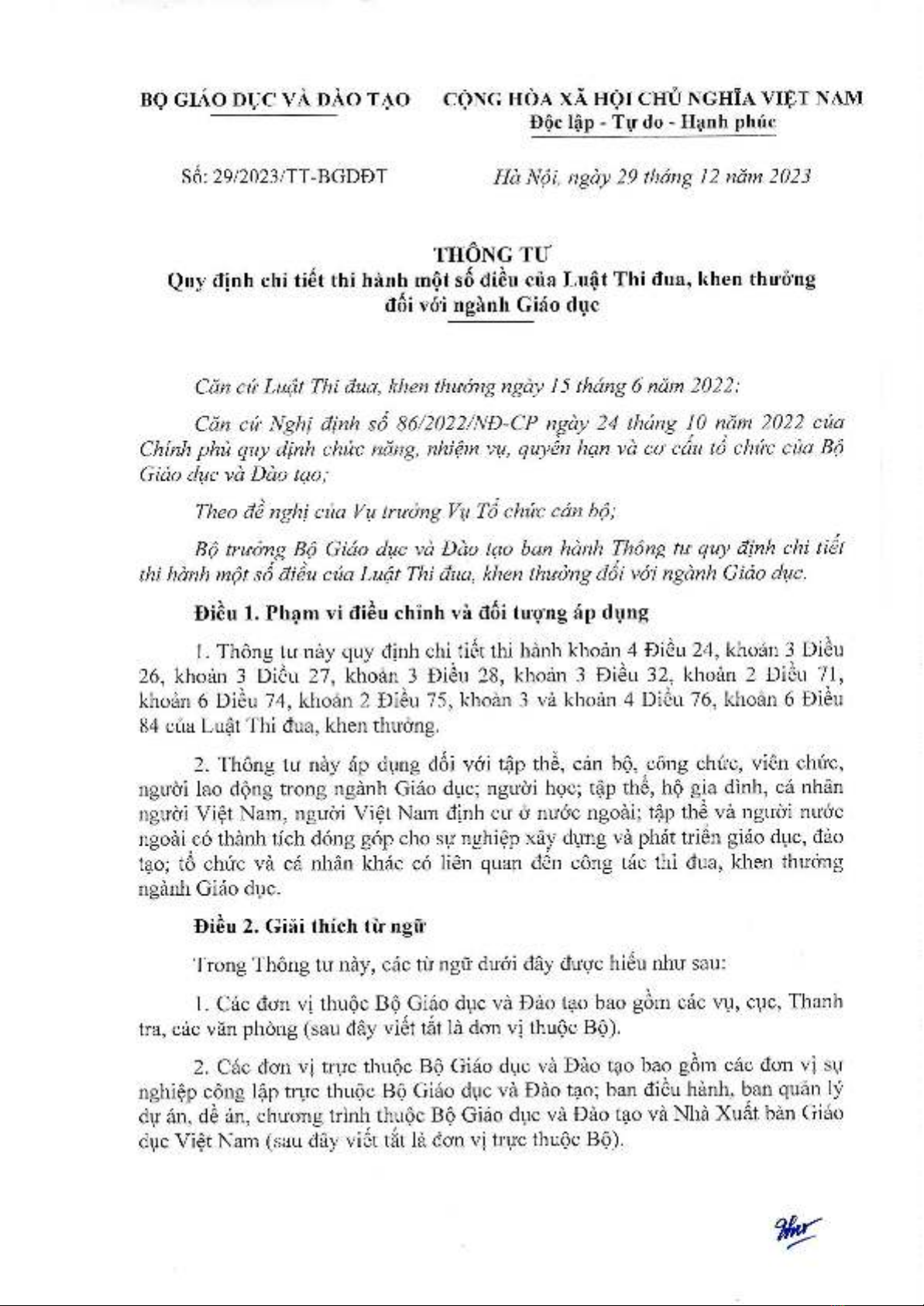 Thông tư số 29/2023/TT-BGDĐT của Bộ Giáo dục và Đào tạo: Quy định chi tiết thi hành một số điều của Luật Thi đua, khen thưởng đối với ngành Giáo dục. Thông tư này áp dụng đối với tập thể, cán bộ, công chức, viên chức, người lao động trong ngành Giáo dục; người học; tập thể, hộ gia đình, cá nhân người Việt Nam, người Việt Nam định cư ở nước ngoài; tập thể và người nước ngoài có thành tích đóng góp cho sự nghiệp xây dựng và phát triển giáo dục, đào tạo; tổ chức và cá nhân khác có liên quan đến công tác thi đua, khen thưởng ngành Giáo dục.
