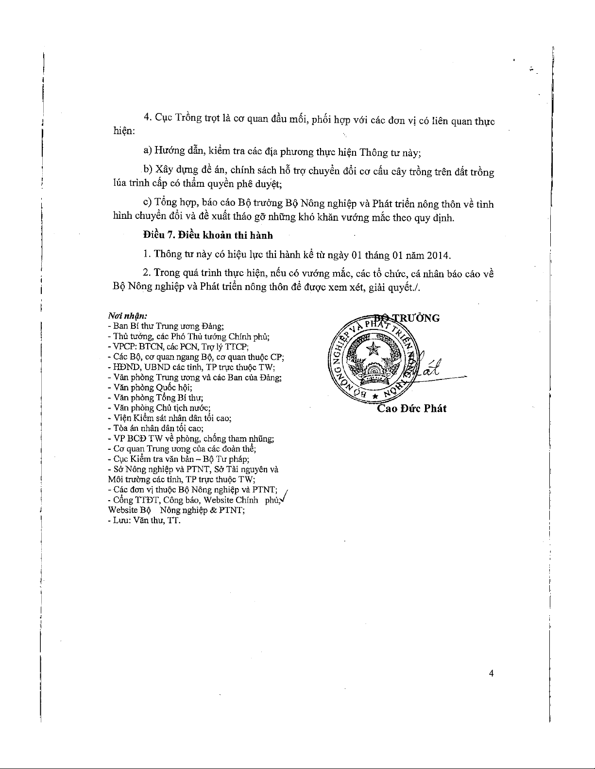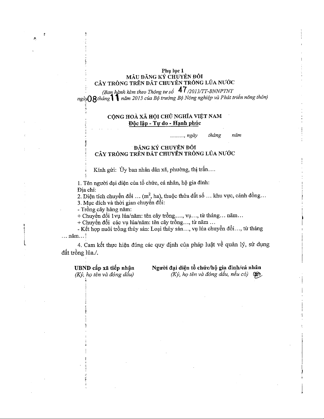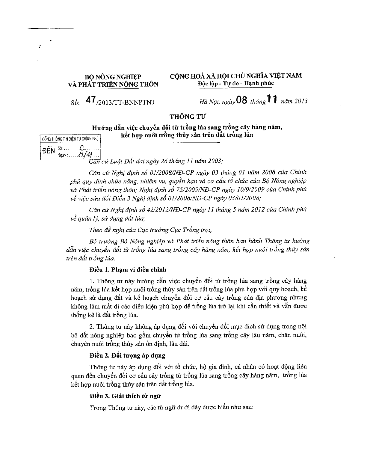 "Thông tư số 47/2013/TT-BNNPTNT" Hướng dẫn việc chuyển đổi từ trồng lúa sang trồng cây hàng năm, trồng lúa kết hợp nuôi trồng thủy sản trên đất trồng lúa phù hợp với quy hoạch, kế hoạch sử dụng đất và kế hoạch chuyển đổi cơ cấu cây trồng của địa phương nhưng không làm mất đi các điều kiệm phù hợp để trồng lúa trở lại khi cần thiết và vẫn được thống kê là đất trồng lúa. mời các bạn cùng tham khảo.