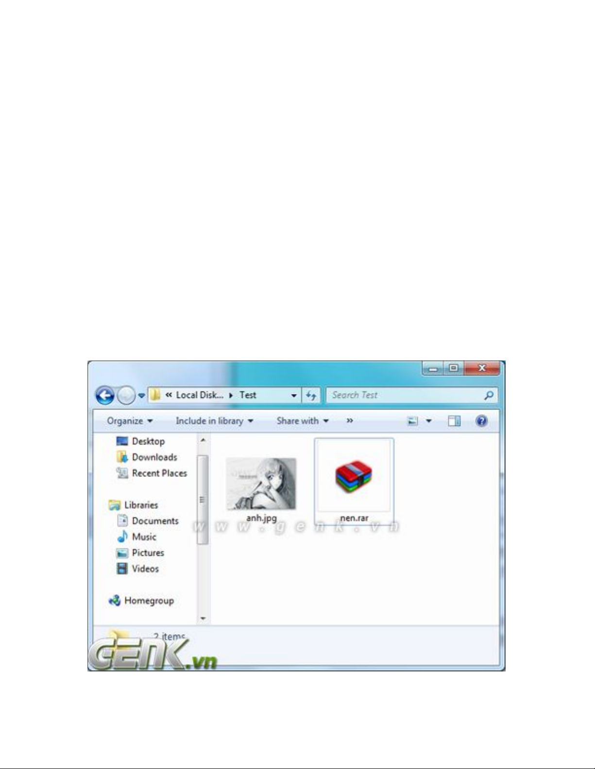 Copy 2 file anh.jpg và nen.rar vào thư mục F:\test