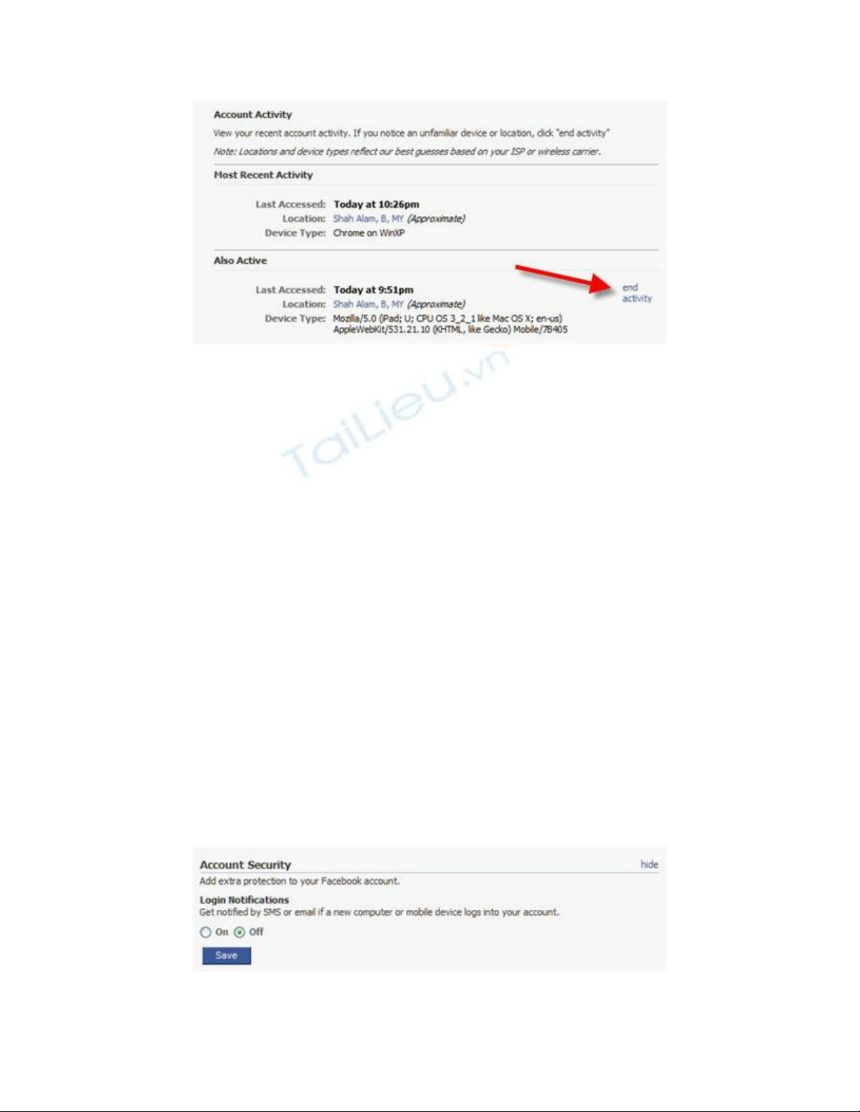 Facebook của bạn. Ngay tại tiểu mục Login Notification,