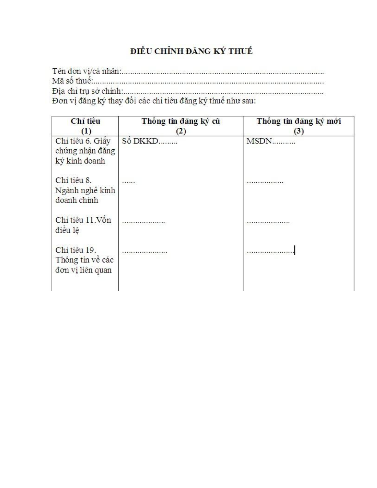 - Thay đổi các chỉ tiêu khác trên tờ khai đăng ký thuế như: ngành nghề