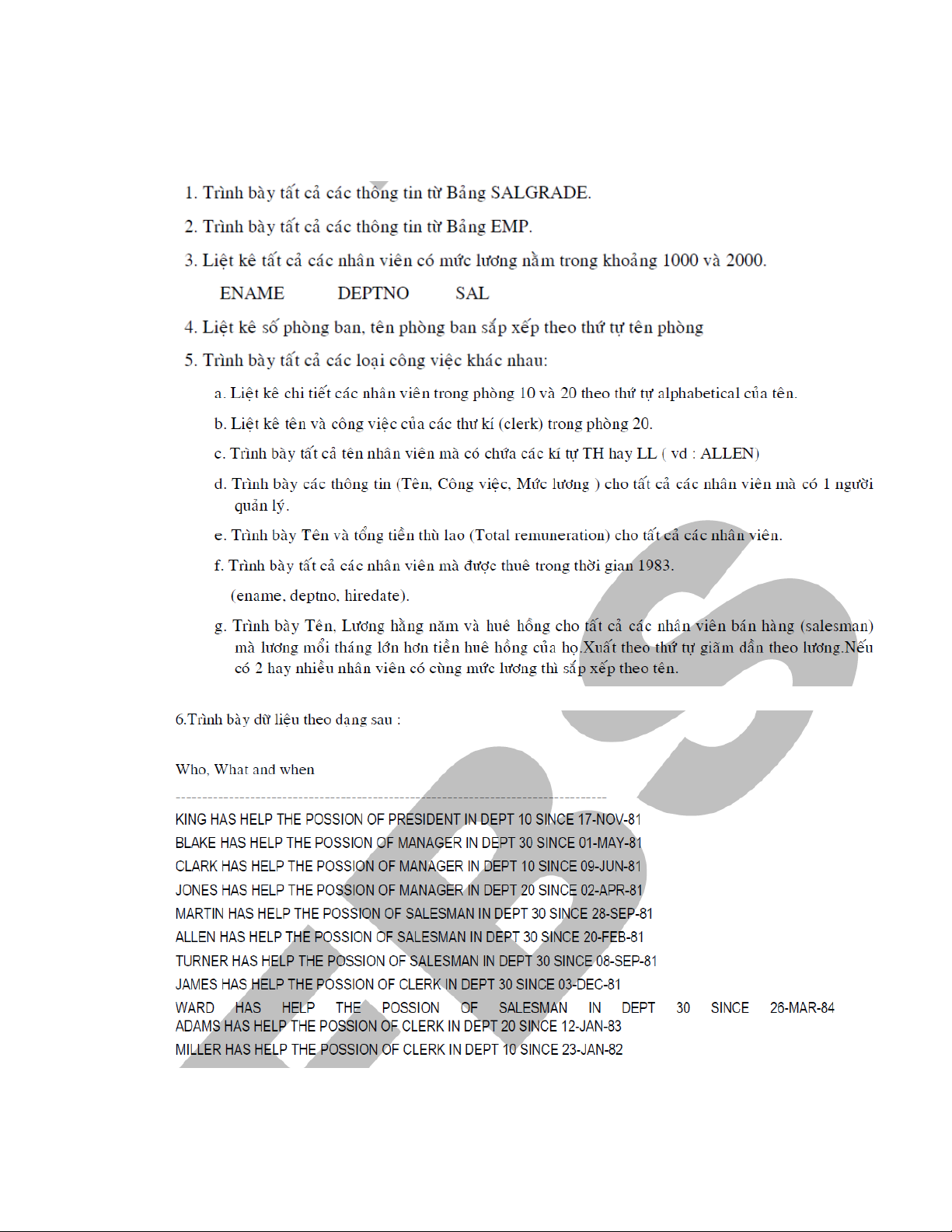 7. Ch n nhân viên trong b ng EMP có m c l ng t 1000 đ n 2000 (ch n các tr ng ENAME,ọ ả ứ ươ ừ ế ọ ườ