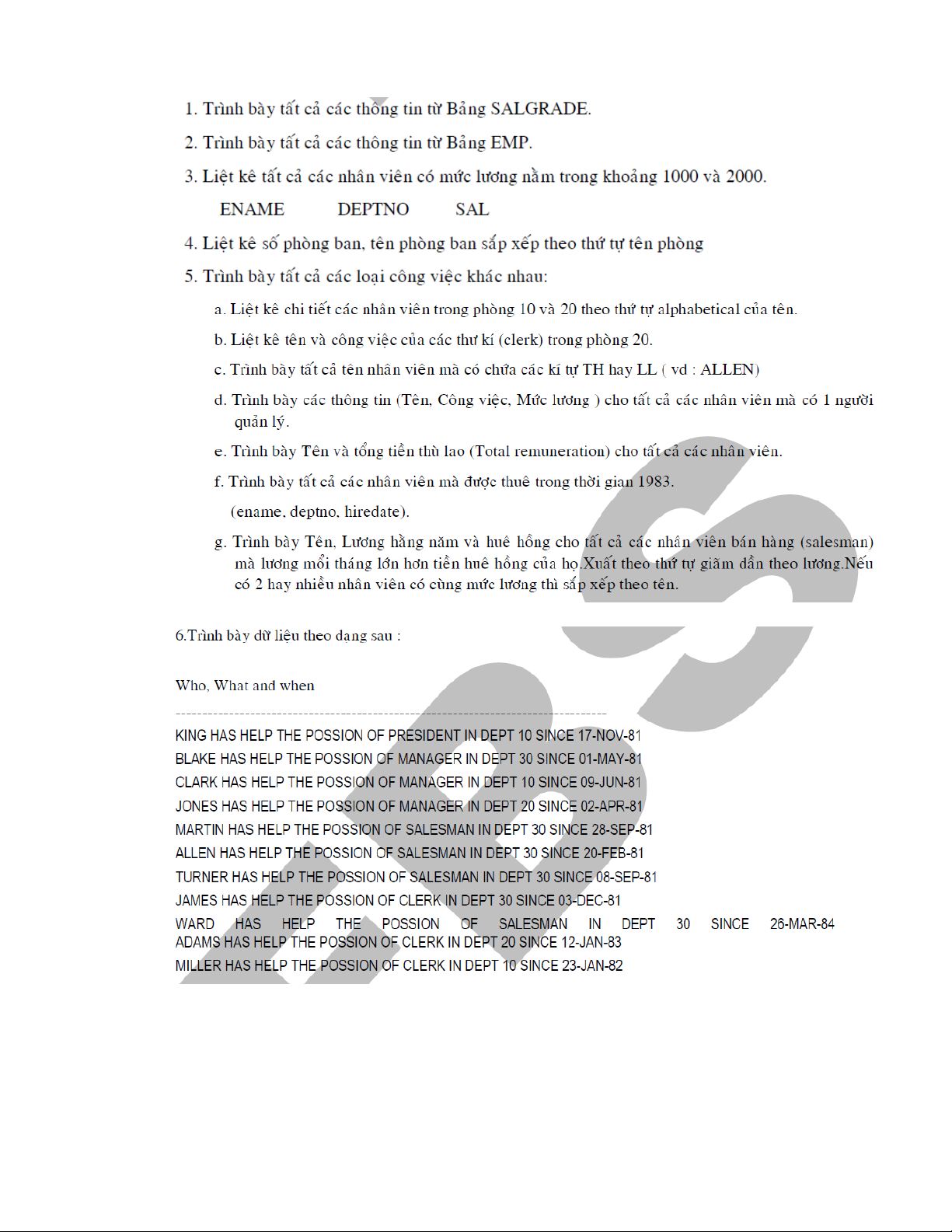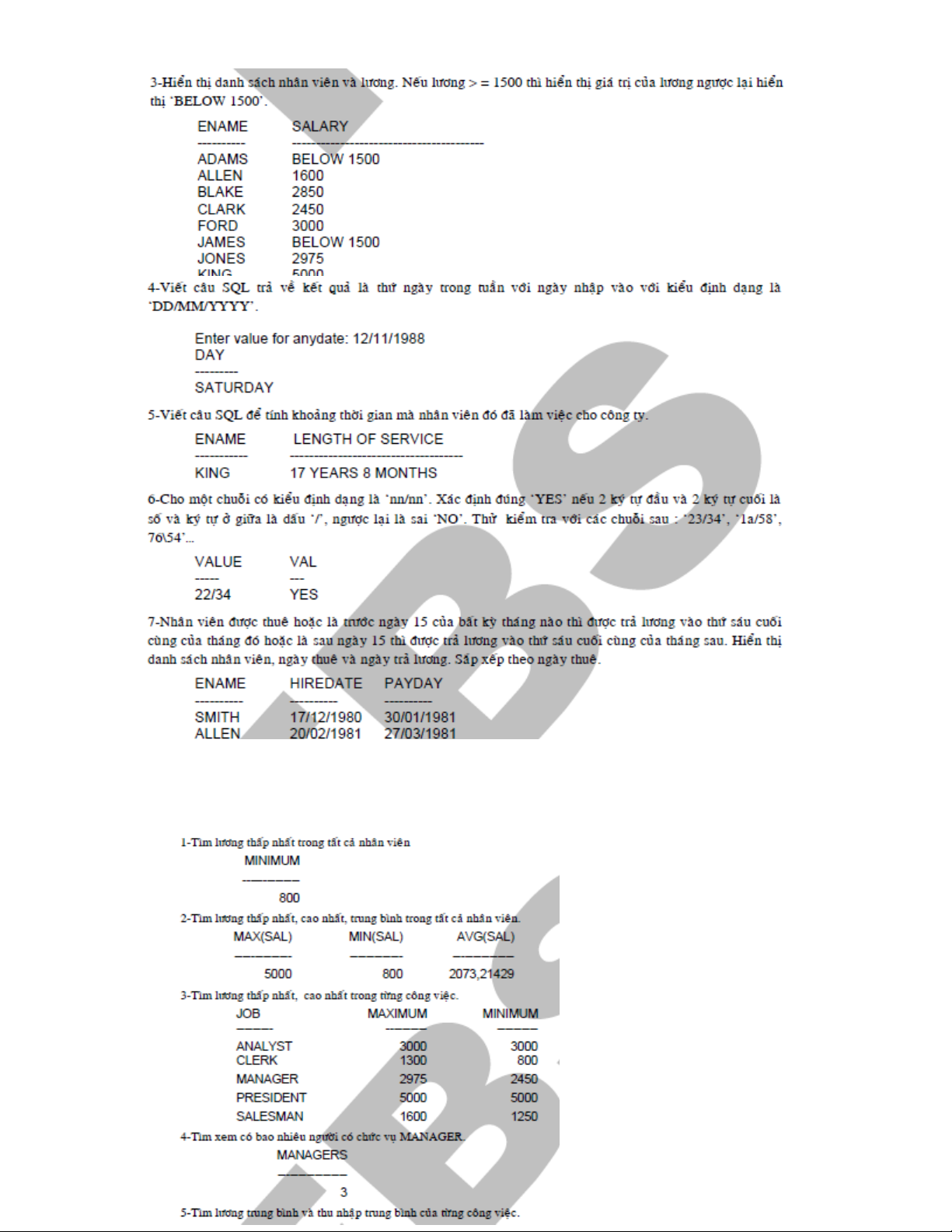 7. Ch n nhân viên trong b ng EMP có m c l ng t 1000 đ n 2000 (ch n các tr ng ENAME,ọ ả ứ ươ ừ ế ọ ườ