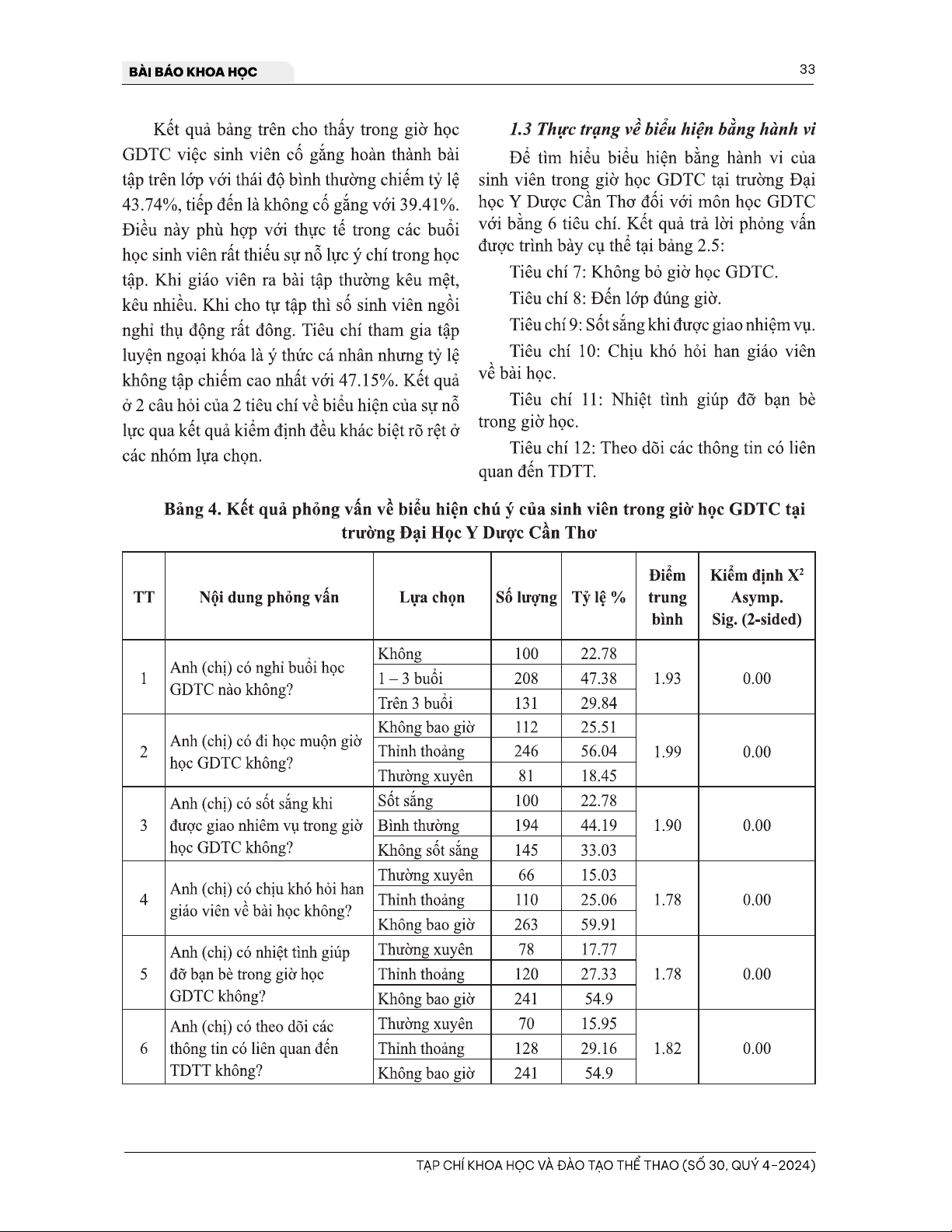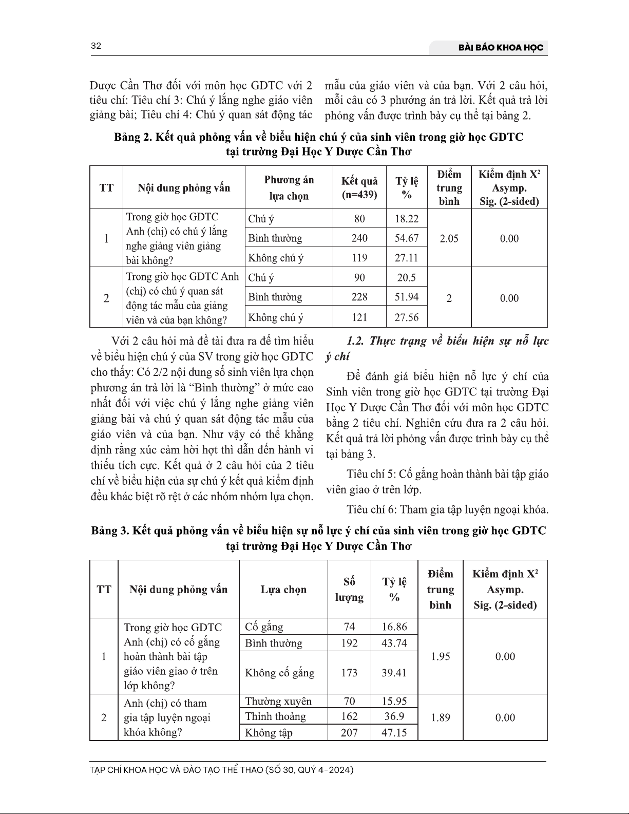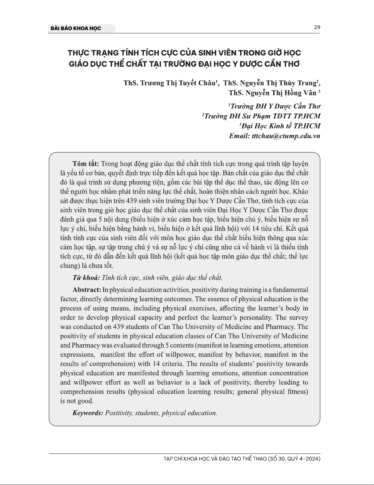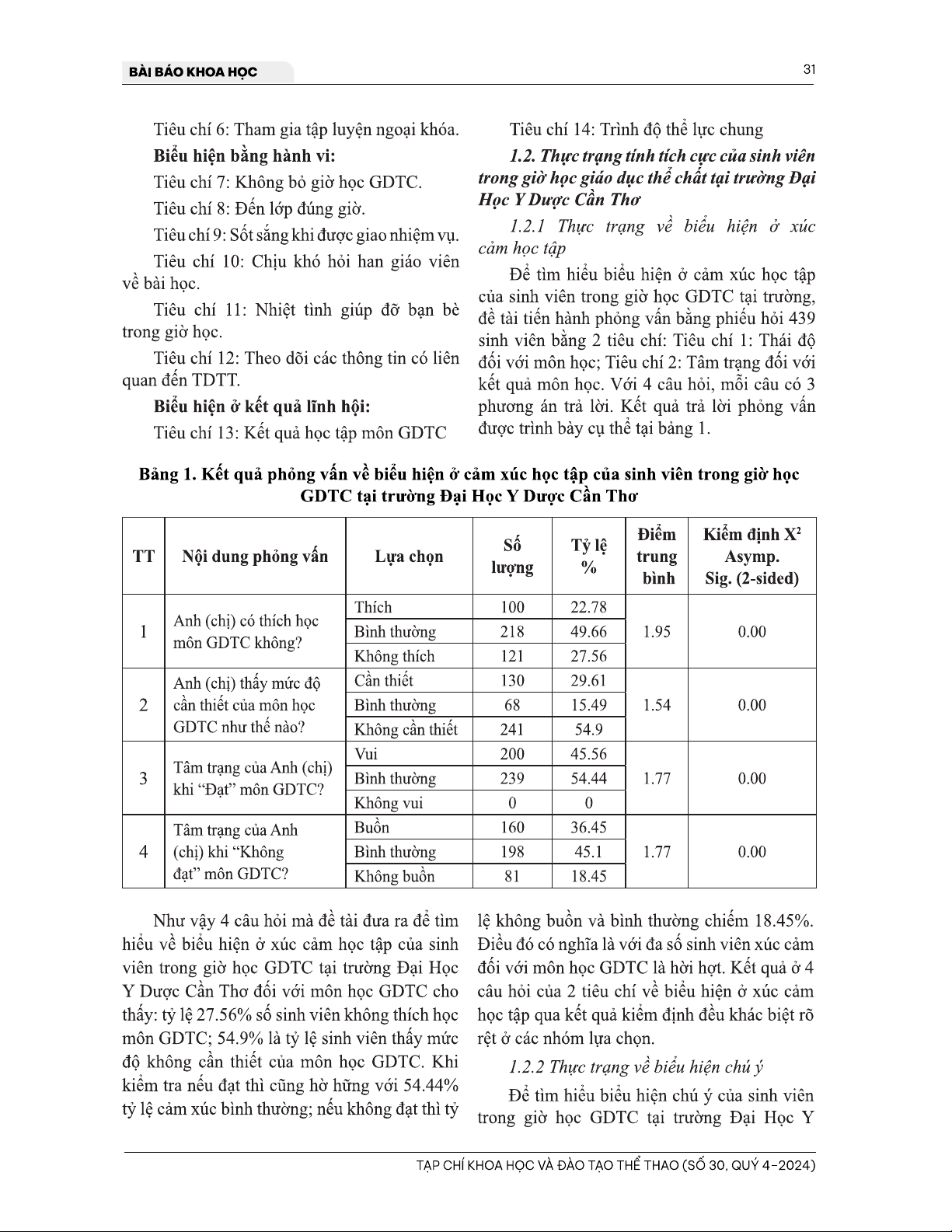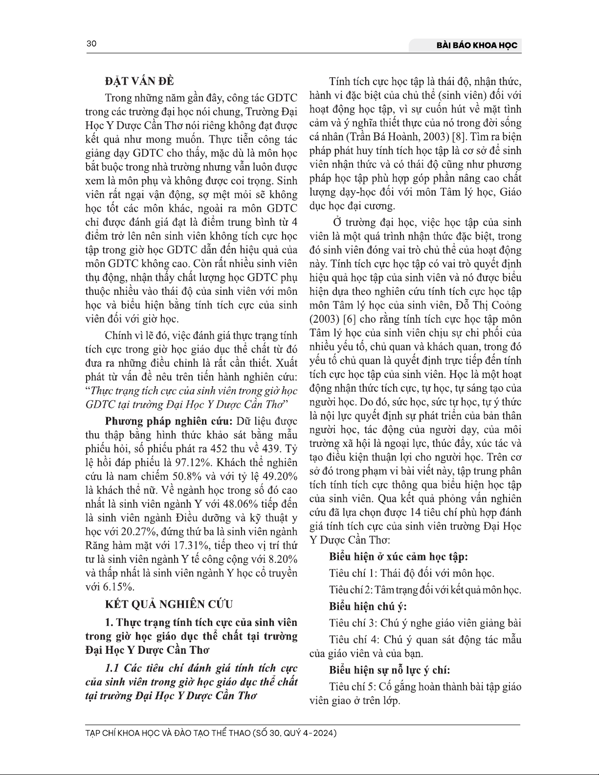 Bài viết 'Thực trạng tính tích cực của sinh viên trong giờ học giáo dục thể chất tại trường Đại Học Y Dược Cần Thơ' phân tán một nghiên cứu về thái độ và hành vi của sinh viên trong giờ học giáo dục thể chất tại trường Đại Học Y Dược Cần Thơ. Theo kết quả nghiên cứu, sinh viên có xu hướng thiếu tính tích cực trong giờ học này, dẫn đến kết quả lĩnh hội chưa tốt. Bài viết cho phép chúng ta có thể tìm hiểu về thực trạng tính tích cực của sinh viên, góp phần để tìm kiếm giải pháp để cải thiện kết quả lĩnh hội và phát triển kỹ năng cho sinh viên.