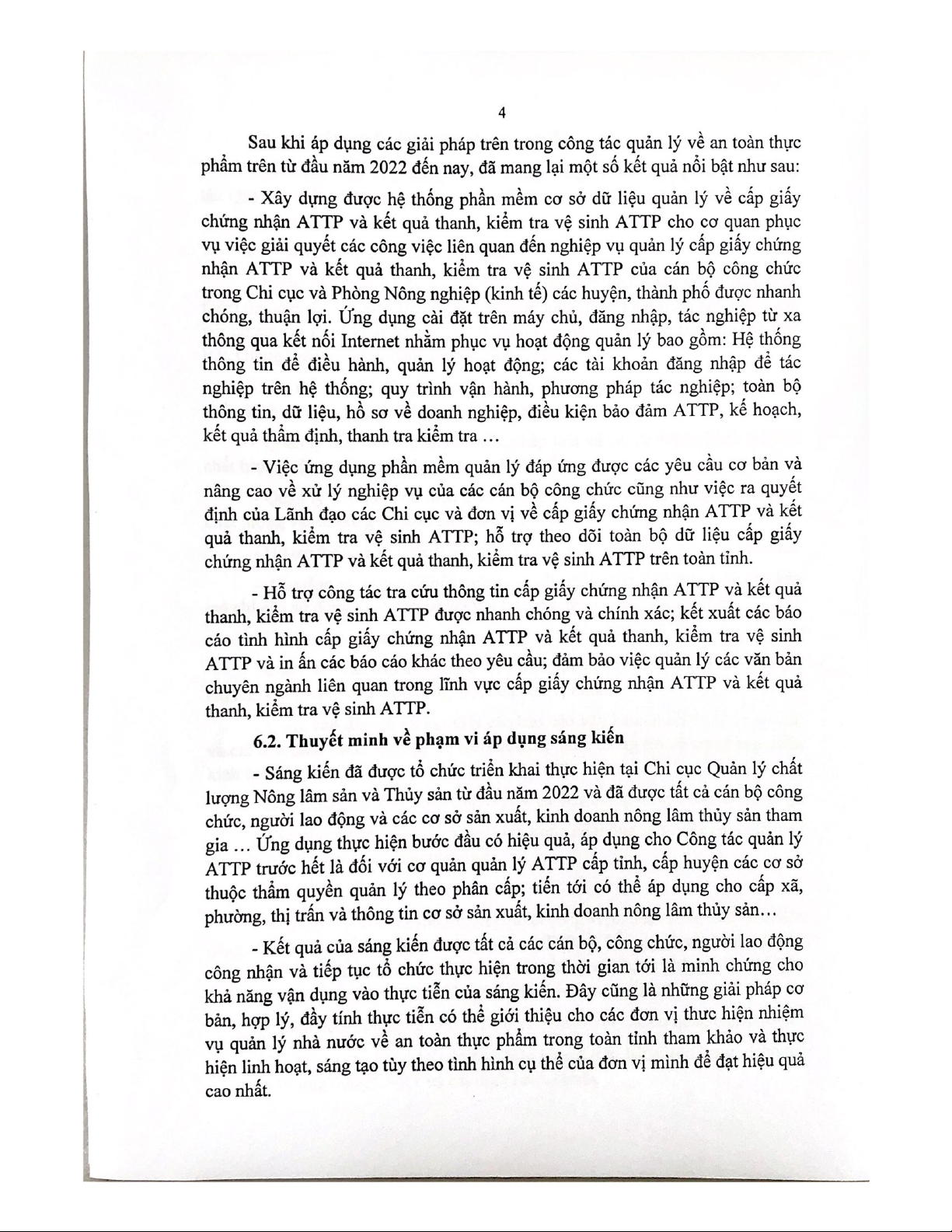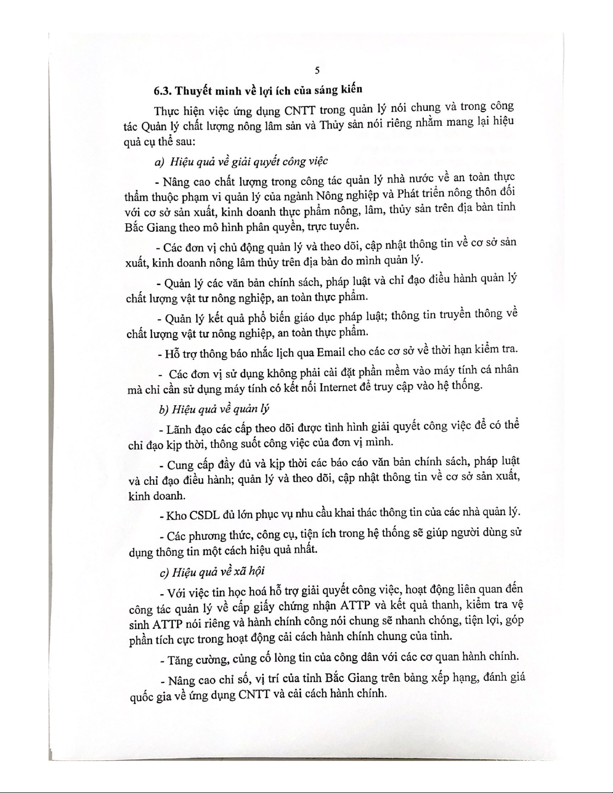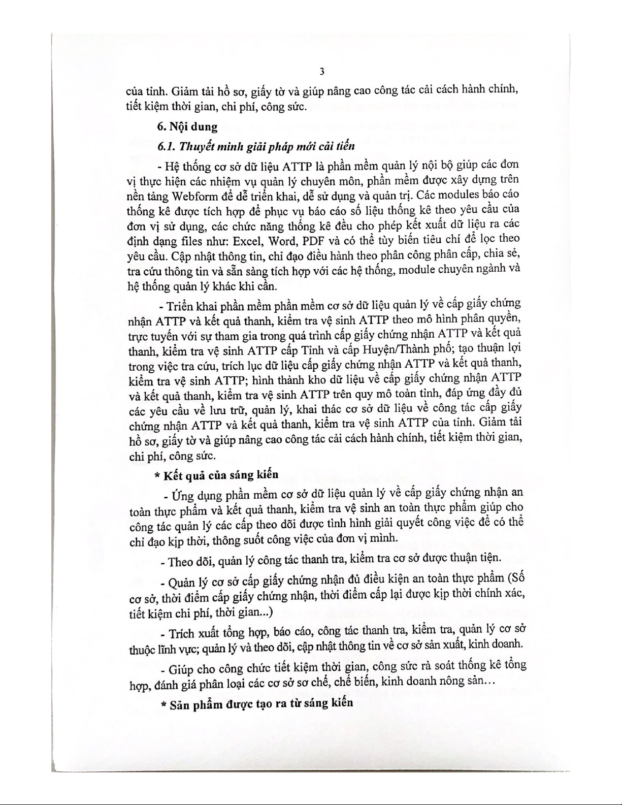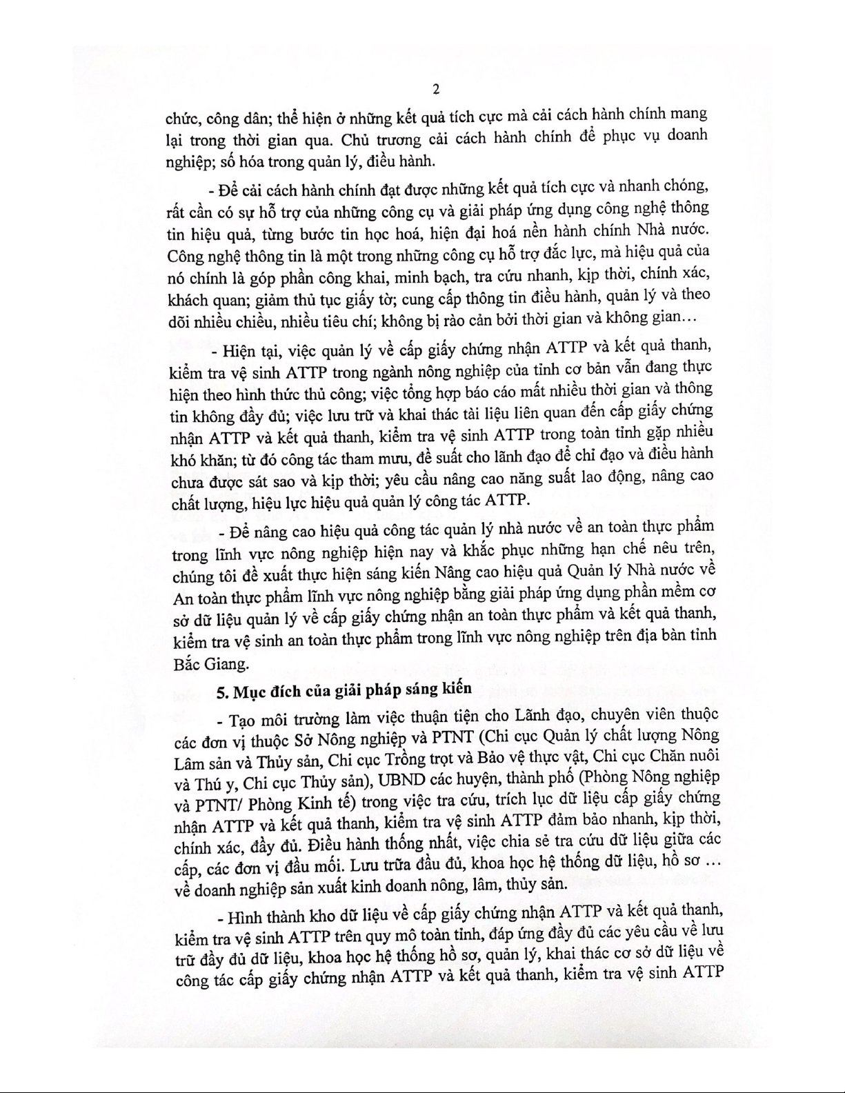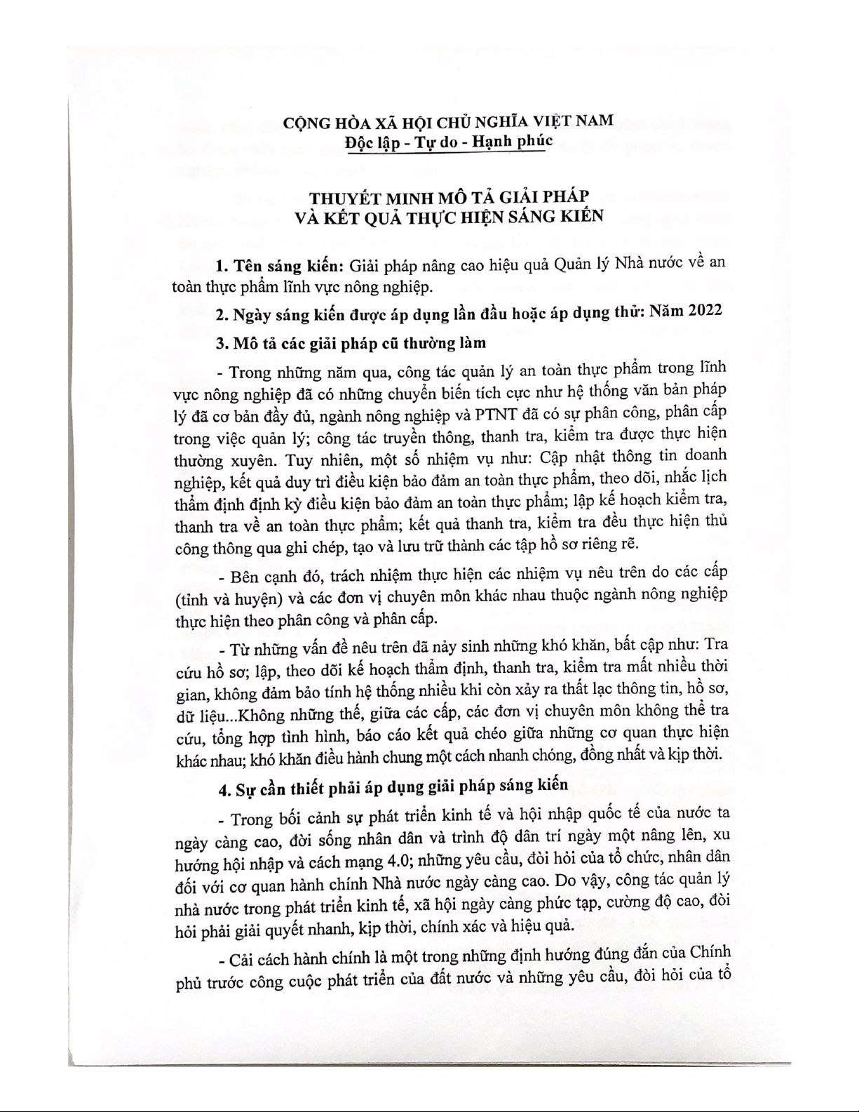 Tài liệu này trình bày chi tiết một sáng kiến nhằm cải thiện đáng kể công tác quản lý nhà nước về an toàn thực phẩm trong lĩnh vực nông nghiệp, giải quyết các hạn chế của hệ thống quản lý thủ công truyền thống. Vấn đề cốt lõi được xác định là các quy trình thủ công rời rạc, kém hiệu quả trong việc xử lý cấp giấy chứng nhận an toàn thực phẩm (ATTP), kết quả thanh tra, kiểm tra và các nhiệm vụ hành chính liên quan ở các cấp (tỉnh, huyện). Để khắc phục những thách thức này, sáng kiến đề xuất một phương pháp tiếp cận mới dựa trên việc phát triển và triển khai một phần mềm ứng dụng công nghệ thông tin cùng một hệ thống cơ sở dữ liệu toàn diện. Giải pháp phần mềm này được thiết kế để tập trung hóa việc quản lý các giấy chứng nhận ATTP và kết quả kiểm tra, cho phép truy cập dữ liệu theo thời gian thực, quản lý hoạt động thống nhất và báo cáo tự động. Các lợi ích chính bao gồm nâng cao tốc độ và độ chính xác trong truy xuất dữ liệu, hợp lý hóa các thủ tục hành chính, giảm thiểu giấy tờ, cải thiện phối hợp liên ngành và hỗ trợ ra quyết định tốt hơn cho lãnh đạo. Việc triển khai thành công hệ thống này tại tỉnh Bắc Giang, đặc biệt trong Sở Nông nghiệp và Phát triển Nông thôn và các cơ quan liên quan, đã chứng minh giá trị thực tiễn của nó trong việc thúc đẩy cải cách hành chính, tăng cường lòng tin của công chúng và đóng góp vào sự phát triển kinh tế - xã hội tổng thể bằng cách đảm bảo chuỗi cung ứng thực phẩm an toàn hơn. Sáng kiến này có thể được nhân rộng và áp dụng linh hoạt cho các địa phương khác.