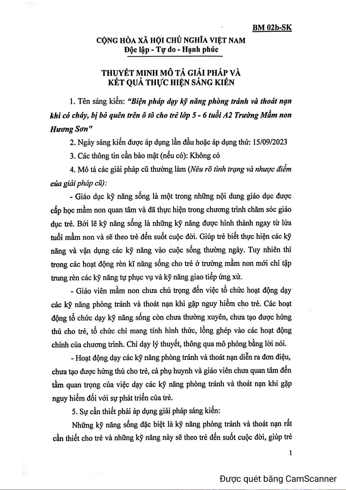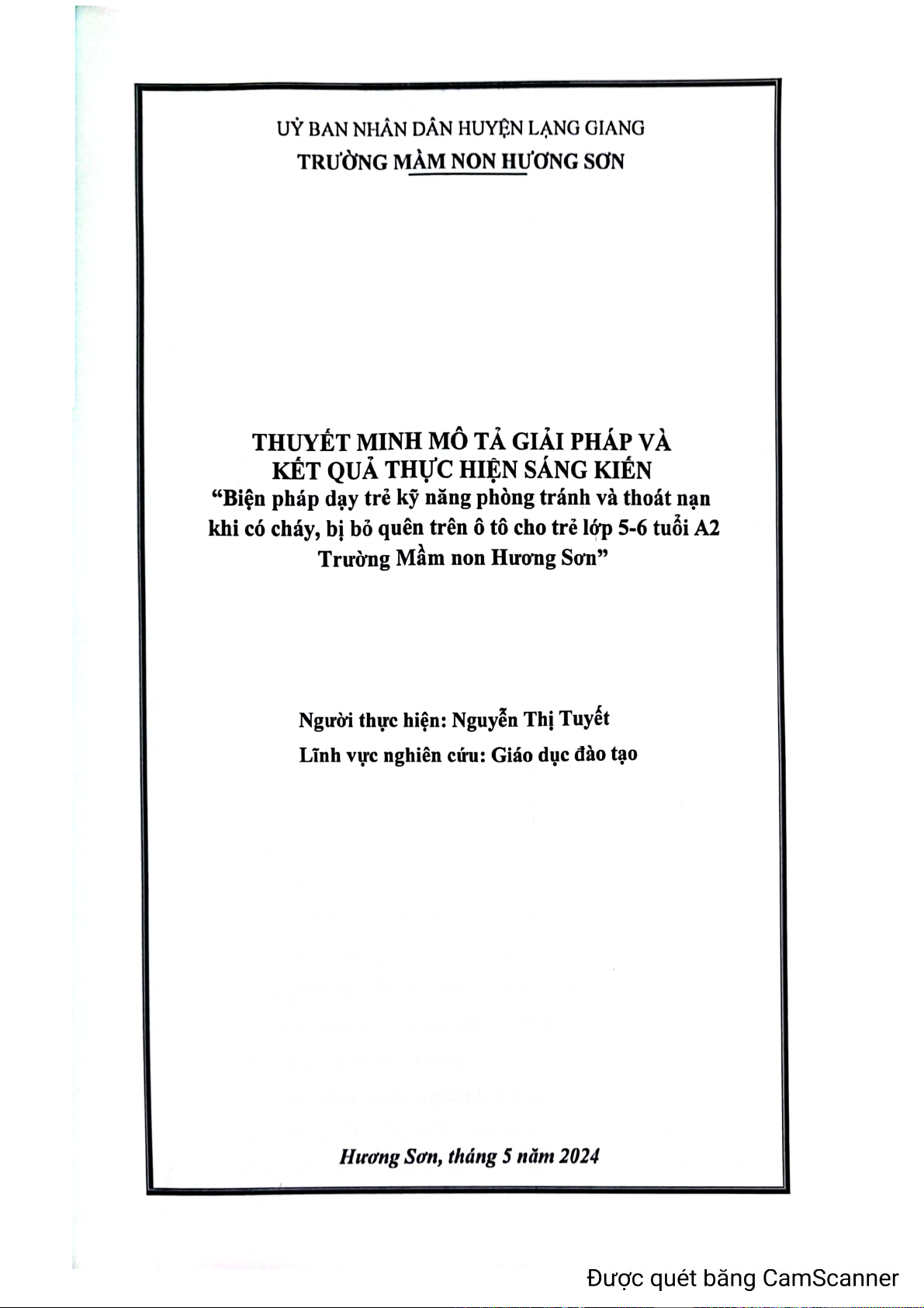 Sáng kiến tập trung vào việc giải quyết thực trạng thiếu hụt nghiêm trọng về kiến thức và kỹ năng phòng tránh, thoát nạn khi có cháy và bị bỏ quên trên ô tô ở trẻ mầm non 5-6 tuổi, cũng như ở giáo viên và phụ huynh. Tình hình khảo sát cho thấy cơ sở vật chất chưa đảm bảo, giáo viên thiếu chuyên môn, và phụ huynh chưa nhận thức đầy đủ về tầm quan trọng của việc giáo dục kỹ năng này. Để khắc phục, tác giả đề xuất một chuỗi các giải pháp toàn diện. Đầu tiên là tham mưu Ban giám hiệu nhà trường xây dựng kế hoạch chi tiết, lồng ghép nội dung giáo dục an toàn vào chương trình học mầm non. Tiếp theo là tổ chức các buổi tập huấn chuyên sâu cho giáo viên, nâng cao năng lực sư phạm và kiến thức chuyên môn về phòng cháy chữa cháy, cứu nạn cứu hộ và các biện pháp thoát hiểm. Đối với trẻ, giải pháp tập trung vào việc cung cấp kiến thức thông qua hình ảnh, video minh họa, hoạt động trải nghiệm, và các trò chơi tương tác. Các kỹ năng thực hành như kêu cứu, sử dụng khăn ướt, tìm lối thoát hiểm khi có cháy, và các hành động khi bị kẹt trong ô tô được chú trọng. Việc tích hợp các kỹ năng này vào các chủ đề, hoạt động học và chơi hàng ngày giúp trẻ ghi nhớ và vận dụng hiệu quả. Cuối cùng, sáng kiến nhấn mạnh vai trò phối hợp chặt chẽ với phụ huynh, giúp họ nâng cao nhận thức và chủ động trang bị kiến thức cho con. Việc triển khai thành công sáng kiến này hứa hẹn sẽ nâng cao đáng kể khả năng tự bảo vệ của trẻ, giảm thiểu rủi ro tai nạn và xây dựng một môi trường an toàn hơn tại trường Mầm non Hương Sơn.