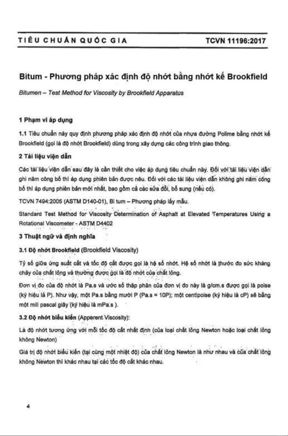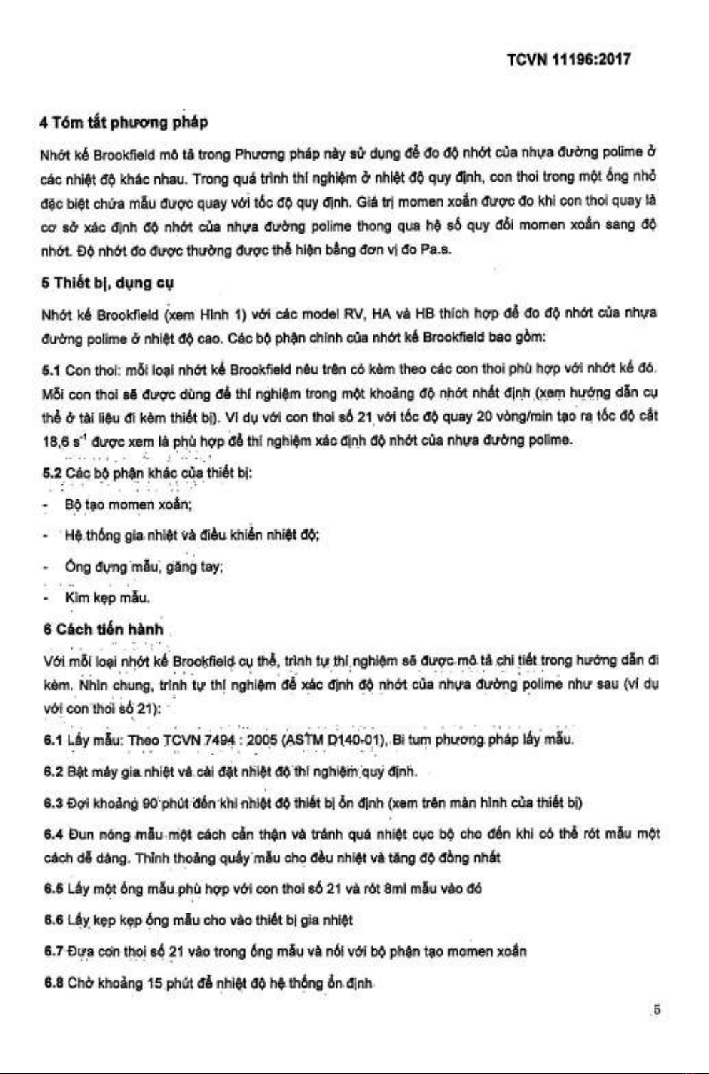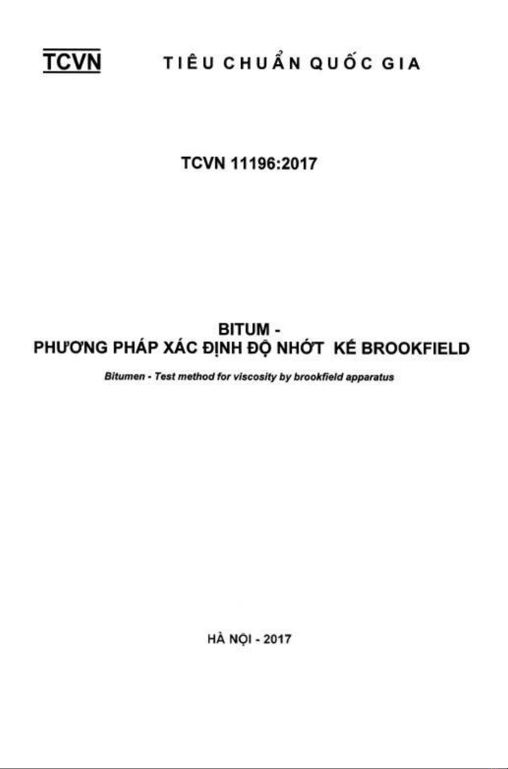 Tiêu chuẩn Quốc gia TCVN 11196:2017 quy định phương pháp xác định độ nhớt của nhựa đường polime bằng nhớt kế Brookfield (gọi là độ nhớt Brookfield) dùng trong xây dựng các công trình giao thông.