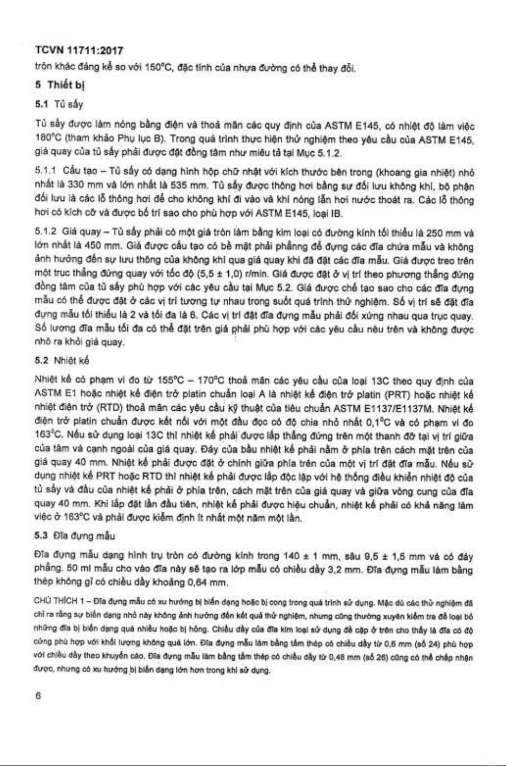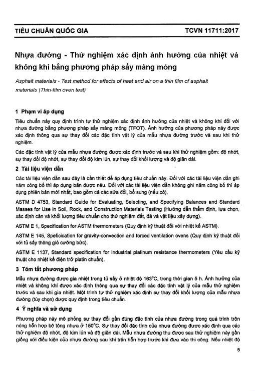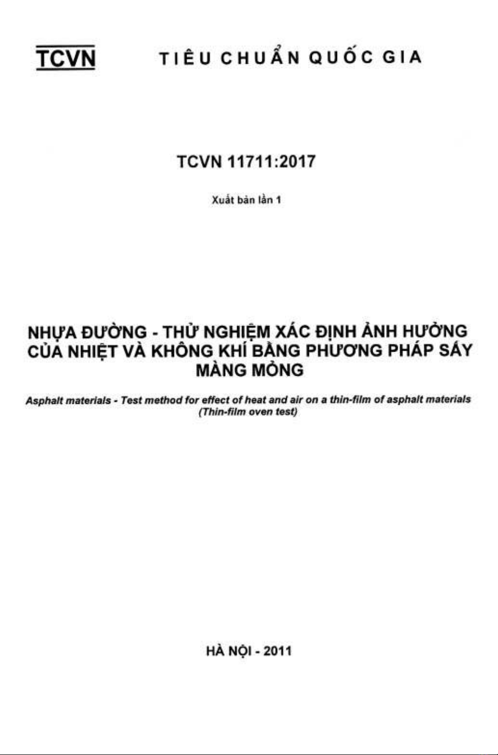 Tiêu chuẩn Quốc gia TCVN 11711:2017 quy định trình tự thử nghiệm xác định ảnh hưởng của nhiệt và không khí đối với nhựa đường bằng phương pháp sấy màng mỏng (TTFOT) Ảnh hưởng của phương pháp này được xác định thông qua sự thay đổi các đặc tính vật lý của mẫu nhựa đường trước và sau khi thử nghiệm.