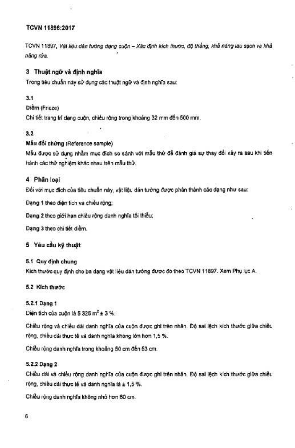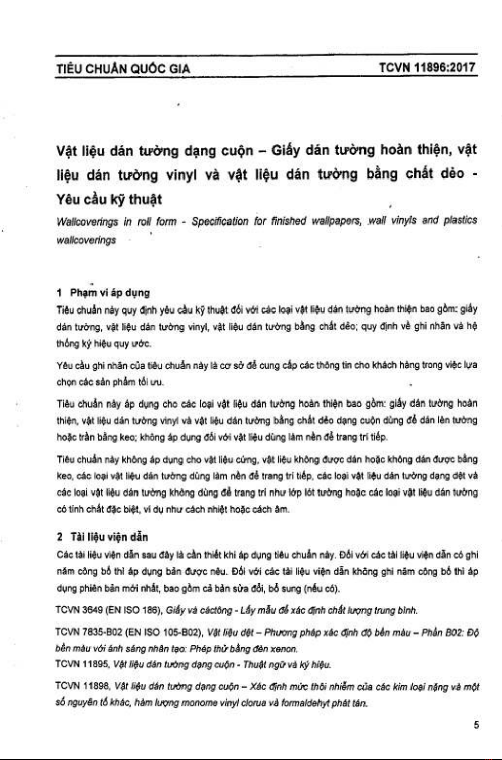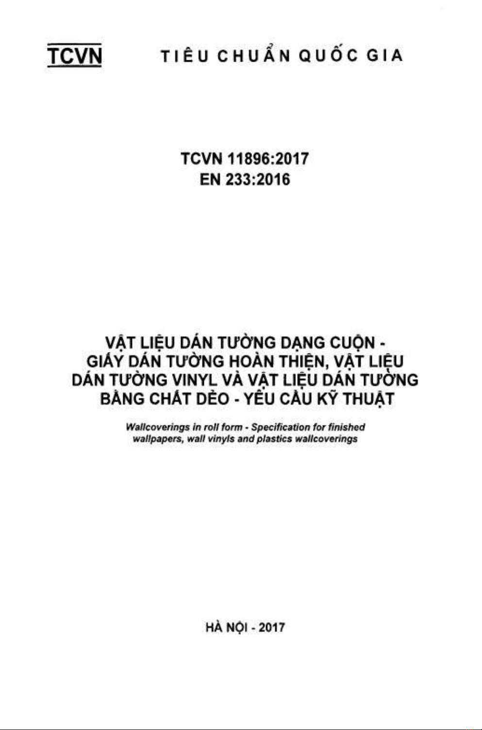 Tiêu chuẩn Quốc gia TCVN 11896:2017 quy định yêu cầu kỹ thuật đối với các loại vật liệu dán tường hoàn thiện bao gồm: giấy dán tường, vật liệu dán tường vinyl, vật liệu dán tường bằng chất dẻo; quy định về ghi nhãn và hệ thống ký hiệu quy ước. Yêu cầu ghi nhãn của tiêu chuẩn này là cơ sở để cung cấp các thông tin cho khách hàng trong việc lựa chọn các sản phẩm tối ưu.