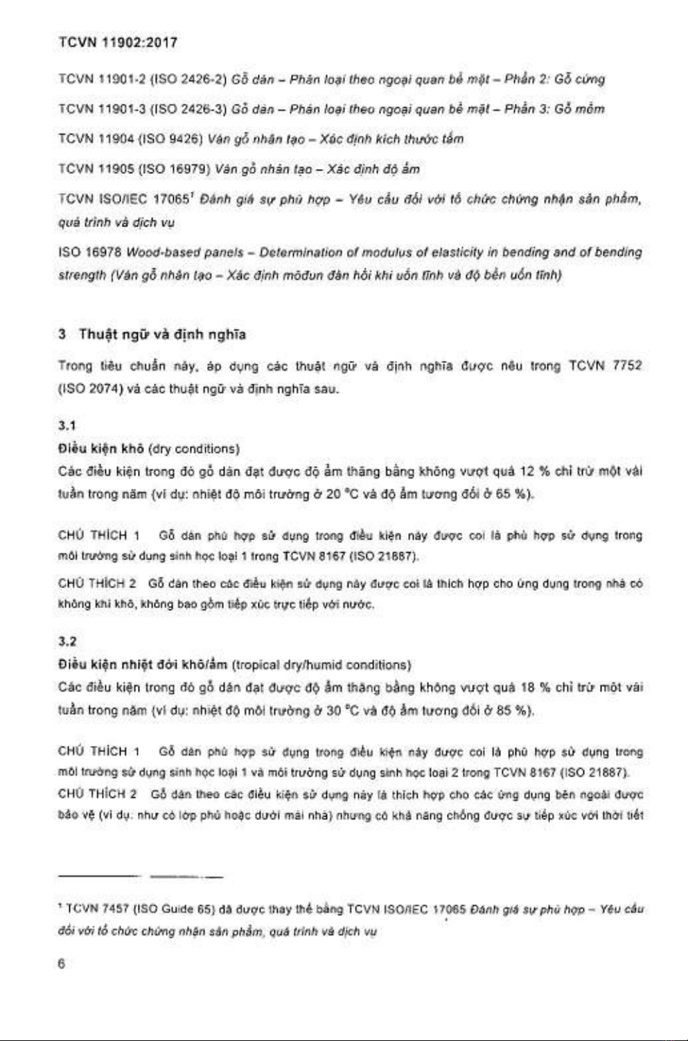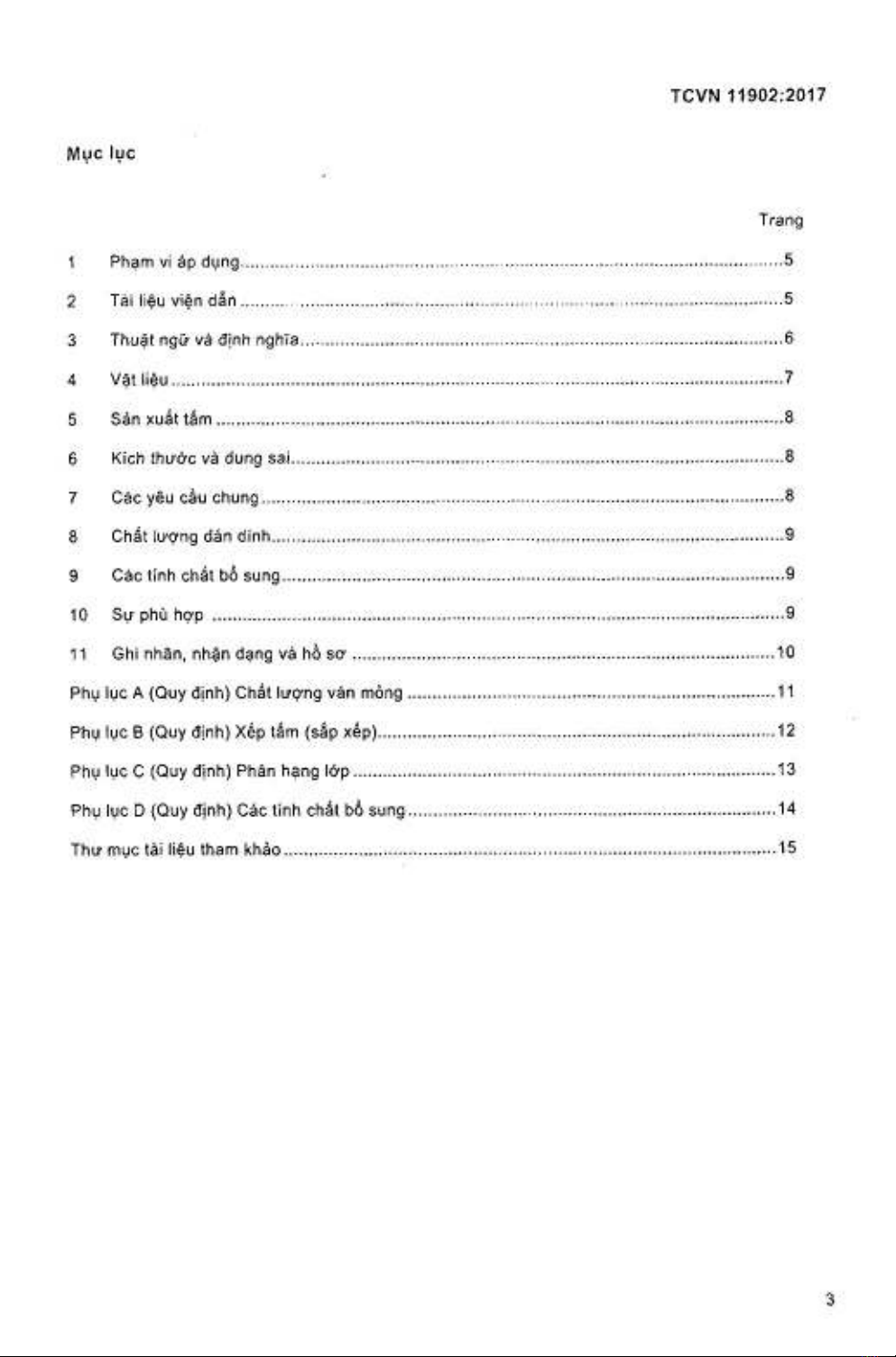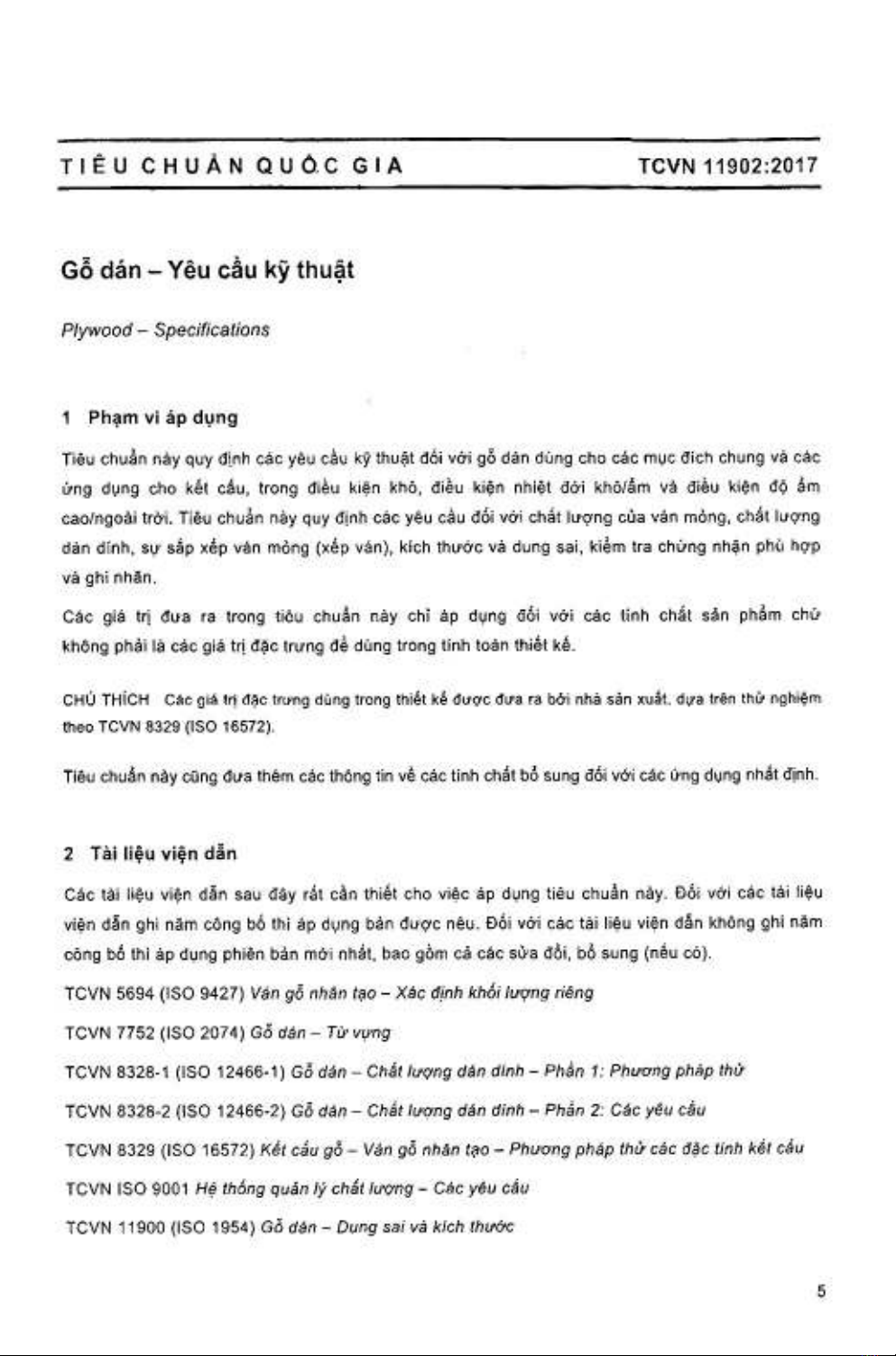 Tiêu chuẩn Quốc gia TCVN 11902:2017 quy định các yêu cầu kỹ thuật đối với gỗ dán dùng cho các mục đích chung và các ứng dụng cho kết cấu, trong điều kiện khô, điều kiện nhiệt đới khô/ẩm và điều kiện độ ẩm cao/ngoài trời. Tiêu chuẩn này quy định các yêu cầu đối với chất lượng của ván mỏng, chất lượng dán dính, sự sắp xếp ván mỏng (xếp ván), kích thước và dung sai, kiểm tra chứng nhận phù hợp và ghi nhãn.
