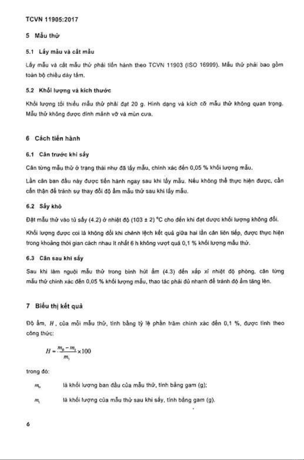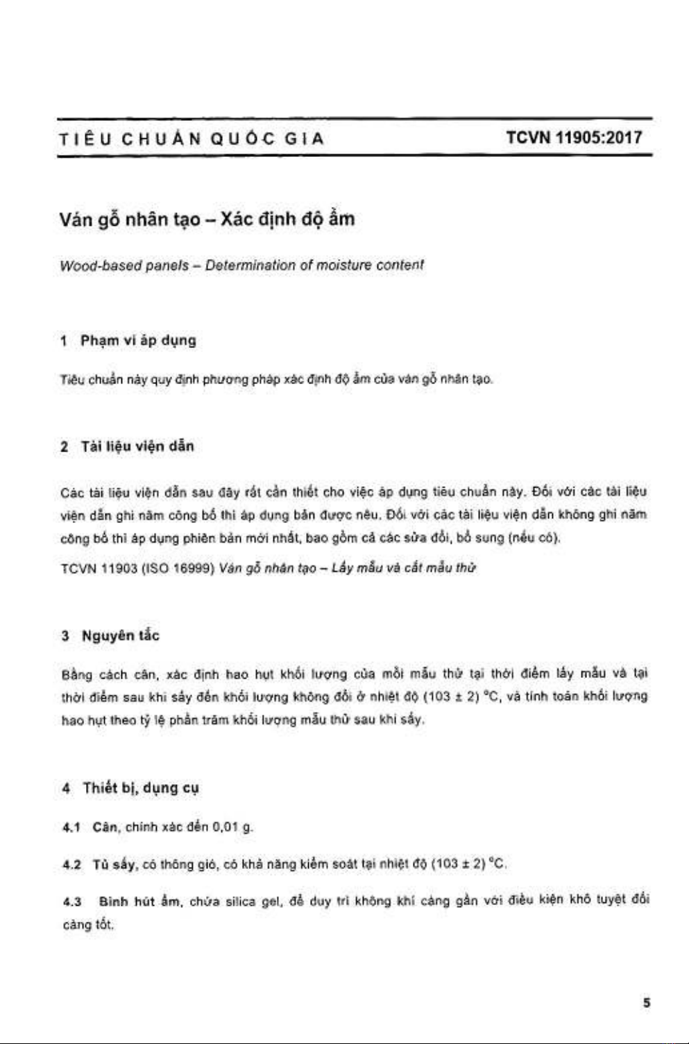 Tiêu chuẩn Quốc gia TCVN 11905:2017 quy định phương pháp xác định độ ẩm của ván gỗ nhân tạo. Bằng cách cân, xác định hao hụt khối lượng của mỗi mẫu thử tại thời điểm lấy mẫu và tại thời điểm sau khi sấy đến khối lượng không đổi ở nhiệt độ (103±2)°C, và tính toán khối lượng hao hụt theo tỷ lệ phần trăm khối lượng mẫu thử sau khi sấy.