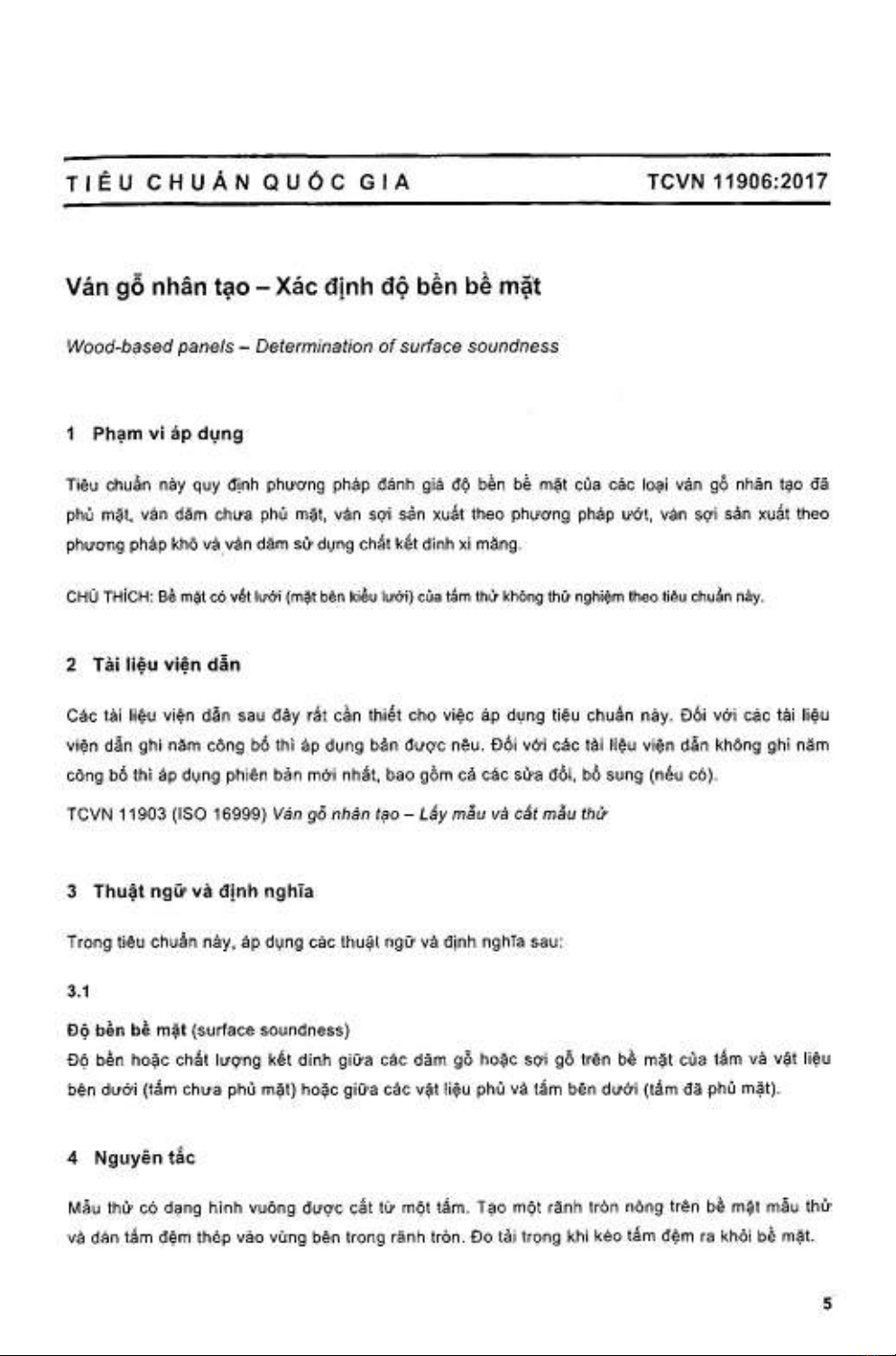 Tiêu chuẩn Quốc gia TCVN 11906:2017 quy định phương pháp đánh giá độ bền bề mặt của các loại ván gỗ nhân tạo đã phủ mặt, ván dăm chưa phủ mặt, ván sợi sản xuất theo phương pháp ướt, ván sợi sản xuất theo phương pháp khô và ván dăm sử dụng hết chất kết dính xi măng.