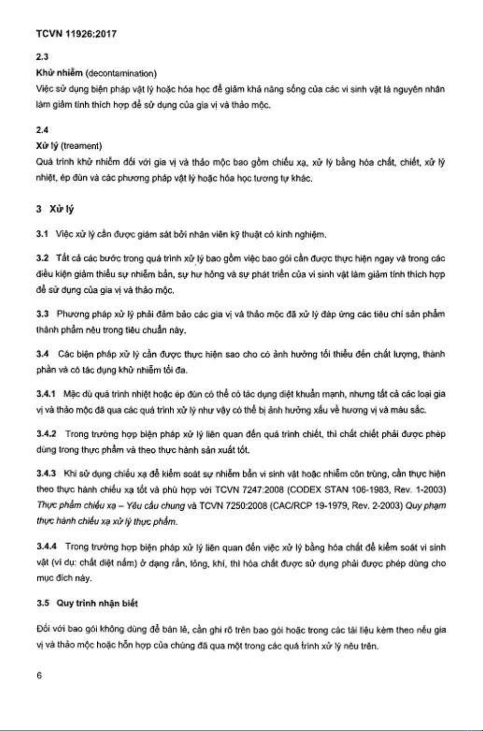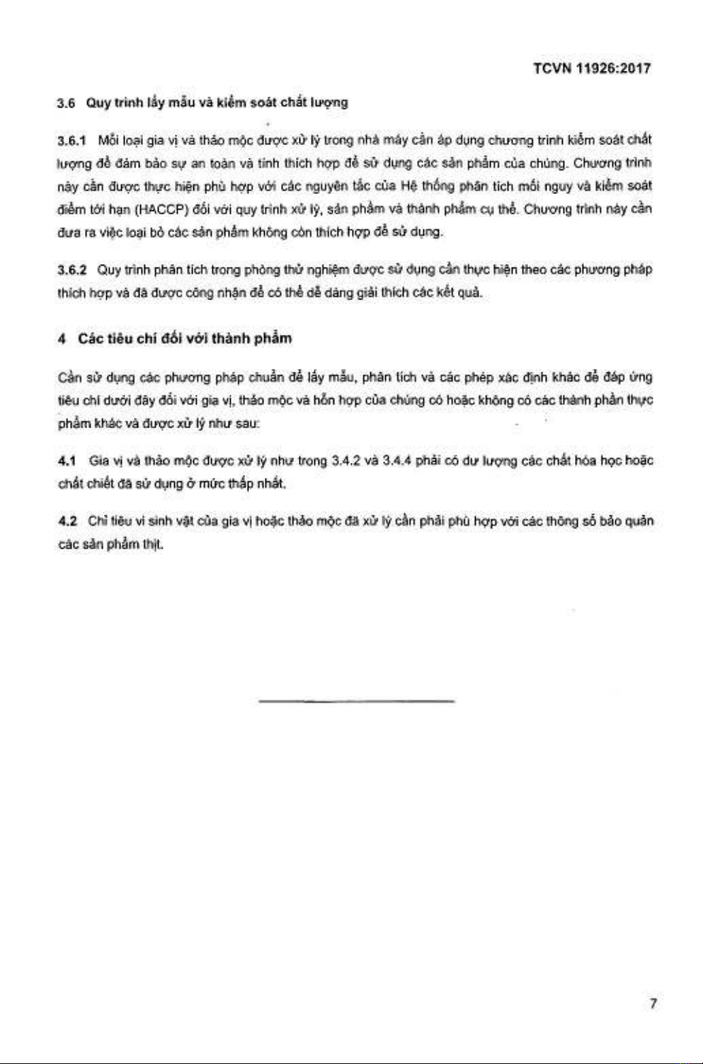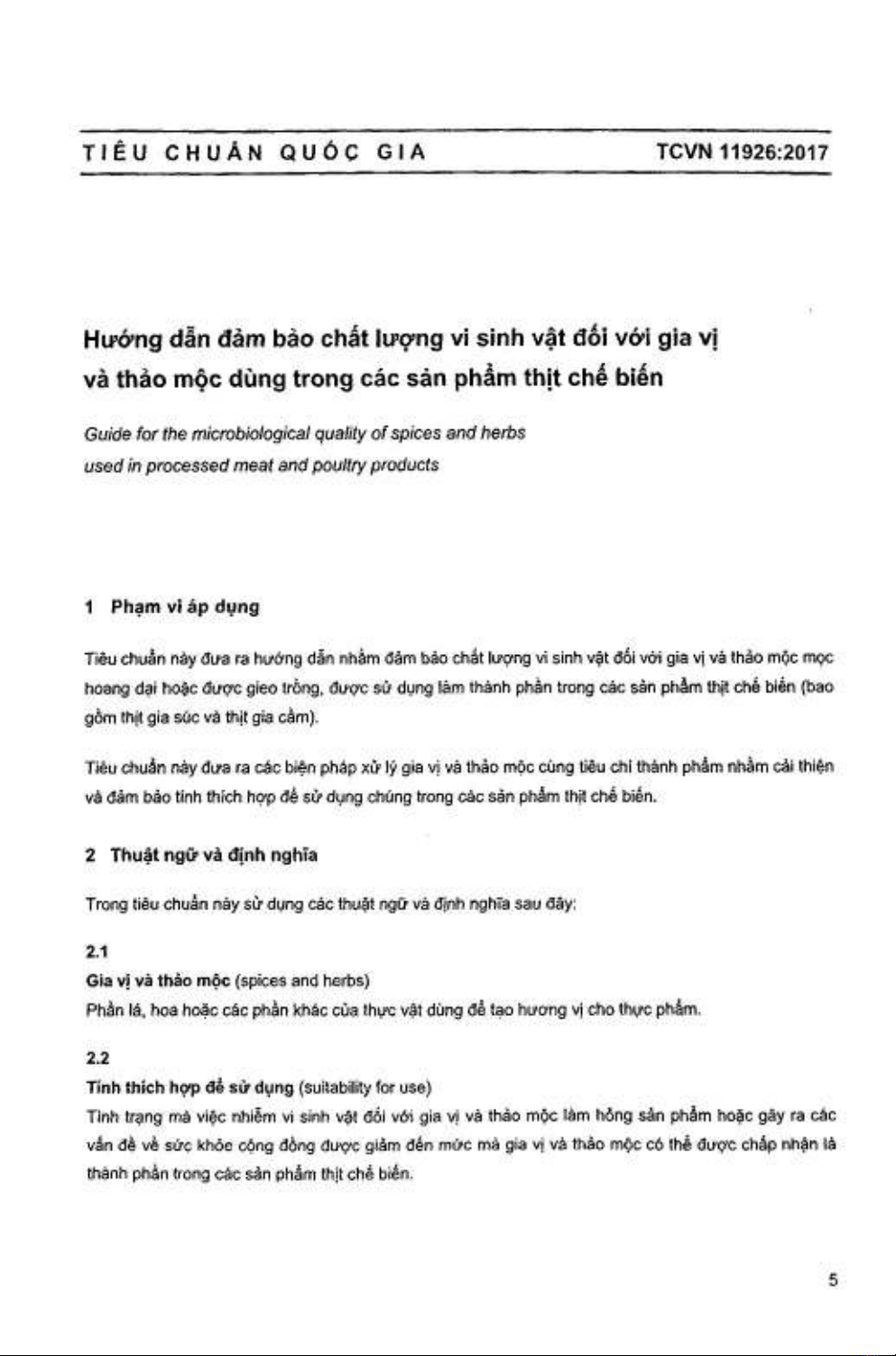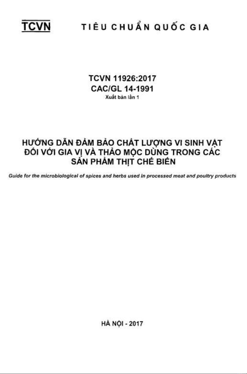 Tiêu chuẩn Quốc gia TCVN 11926:2017 đưa ra hướng dẫn nhằm đảm bảo chất lượng vi sinh vật đối với gia vị và thảo mộc mọc hoang dại hoặc được gieo trồng, được sử dụng làm thành phần trong các sản phẩm thịt chế biến (bao gồm thịt gia súc và thịt gia cầm). Tiêu chuẩn này đưa ra các biện pháp xử lý gia vị và thảo mộc cùng tiêu chí thành phẩm nhằm cải thiện và đảm bảo tính thích hợp để sử dụng chúng trong các sản phẩm thịt chế biến.