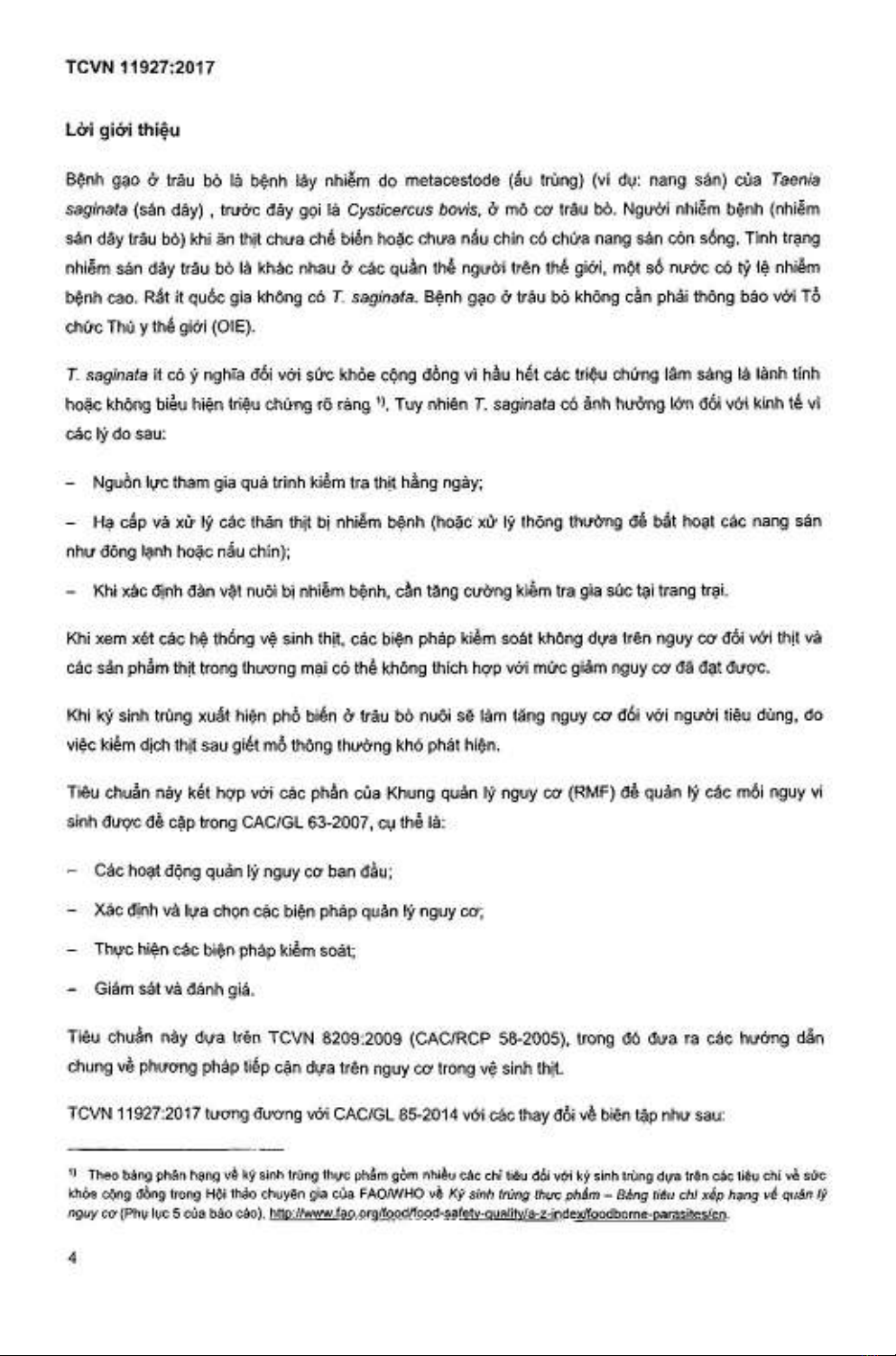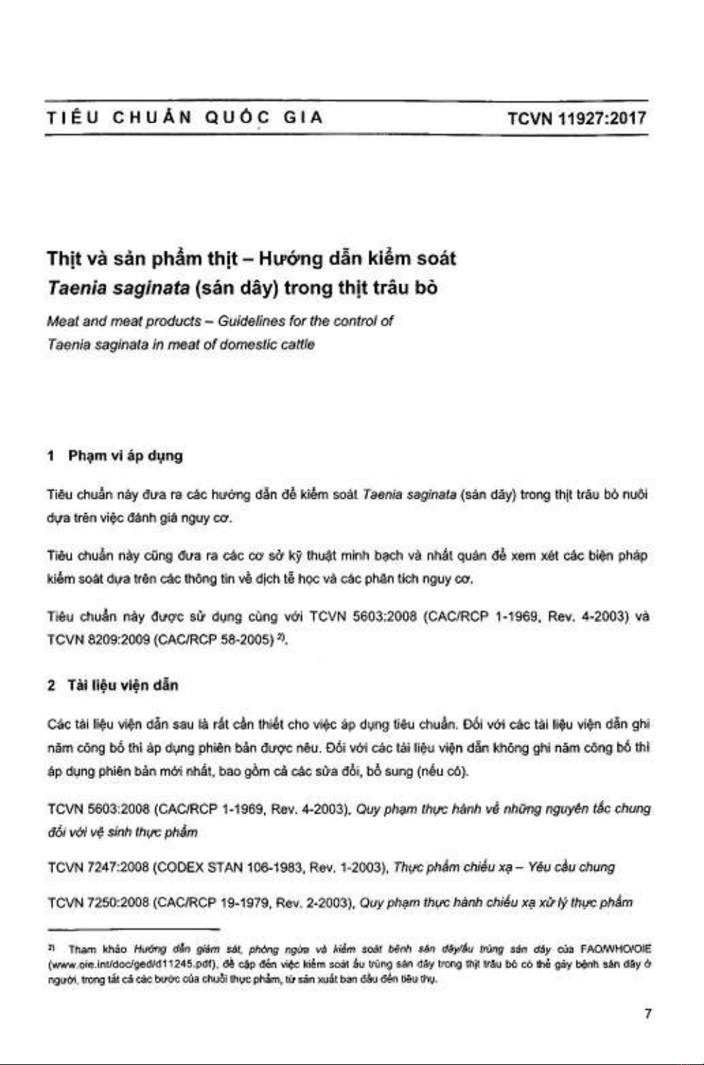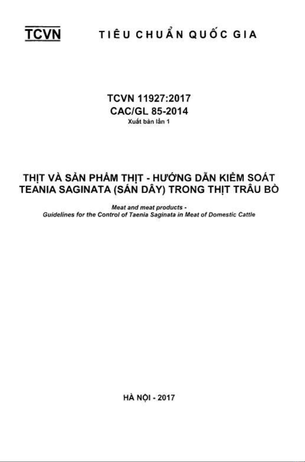 Tiêu chuẩn Quốc gia TCVN 11927:2017 đưa ra các hướng dẫn để kiểm soát Taenia saginata (sán dây) trong thịt trâu bò nuôi dựa trên việc đánh giá nguy cơ. Tiêu chuẩn này cũng đưa ra các cơ sở kỹ thuật minh bạch và nhất quán để xem xét các biện pháp kiểm soát dựa trên các thông tin về dịch tễ học và các phân tích nguy cơ.
