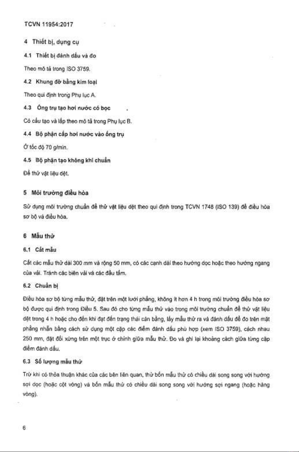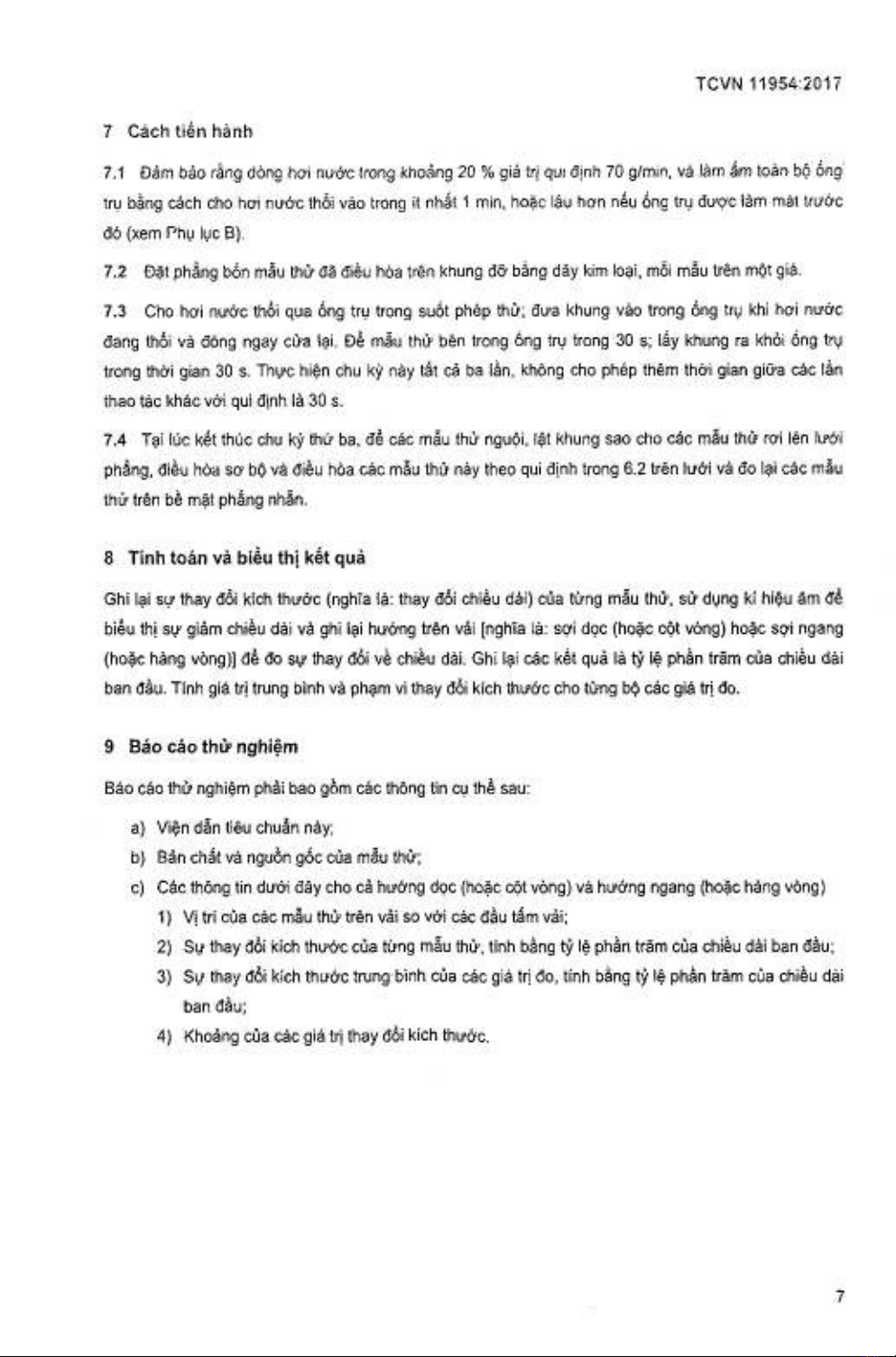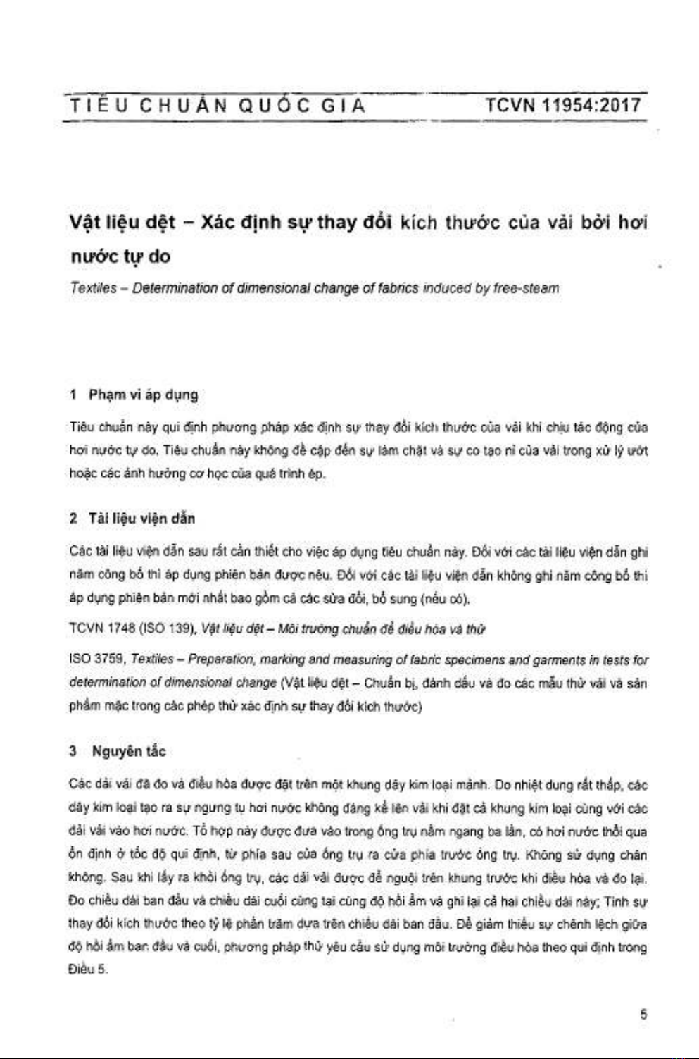 Tiêu chuẩn Quốc gia TCVN 11954:2017 qui định phương pháp xác định sự thay đổi kích thước của vải khi chịu tác động của hơi nước tự do. Tiêu chuẩn này không đề cập đến sự làm chặt và sự co tạo nỉ của vải trong xử lý ướt hoặc các ảnh hưởng cơ học của quá trình ép.