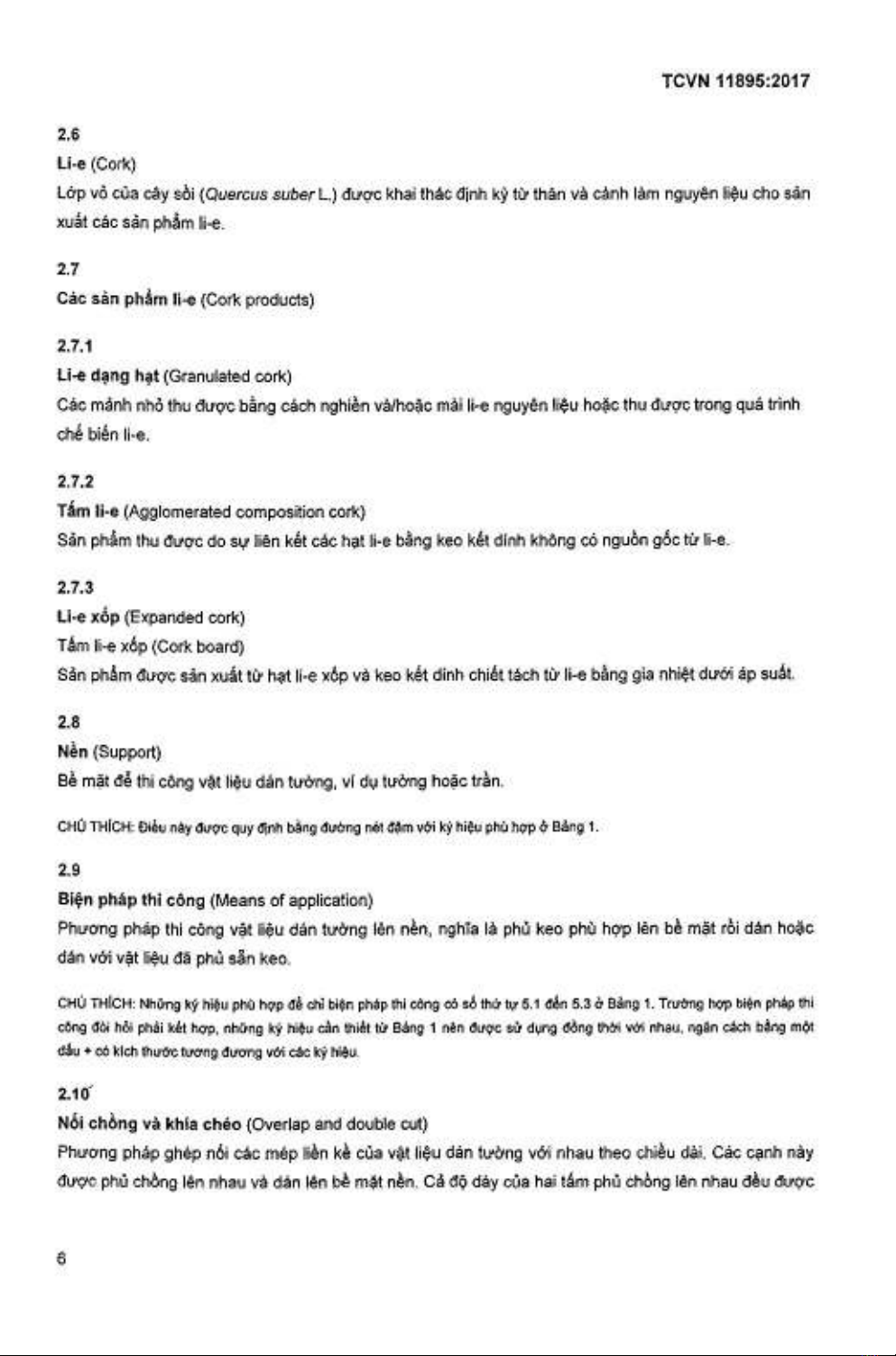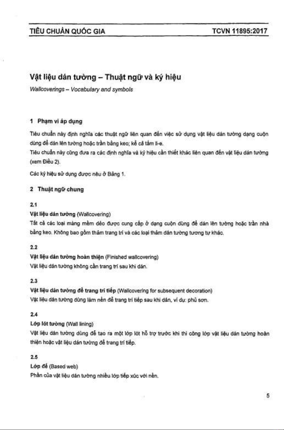 Tiêu chuẩn Quốc gia TCVN 11985:2017 định nghĩa các thuật ngữ liên quan đến việc sử dụng vật liệu dán tường dạng cuộn dùng để dán lên tường hoặc trần bằng keo; kể cả tấm li-e. Tiêu chuẩn này cũng đưa ra các định nghĩa và ký hiệu cần thiết khác liên quan đến vặt liệu dán tường (xem Điều 2). Các ký hiệu sử dụng được nêu ở Bảng 1.