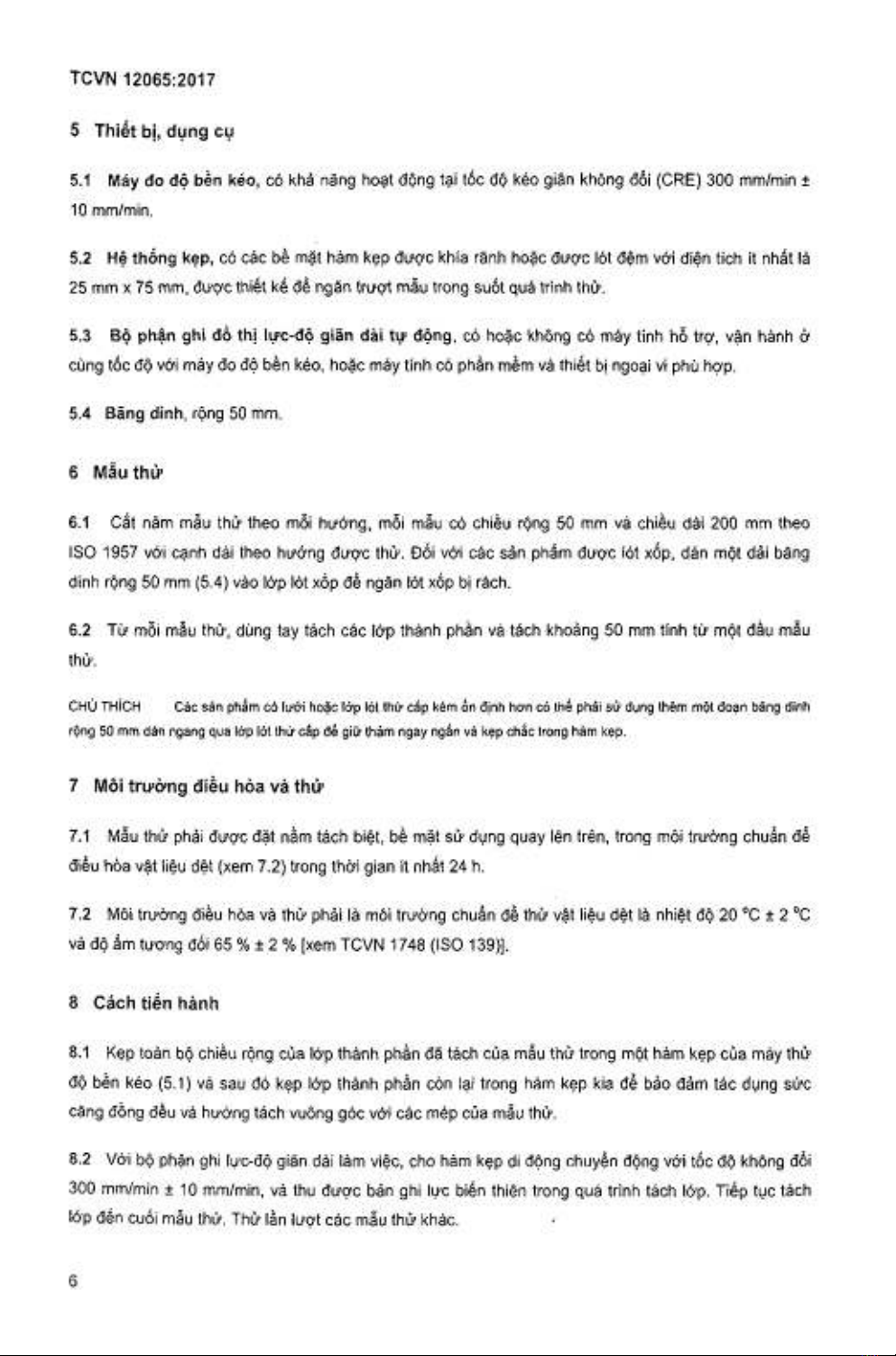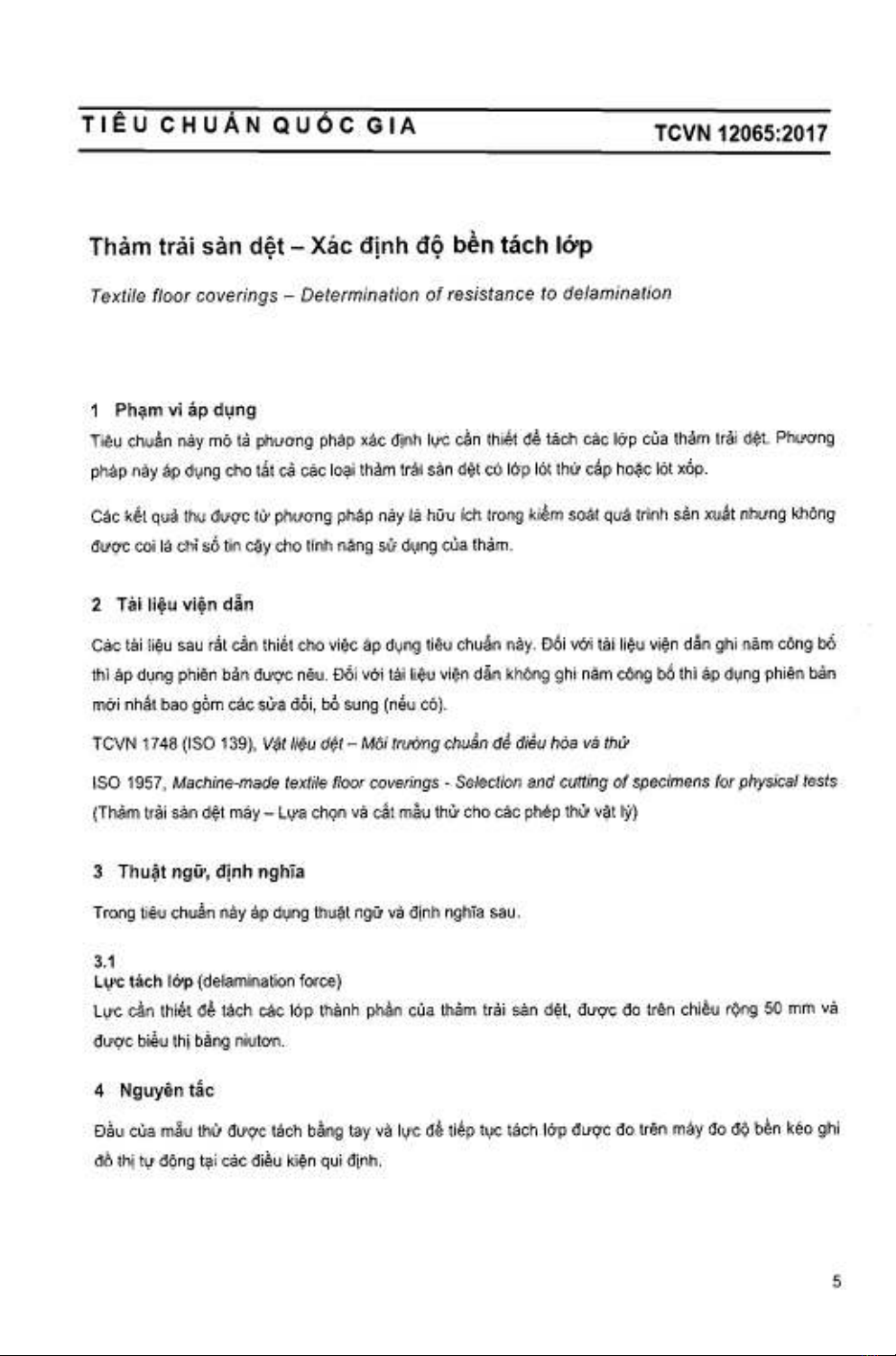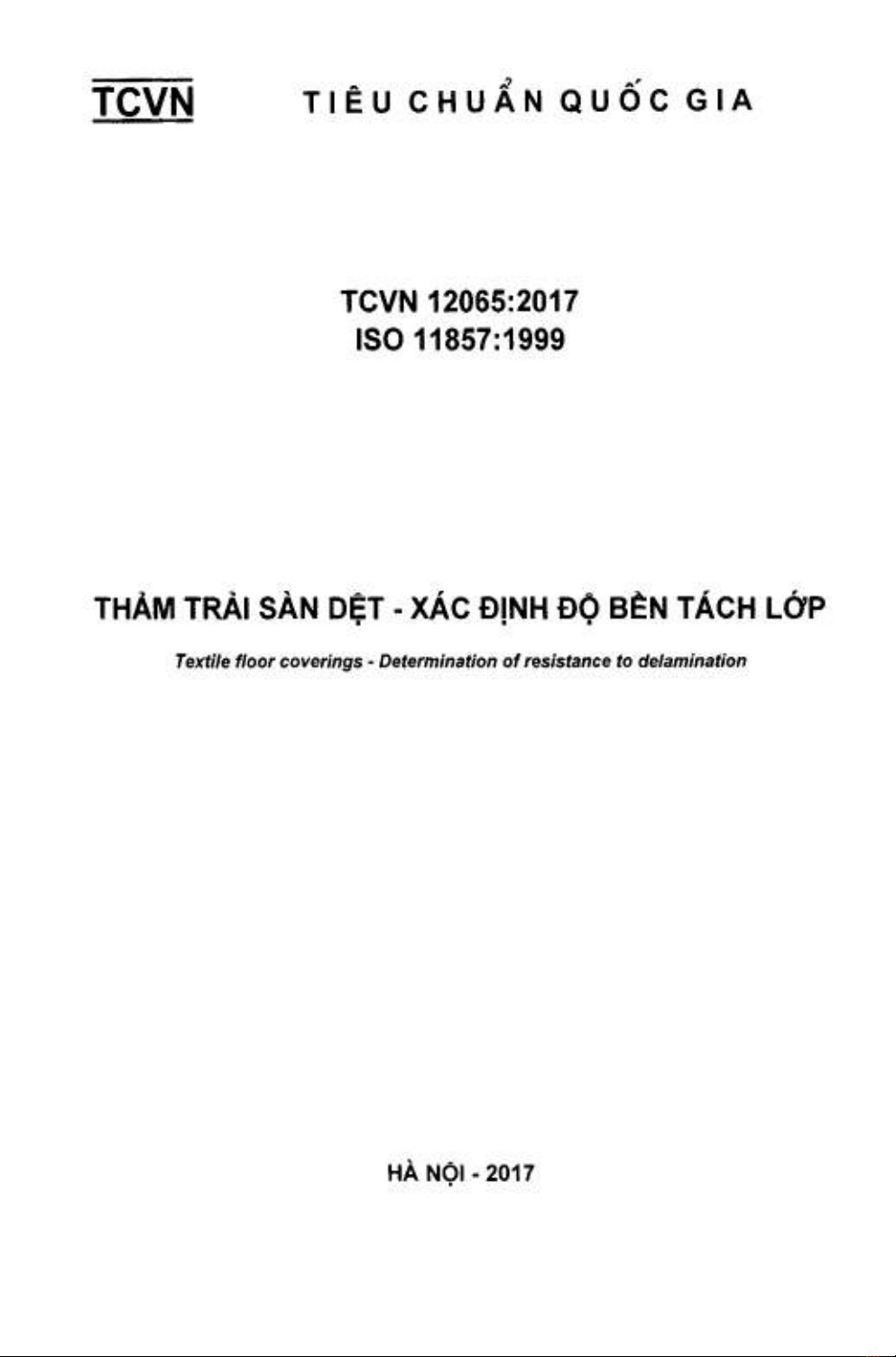 Tiêu chuẩn Quốc gia TCVN 12065:2017 mô tả phương pháp xác định lực cần thiết để tách các lớp của thảm trải dệt. Phương pháp này áp dụng cho tất cả các loại thảm trải sàn dệt có lớp lót thứ cấp hoặc lót xốp. Các kết quả thu được từ phương pháp này là hữu ích trong kiểm soát quá trình sản xuất nhưng không được coi là chỉ số tin cậy cho tính năng sử dụng của thảm.