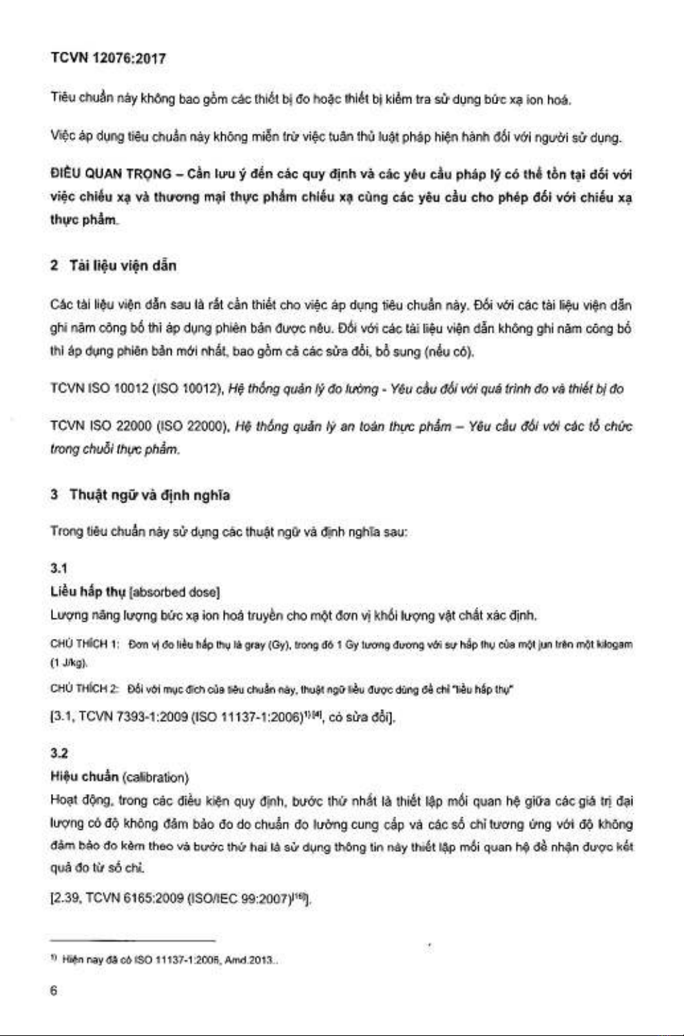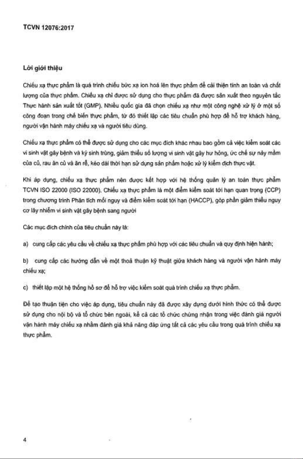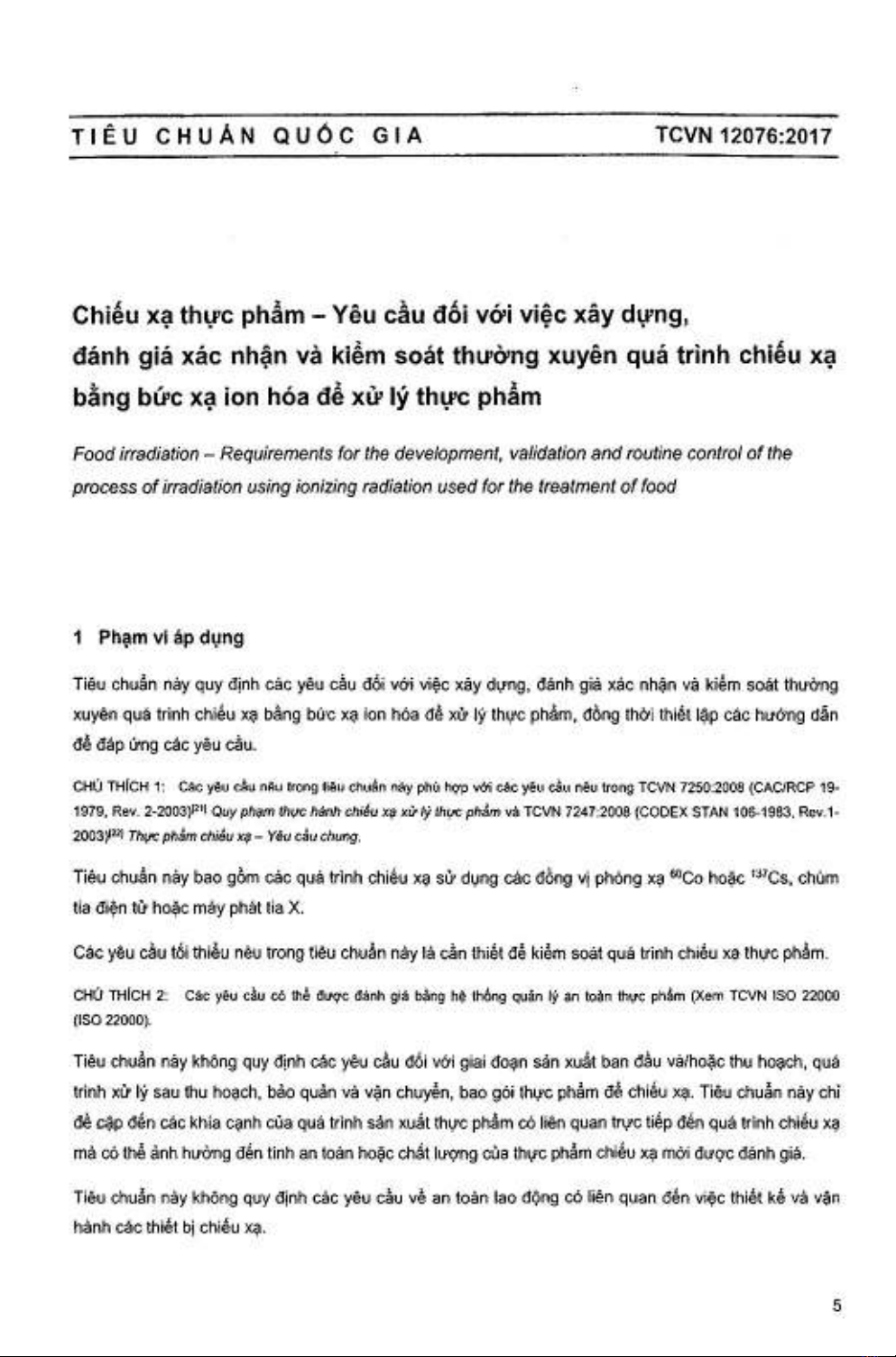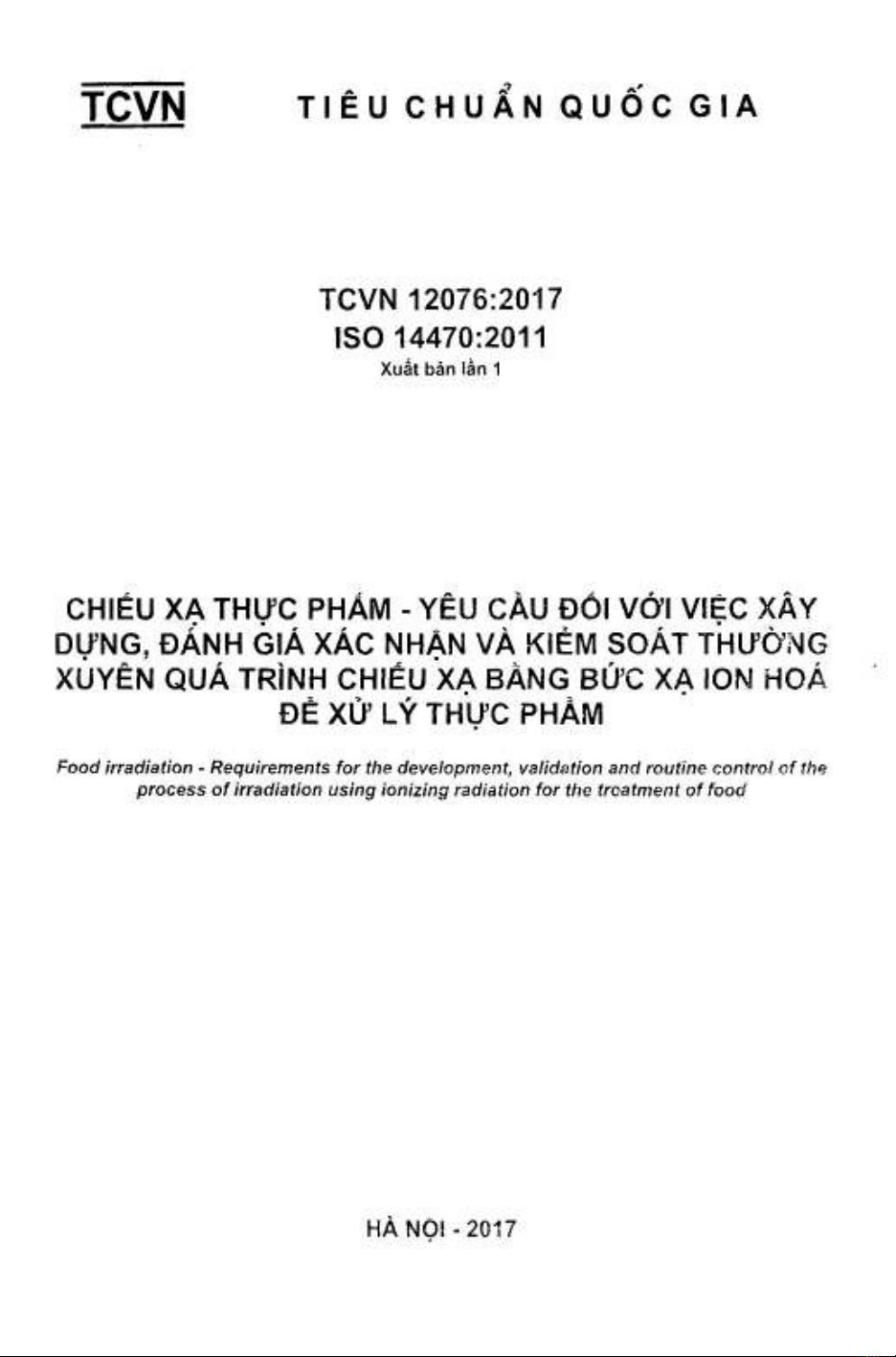 Tiêu chuẩn Quốc gia TCVN 12076:2017 quy định các yêu cầu đối với việc xây dựng, đánh giá xác nhận và kiểm soát thường xuyên quá trình chiếu xạ bằng bức xạ ion hóa để xử lý thực phẩm, đồng thời thiết lập các hướng dẫn để đáp ứng các yêu cầu. Tiêu chuẩn này bao gồm các quá trình chiếu xạ sử dụng các đồng vị phóng xạ 60Co hoặc 137Cs, chùm tia điện từ hoặc máy phát tia X. Mời các bạn cùng tham khảo.