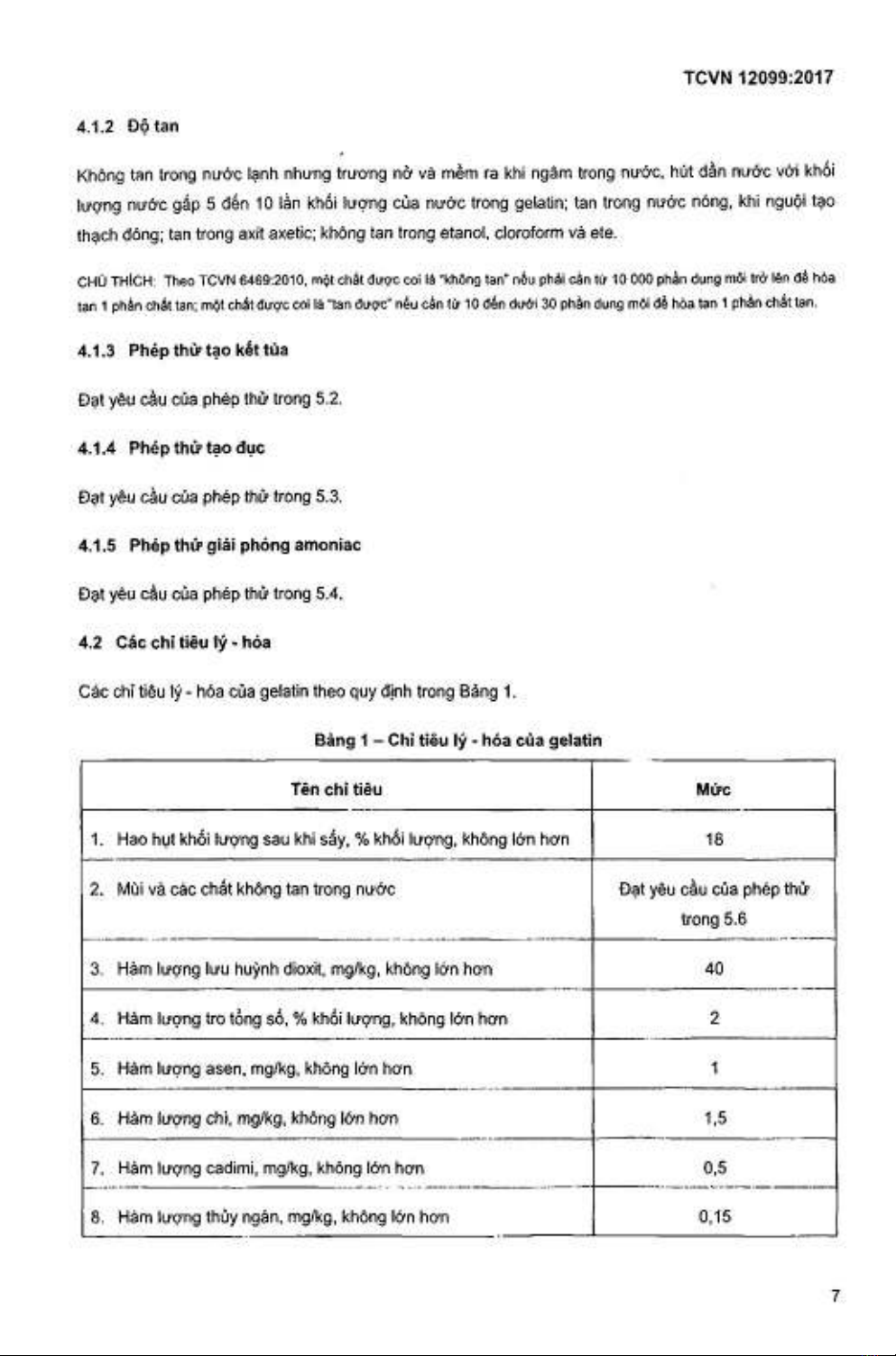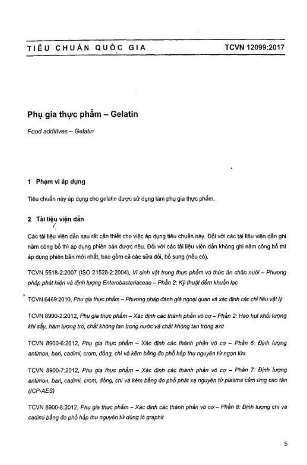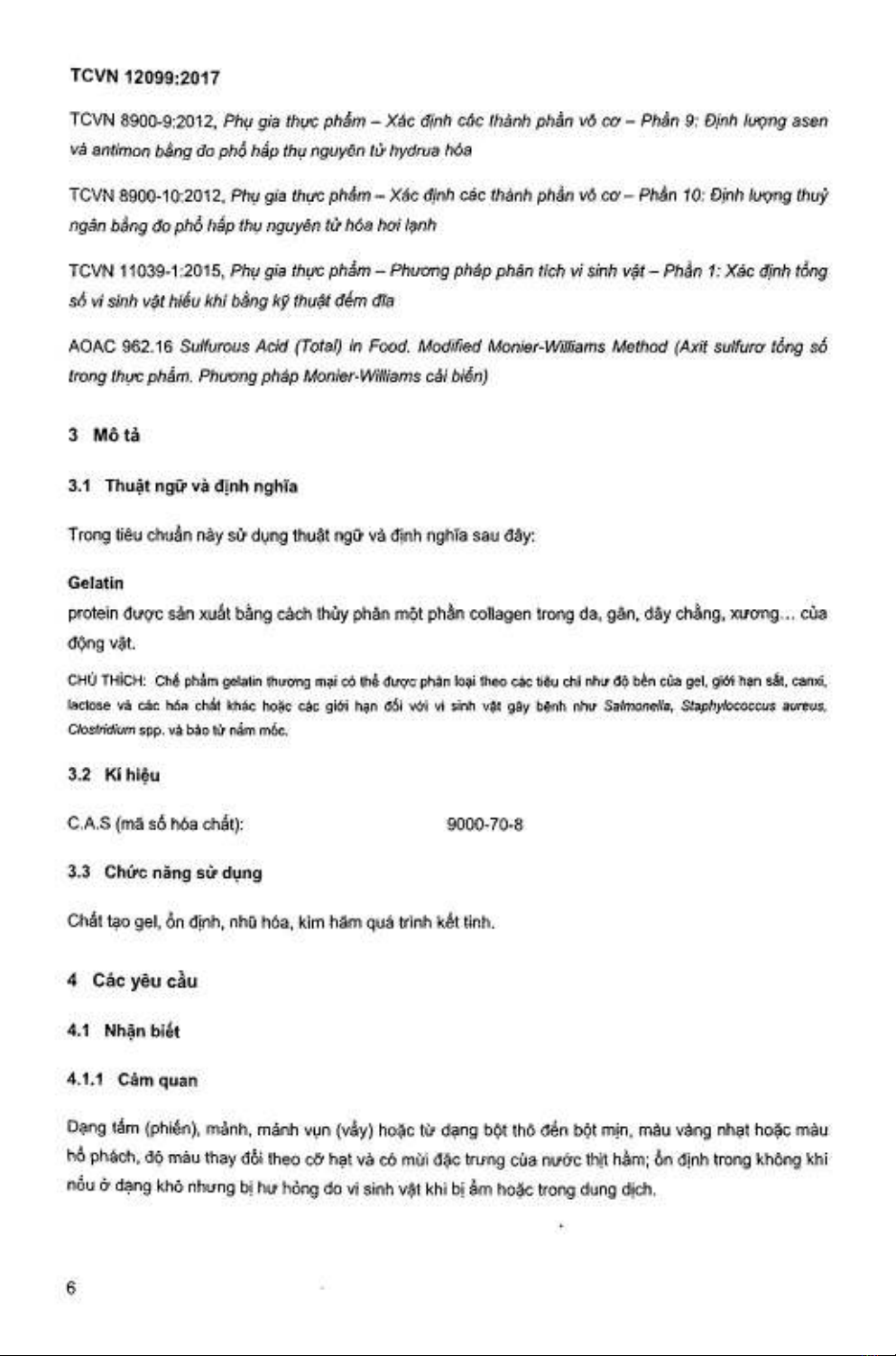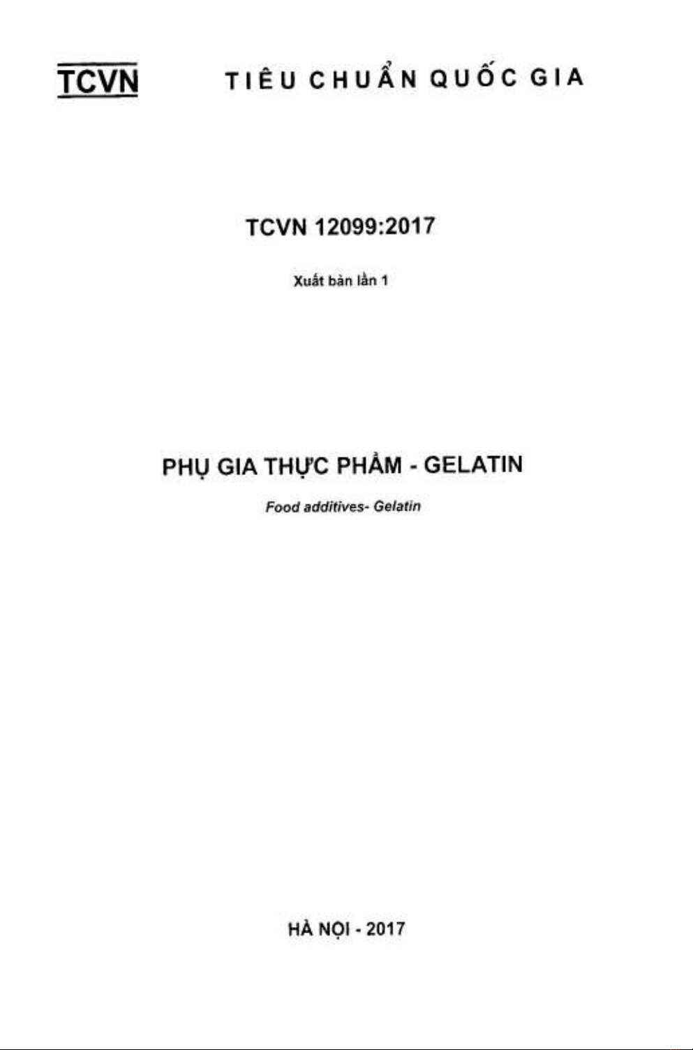 Gelatin là protein được sản xuất bằng cách thủy phân một phần collagen trong da, gân, dây chằng, xương,... của động vật. Tiêu chuẩn Quốc gia TCVN 12099:2017 áp dụng cho gelatin được sử dụng làm phụ gia thực phẩm. Mời các bạn cùng tham khảo.