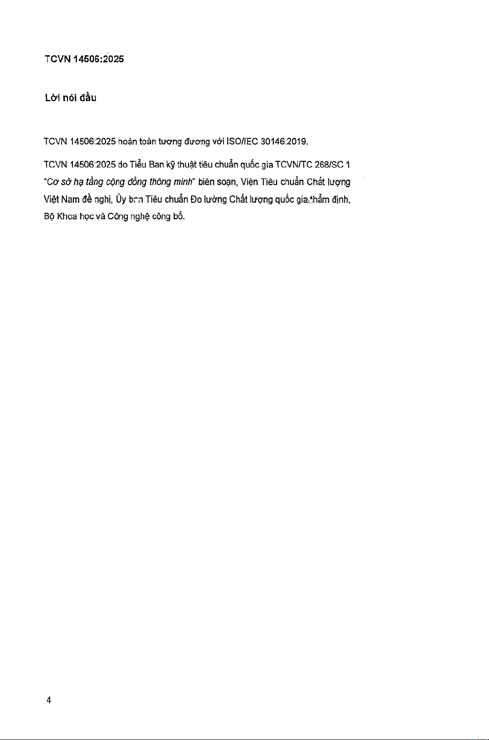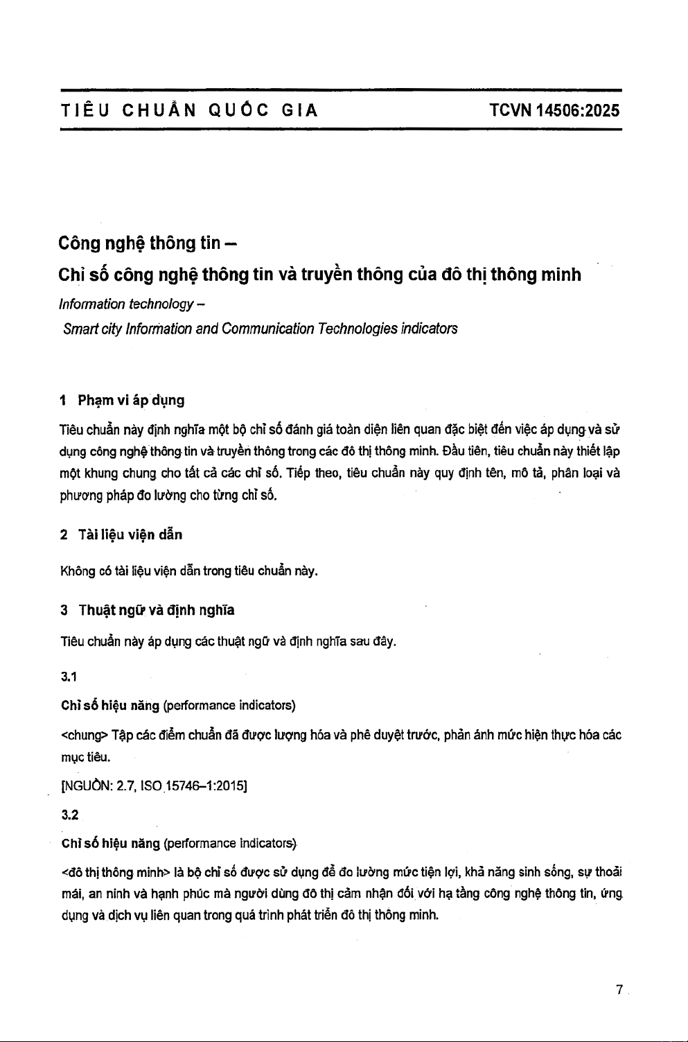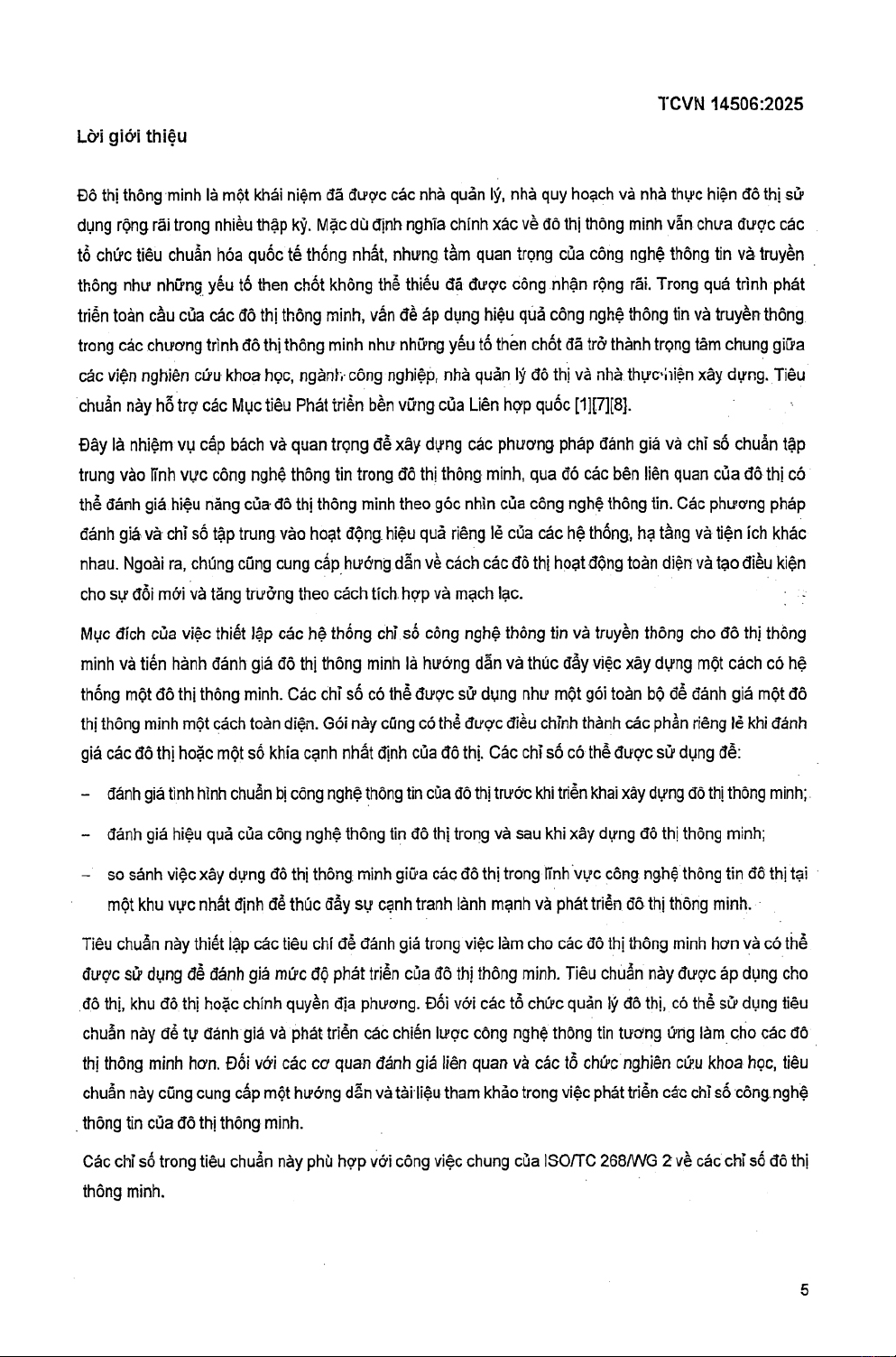 Tiêu chuẩn TCVN 14506:2025 (ISO/IEC 30146:2019) thiết lập một hệ thống chỉ số toàn diện để đánh giá việc áp dụng và sử dụng công nghệ thông tin và truyền thông trong các đô thị thông minh. Tài liệu này cung cấp một khung chung để phân loại, mô tả và xác định phương pháp đo lường cho từng chỉ số, bao gồm các chỉ số hiệu năng và chỉ số năng lực. Các chỉ số hiệu năng tập trung vào dịch vụ công dân, quản trị hiệu quả và môi trường đáng sống, trong khi các chỉ số năng lực bao gồm tiện ích thông minh, tài nguyên thông tin và an ninh mạng. Phương pháp tiếp cận của tiêu chuẩn này nhấn mạnh tính rõ ràng, khoa học, hợp lý và khả năng cập nhật liên tục của các chỉ số. Việc áp dụng các chỉ số này cho phép các đô thị tự đánh giá mức độ phát triển, so sánh với các đô thị khác để thúc đẩy cạnh tranh lành mạnh, và phát triển các chiến lược ICT hiệu quả. Tiêu chuẩn này có giá trị ứng dụng cao cho các tổ chức quản lý đô thị, cơ quan đánh giá và viện nghiên cứu, cung cấp một công cụ thiết yếu để đo lường và cải thiện chất lượng cuộc sống đô thị, đồng thời hỗ trợ sự đổi mới và tăng trưởng tích hợp trong quá trình xây dựng đô thị thông minh.