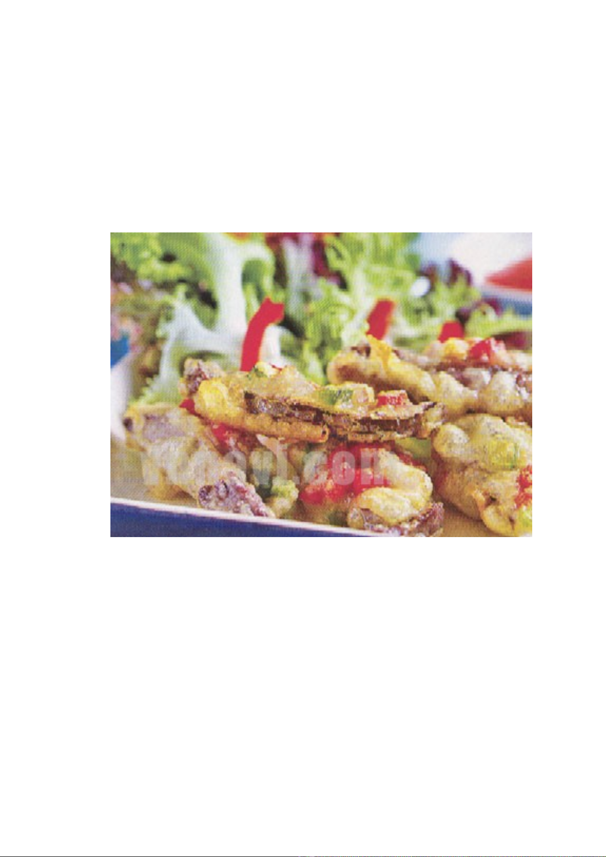 - Nhúng tim vào bột, xếp rau củ lên trên, thái vào chảo dầu, rán vàng.