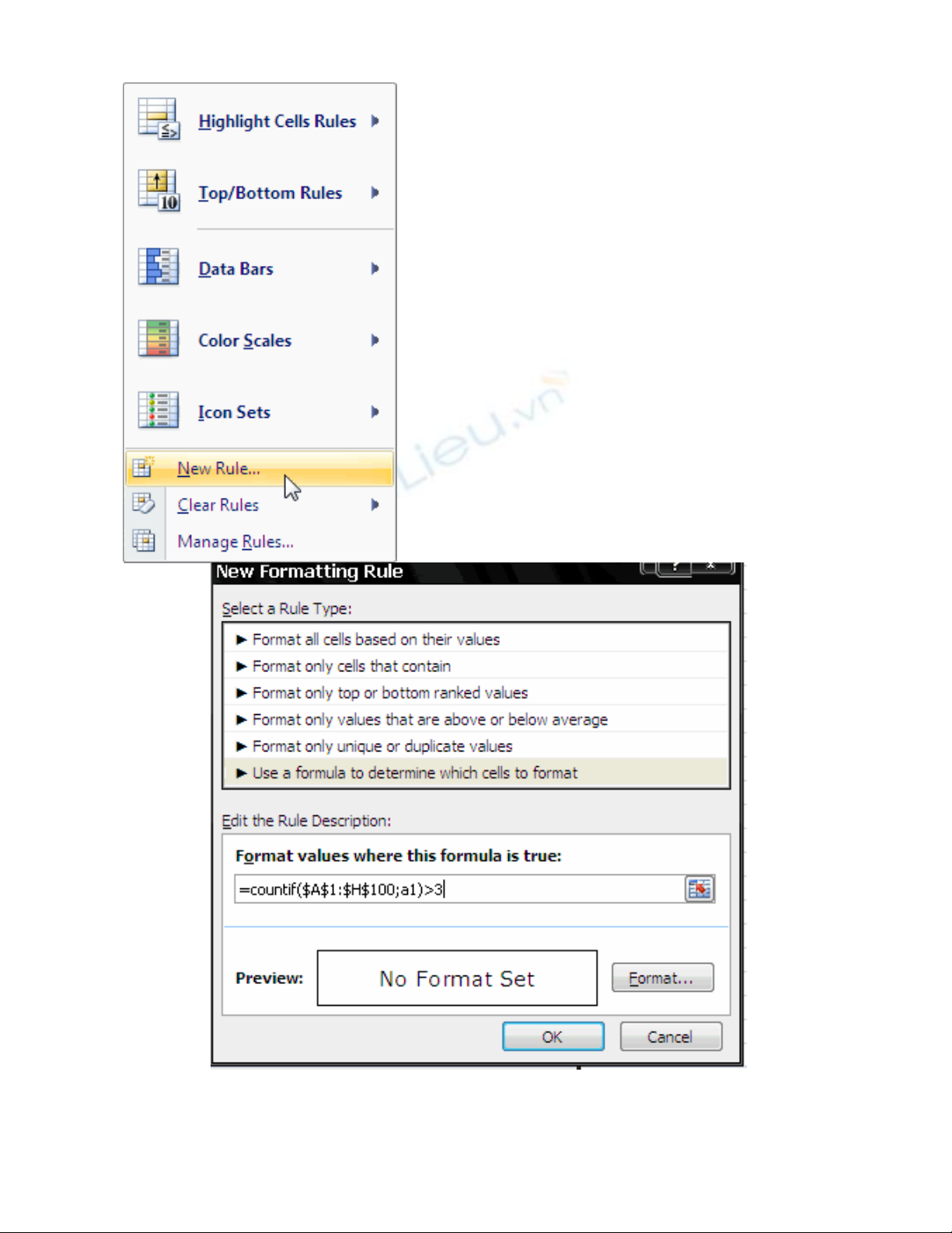 Nhấn New Rule (trong Excel 2003 chọn vào điều kiện thứ 2), làm tiếp 1 điều kiện, lần này công