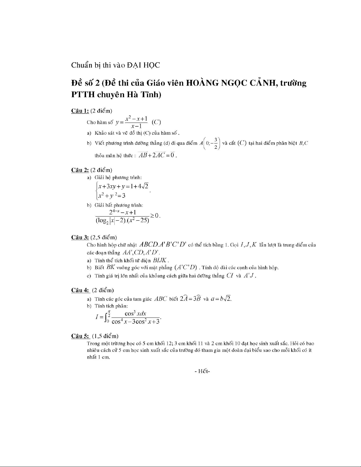 toán thi vào đại học (đề 3) sưu tầm từ internet Đề thi chuẩn bị vào đại học Đề số 2 của giáo viên Hoàng Ngọc Cảnh, trường PTTH chuyên Hà Tĩnh