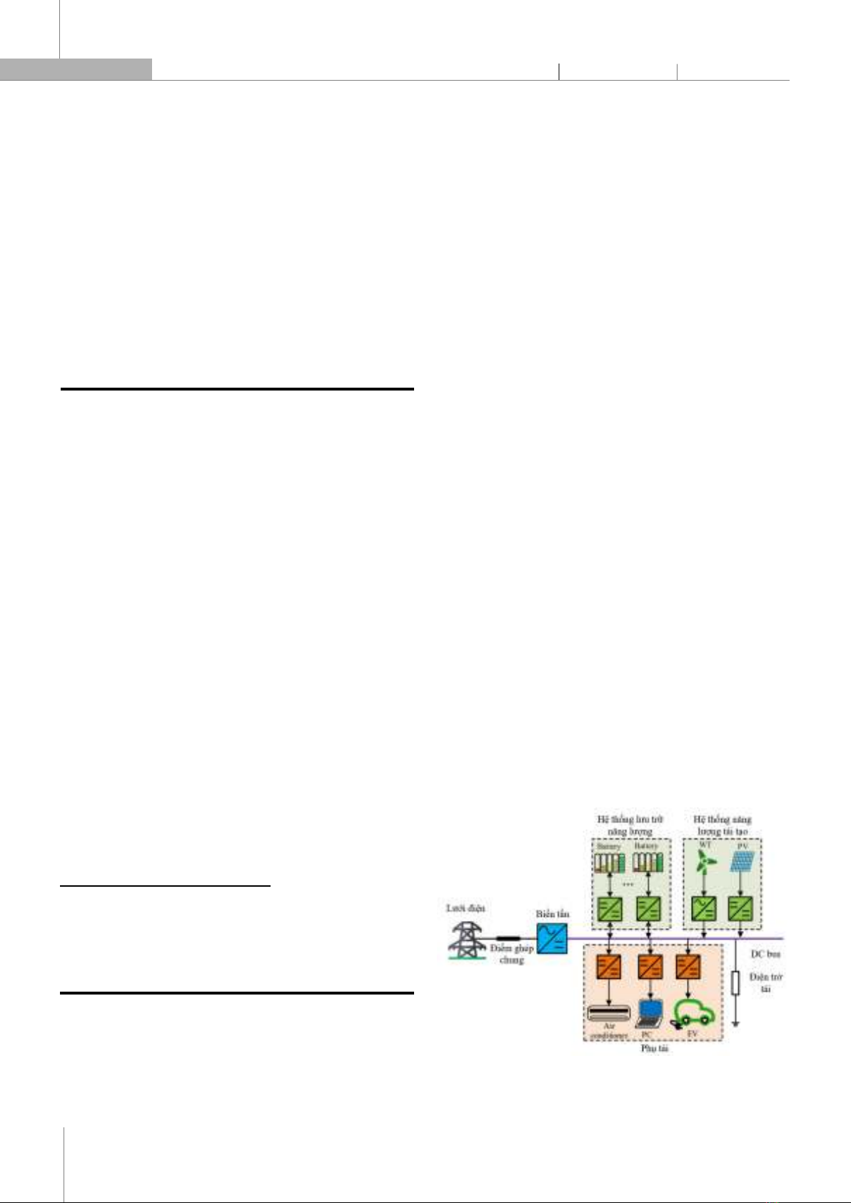 droop control. 1Khoa Kỹ thuật điện, Trường Đại học Điện lực *Email: thaoptp@epu.edu.vn Ngày nhận bài: 25/6/2024 Ngày nhận bài sửa sau phản biện: 05/8/2024 Ngày chấp nhận đăng: 27/8/2024 1. ĐẶT VẤN ĐỀ Lưới điện siêu nhỏ một chiều DCMG đơn giản hơn nhiều so với lưới điện siêu nhỏ AC [1], do bỏ qua bước chuyển đổi năng lượng cũng như những khó khăn trong việc điều khiển như: sóng hài, tần số và công suất phản kháng. Do đó, lưới điện DCMG đang ngày càng thu hút được sự quan tâm [2]. Dựa trên liên kết truyền thông, có ba phương pháp điều khiển lưới điện siêu nhỏ khác nhau, đó là điều khiển tập trung, điều khiển phân tán và điều khiển phi tập trung. Kỹ thuật điều khiển phân tán nổi bật trong số các phương pháp này vì không bị ảnh hưởng của các sai số cục bộ và có sự ổn định của toàn bộ hệ thống [3, 4]. Ngoài ra, tải công suất không đổi (CPL) là tải có công suất không đổi khi điện áp hoặc dòng điện thay đổi, như động cơ điện, bộ truyền động và bộ chuyển đổi điện tử công suất phải được điều khiển sao cho công suất đầu ra không đổi. CPL làm cho hệ thống phi tuyến, dẫn đến mất cân bằng công suất và hệ thống không ổn định [5]. Bài báo trình bày phương pháp điều khiển DCMG phân tán dựa trên phương pháp kiểm soát độ sụt V2 - P để đạt được cân bằng công suất và điều chỉnh điện áp với phụ tải điện không đổi ở cả chế độ nối lưới và chế độ độc lập. Hiệu quả và độ tin cậy của phương pháp đề xuất được chứng minh bằng kết quả mô phỏng. Hình 1. Cấu trúc lưới điện DCMG