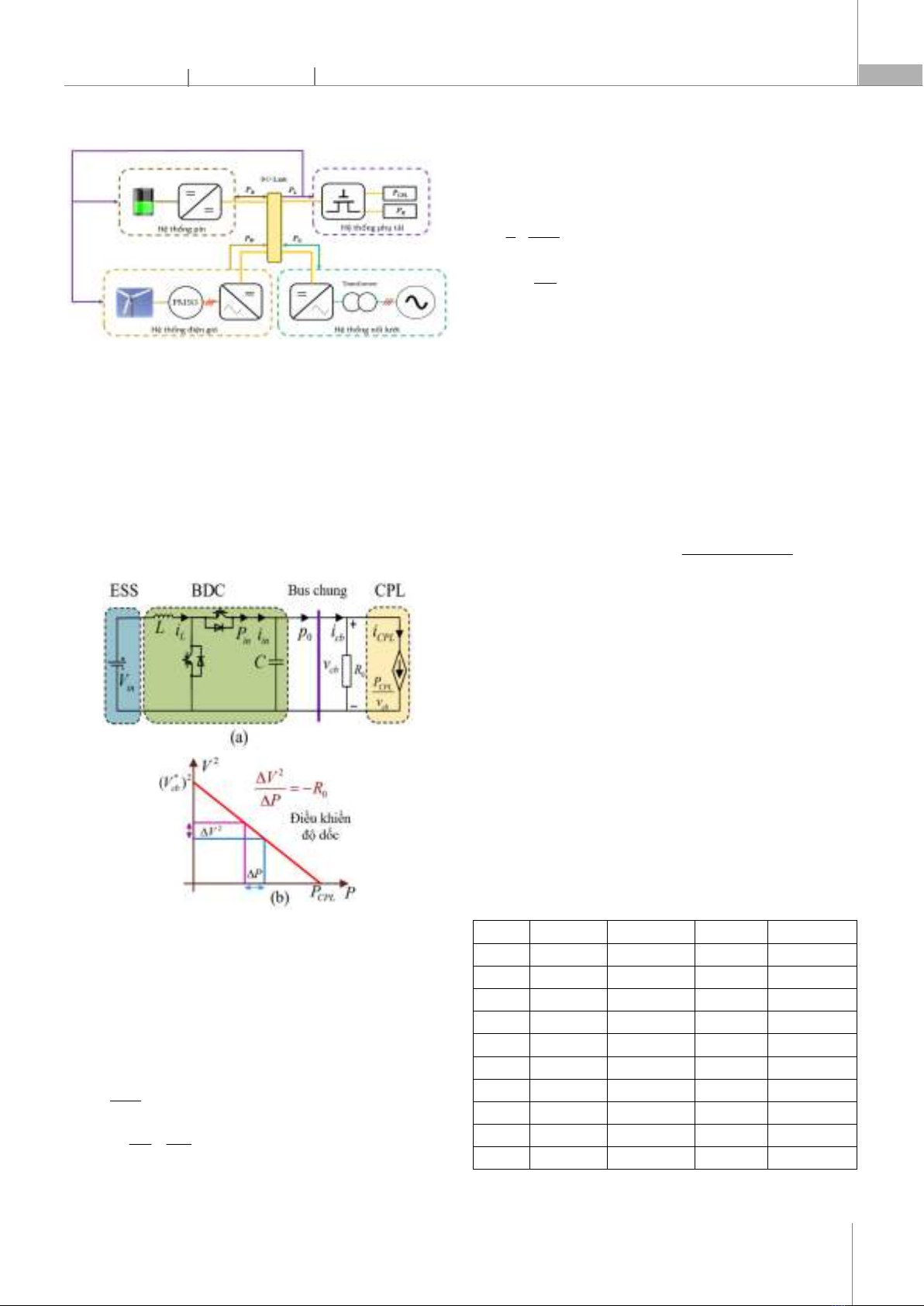 2. CẤU TRÚC HỆ THỐNG DCMG Hình 2. Cấu trúc mạng DCMG phân tán Cấu trúc của mạng DCMG phân tán được đề xuất trong hình 2 với bốn thành phần: pin, tải, tuabin điện gió và nối lưới. Trong sơ đồ đề xuất này, dữ liệu công suất của tải được đưa đến tuabin gió và hệ thống pin dự phòng và chỉ cần có hai liên kết truyền thông là đủ để đảm bảo điều chỉnh điện áp và cân bằng điện năng, giúp giảm đáng kể giá thành hệ thống. 3. KIỂM SOÁT LƯỚI ĐIỆN DCMG PHÂN TÁN Phương pháp độ dốc V2 - P Hình 3. Sơ đồ điều khiển độ sụt Một bộ chuyển đổi DC-DC hai chiều (BDC) đơn giản hóa điển hình được thể hiện trong hình 3 (a), hệ thống lưu trữ năng lượng (ESS) cung cấp nguồn điện một chiều thông qua BDC đến CPL và tải điện trở. Mối quan hệ động giữa điện áp bus chung vcb và dòng điện đầu ra icb có thể được biểu diễn như sau: cb