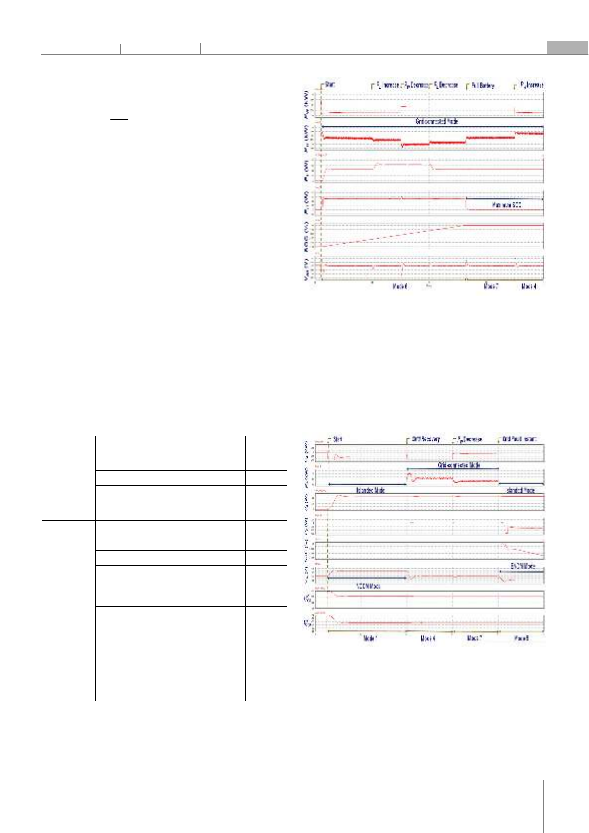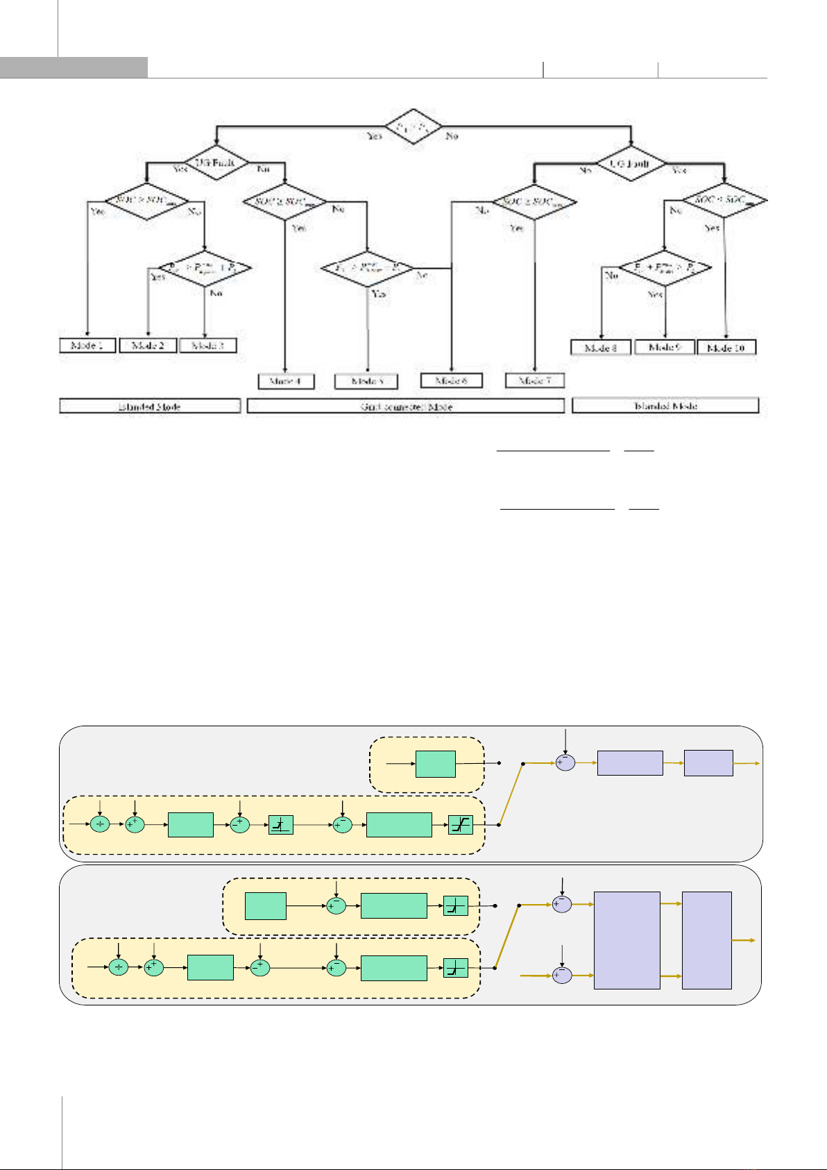 là điện áp bus chung lớn nhất và nhỏ nhất, giá trị công suất xả và sạc tối đa. Hình 3 (b) cho thấy, các đặc tính tuyến tính của bộ điều khiển độ dốc V2 - P với CPL. Phương pháp điều khiển đề xuất của hệ thống DCMG phân tán dựa trên phương pháp điều khiển độ dốc V2 - P thể hiện trên hình 4. Với các chế độ hoạt động trong bảng 1. Dựa trên mối quan hệ giữa công suất của điện gió, tải yêu cầu, trạng thái sạc của pin (SOCB) và tính khả dụng của lưới điện, mười chế độ hoạt động đặt ra để duy trì quản lý công suất và ổn định điện. Bảng 1. Các chế độ hoạt động của lưới điện phân tán DCMG Chế độ Điện gió Pin lưu trữ Nối lưới Tải 1 VDCM IDLE Fault NOR/REC 2 VDCM BCCMchar Fault NOR/REC 3 MPPT BVDMchar Fault NOR/REC 4 VCM IDLE GVCMinv NOR/REC 5 MPPT BCCMchar GVCMinv NOR/REC 6 MPPT BCCMchar GVCMcon NOR/REC 7 MPPT IDLE GVCMcon NOR/REC 8 VCM BVDMdis Fault SHED 9 MPPT BVDMdis Fault NOR/ SHED 10 MPPT IDLE Fault SHED