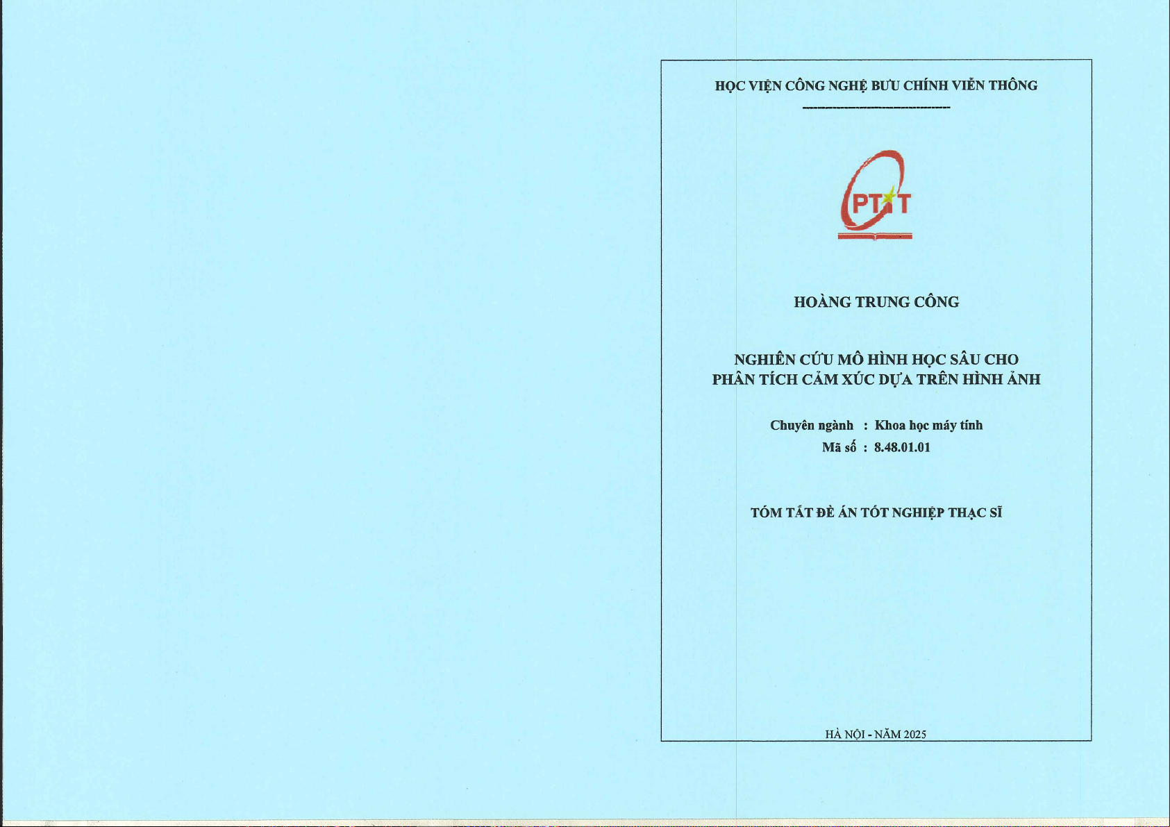 Nghiên cứu này tập trung phát triển một mô hình học sâu cho phân tích cảm xúc dựa trên hình ảnh, nhằm hỗ trợ giáo viên theo dõi và hiểu rõ hơn về trạng thái cảm xúc của học sinh trong môi trường học đường tại Việt Nam. Mục tiêu chính là nghiên cứu và đánh giá các kiến trúc học sâu tiên tiến như Mạng nơ-ron tích chập (CNN) để xác định mô hình tối ưu cho việc phân tích cảm xúc qua khuôn mặt, đồng thời đảm bảo hiệu quả về độ chính xác, tốc độ xử lý và khả năng tổng quát hóa phù hợp với điều kiện thực tế. Phương pháp nghiên cứu bao gồm việc tổng hợp các công trình khoa học liên quan, xây dựng và tối ưu hóa mô hình CNN kết hợp kỹ thuật Haar Cascade để nhận diện bảy cảm xúc cơ bản (vui vẻ, buồn bã, tức giận, ngạc nhiên, sợ hãi, ghê tởm, trung lập) từ hình ảnh khuôn mặt. Các thử nghiệm được thực hiện trên hai bộ dữ liệu quốc tế tiêu chuẩn là FER2013 và CK+, đánh giá hiệu suất mô hình thông qua các chỉ số như độ chính xác (accuracy), độ bao phủ (recall) và F1-score. Kết quả đạt được cho thấy mô hình có khả năng nhận diện 7 trạng thái cảm xúc với độ chính xác từ 68% đến 74% và đạt tốc độ xử lý dưới 50ms mỗi khung hình, đáp ứng yêu cầu thời gian thực. Mô hình cũng áp dụng các kỹ thuật tiên tiến như tăng cường dữ liệu và BatchNormalization để cải thiện khả năng thích nghi. Tuy nhiên, nghiên cứu cũng chỉ ra những hạn chế như độ chính xác còn thấp hơn so với dữ liệu chuẩn quốc tế và sự nhầm lẫn giữa các cảm xúc tương đồng do yếu tố môi trường và văn hóa. Luận văn đề xuất các hướng nghiên cứu tiếp theo bao gồm xây dựng bộ dữ liệu nội địa, cải tiến kiến trúc mô hình, tối ưu hóa xử lý video thời gian thực và nghiên cứu biểu cảm văn hóa để nâng cao hiệu quả và tính ứng dụng của hệ thống trong giáo dục.