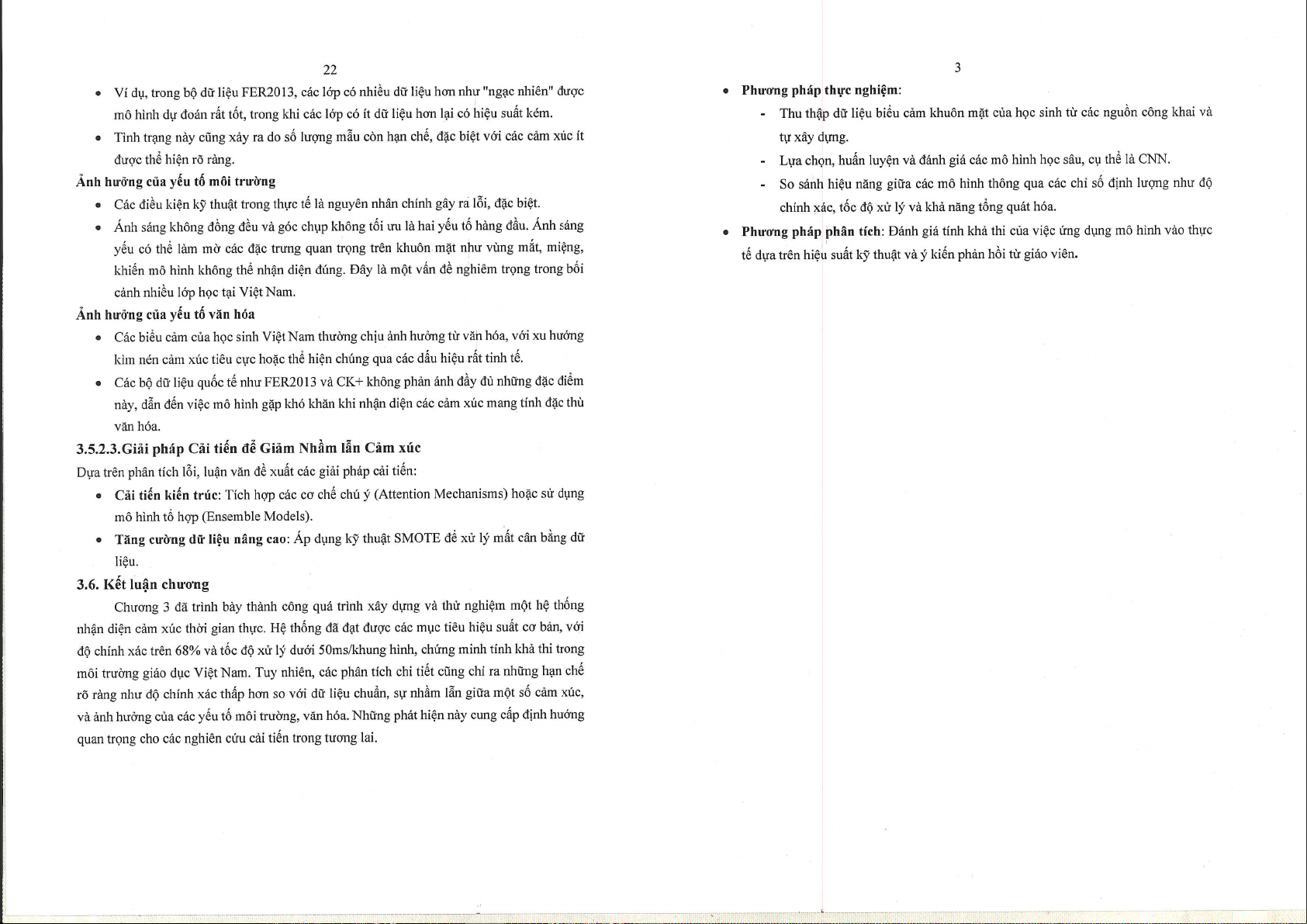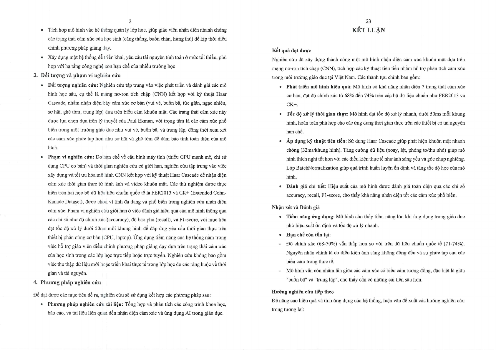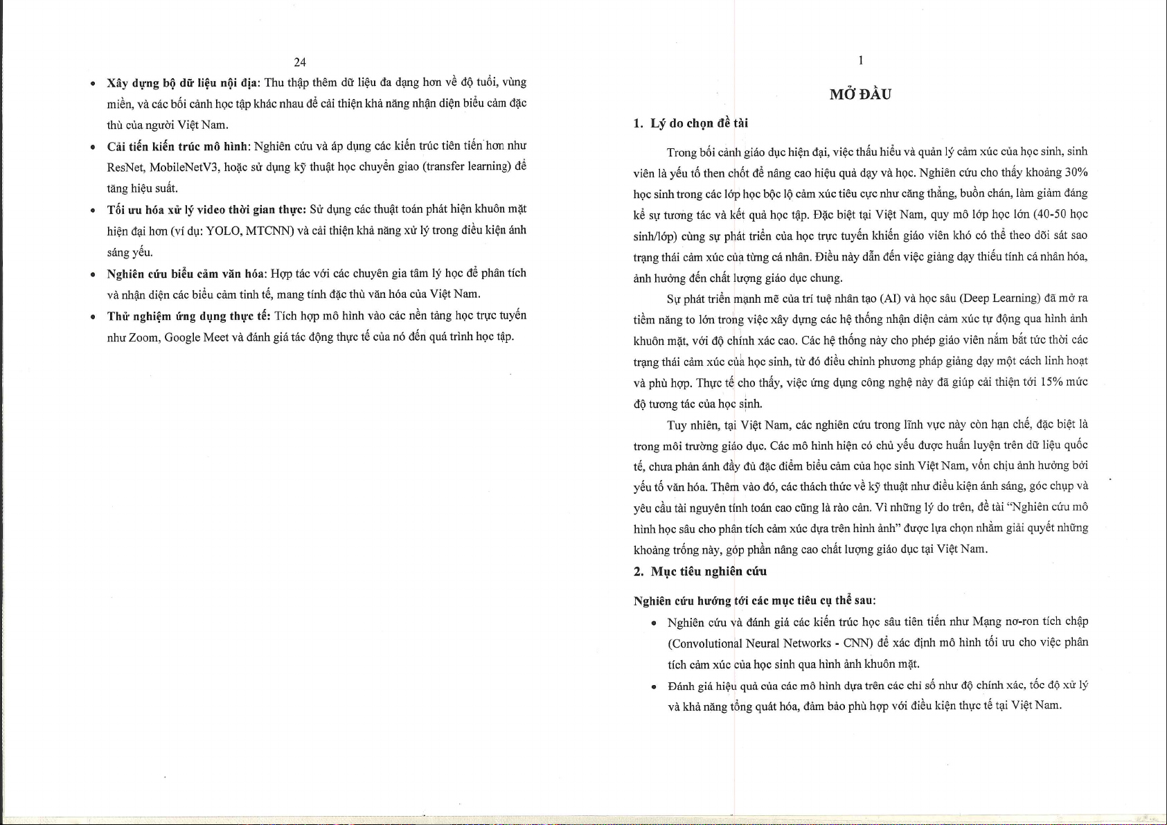 Trong bối cảnh giáo dục hiện đại, việc thấu hiểu và quản lý cảm xúc của học sinh là yếu tố then chốt để nâng cao hiệu quả dạy và học. Nghiên cứu chỉ ra rằng khoảng 30% học sinh bộc lộ cảm xúc tiêu cực, gây ảnh hưởng đến tương tác và kết quả học tập. Đặc biệt tại Việt Nam, quy mô lớp học lớn và sự phát triển của học trực tuyến càng khiến giáo viên khó theo dõi sát sao trạng thái cảm xúc của từng cá nhân, dẫn đến giảng dạy thiếu tính cá nhân hóa. Sự phát triển mạnh mẽ của trí tuệ nhân tạo (AI) và học sâu (Deep Learning) mở ra tiềm năng lớn trong việc xây dựng các hệ thống nhận diện cảm xúc tự động qua hình ảnh khuôn mặt, nhưng các nghiên cứu tại Việt Nam còn hạn chế và các mô hình hiện có chưa phản ánh đầy đủ đặc điểm biểu cảm văn hóa. Đề tài này nhằm giải quyết khoảng trống đó, góp phần nâng cao chất lượng giáo dục.