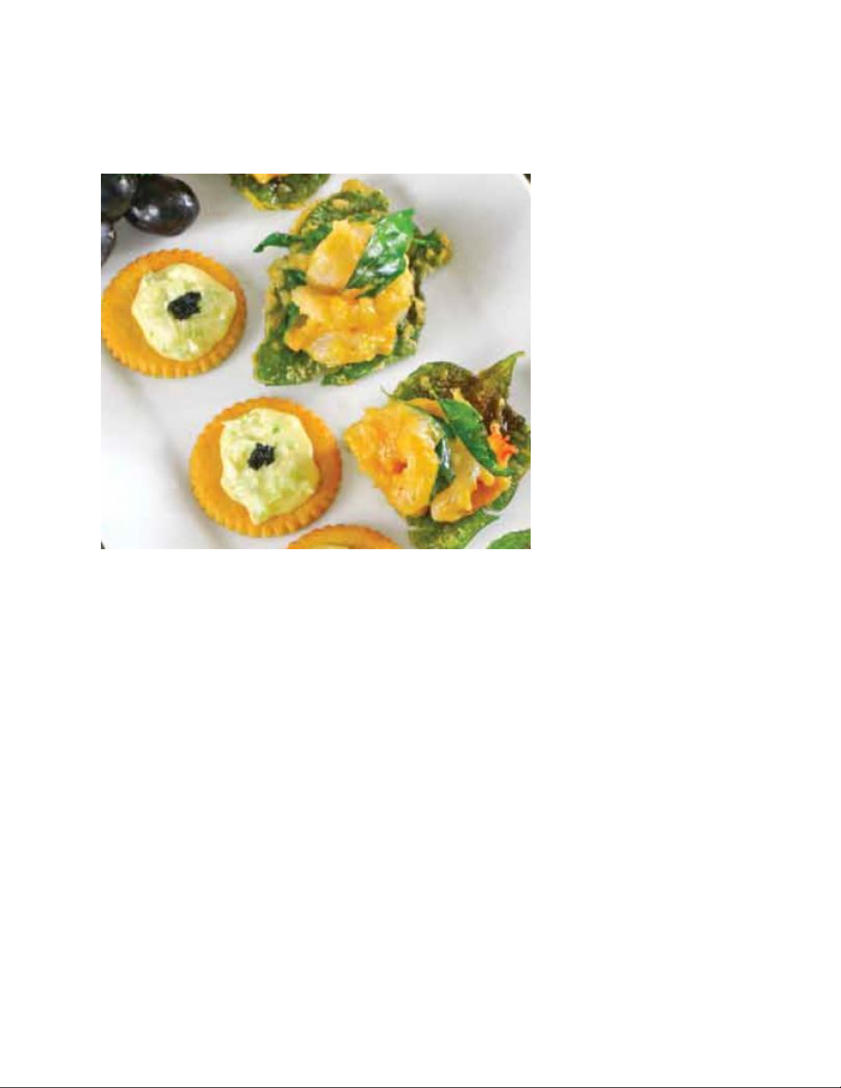 Cho tôm xốt chanh lên đĩa, đặt bánh quy lên, cho một phần lòng trắng trộn xốt mayonnaise lên, ăn kèm